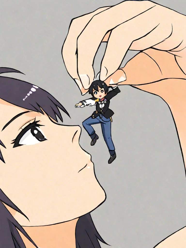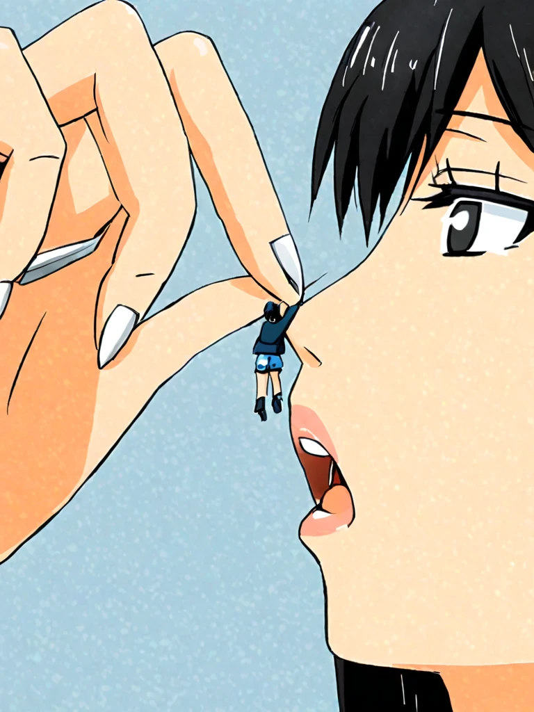 • looking at viewer, looking at tiny, looking at giantess