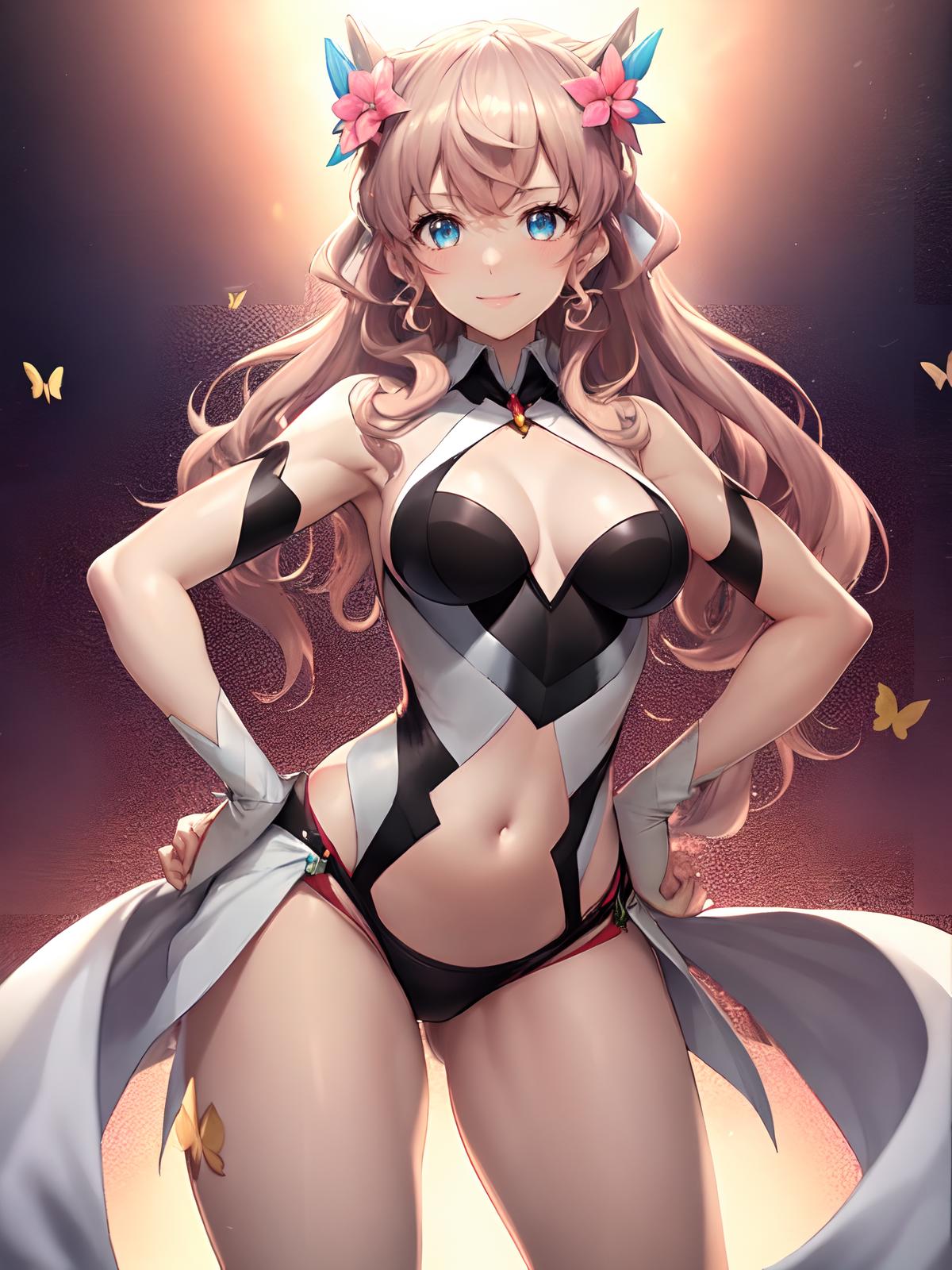 Prompts: hair flower,butterfly hair ornament,very long hair,hair ornament,blue eyes,large breast,pink hair,long hair