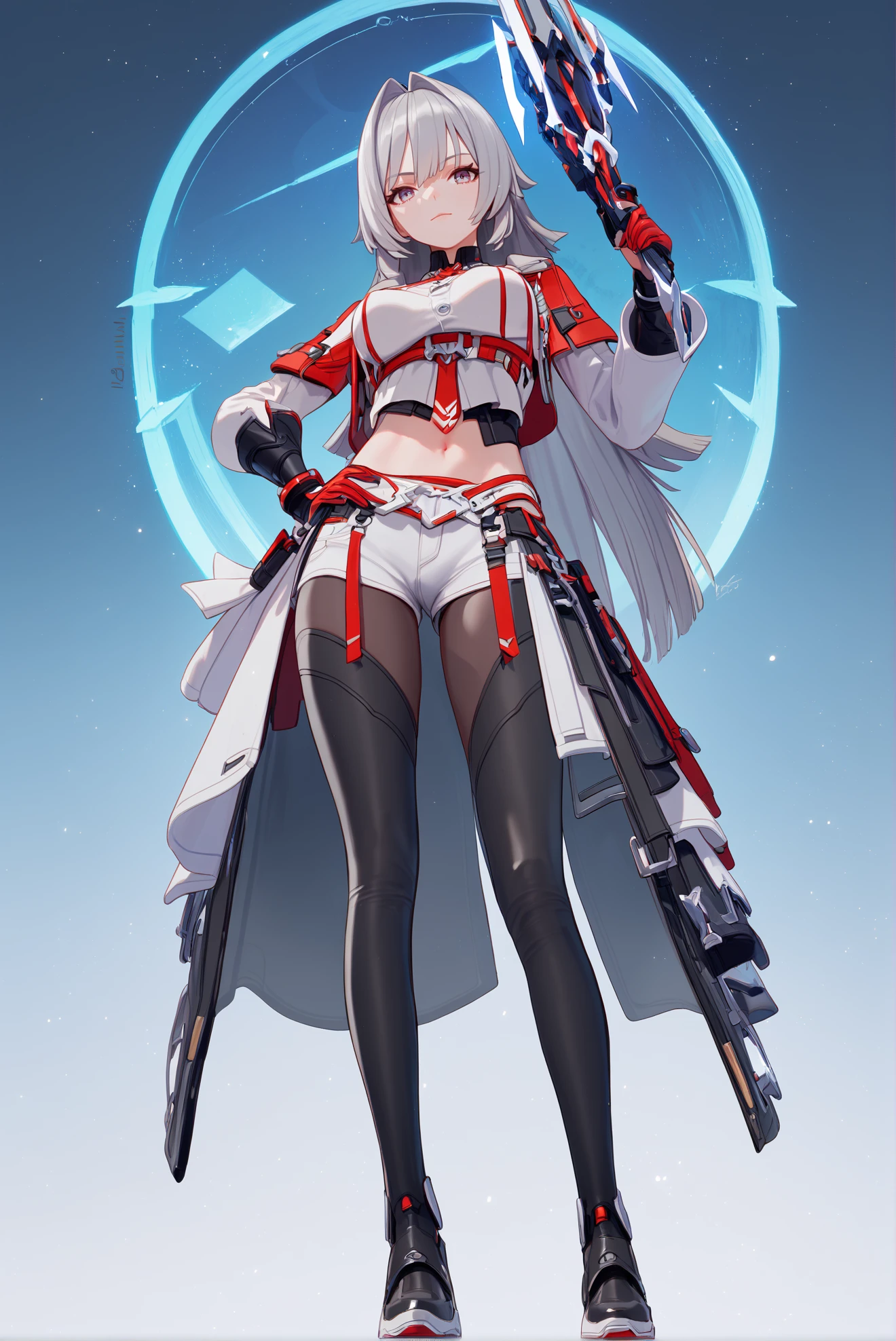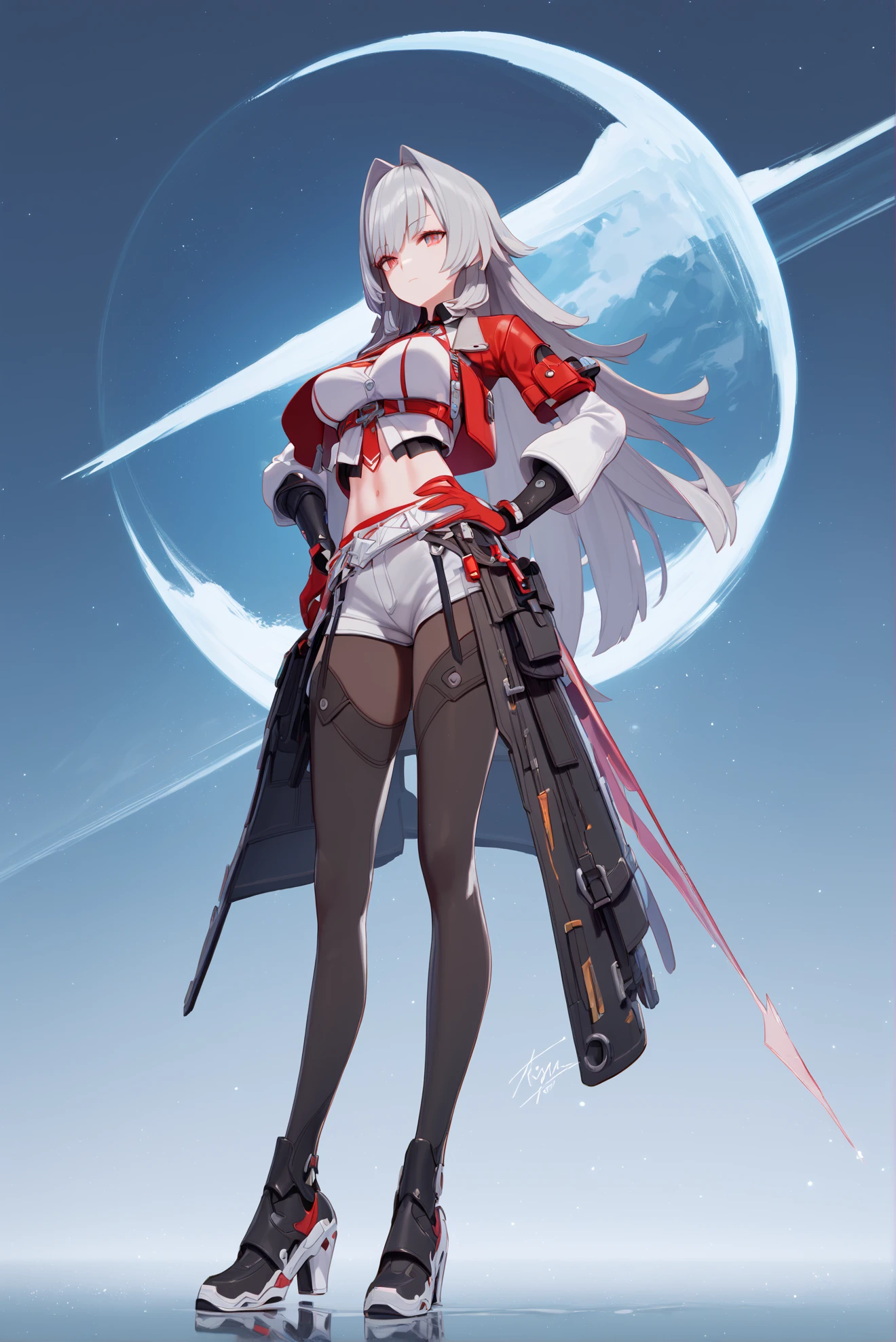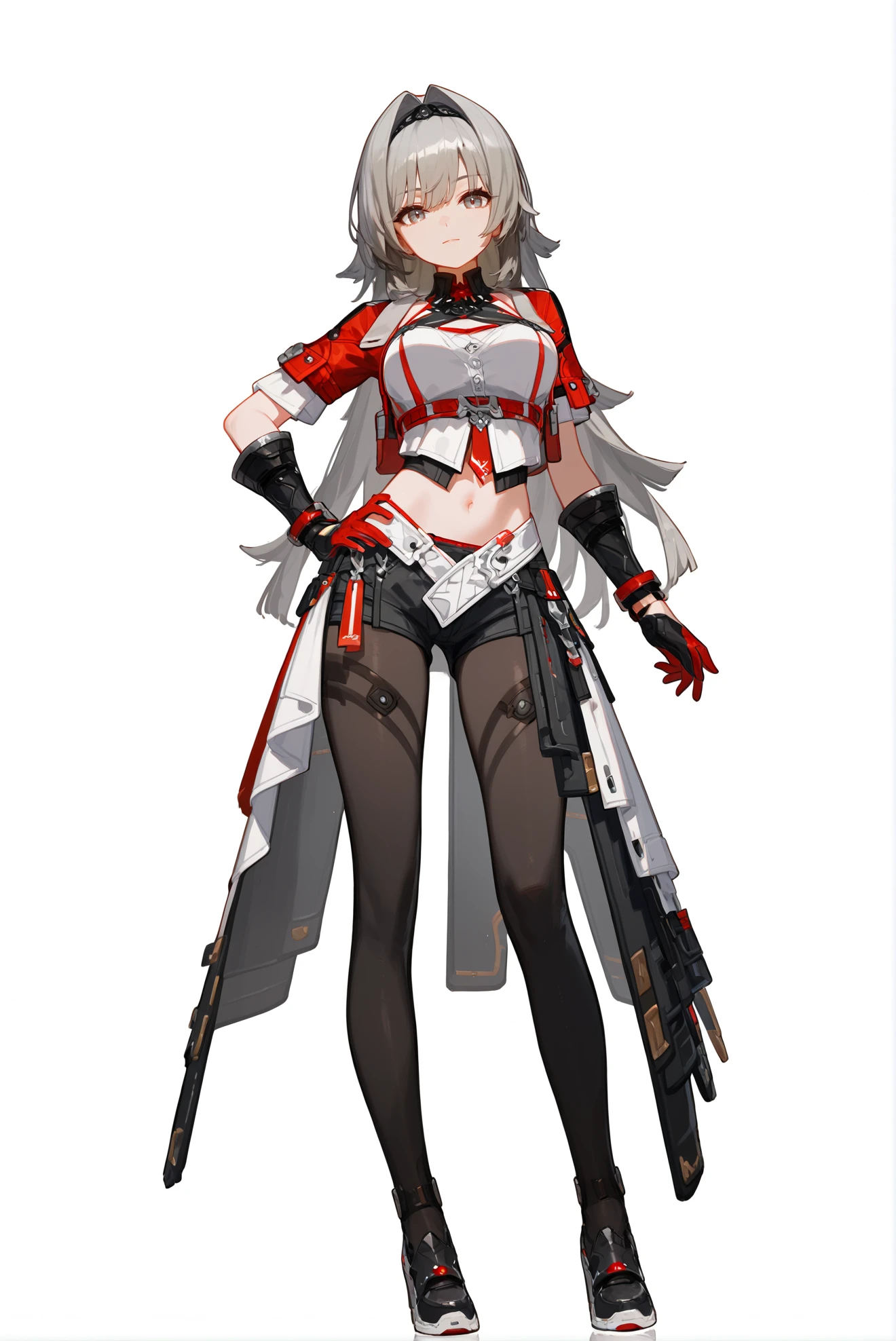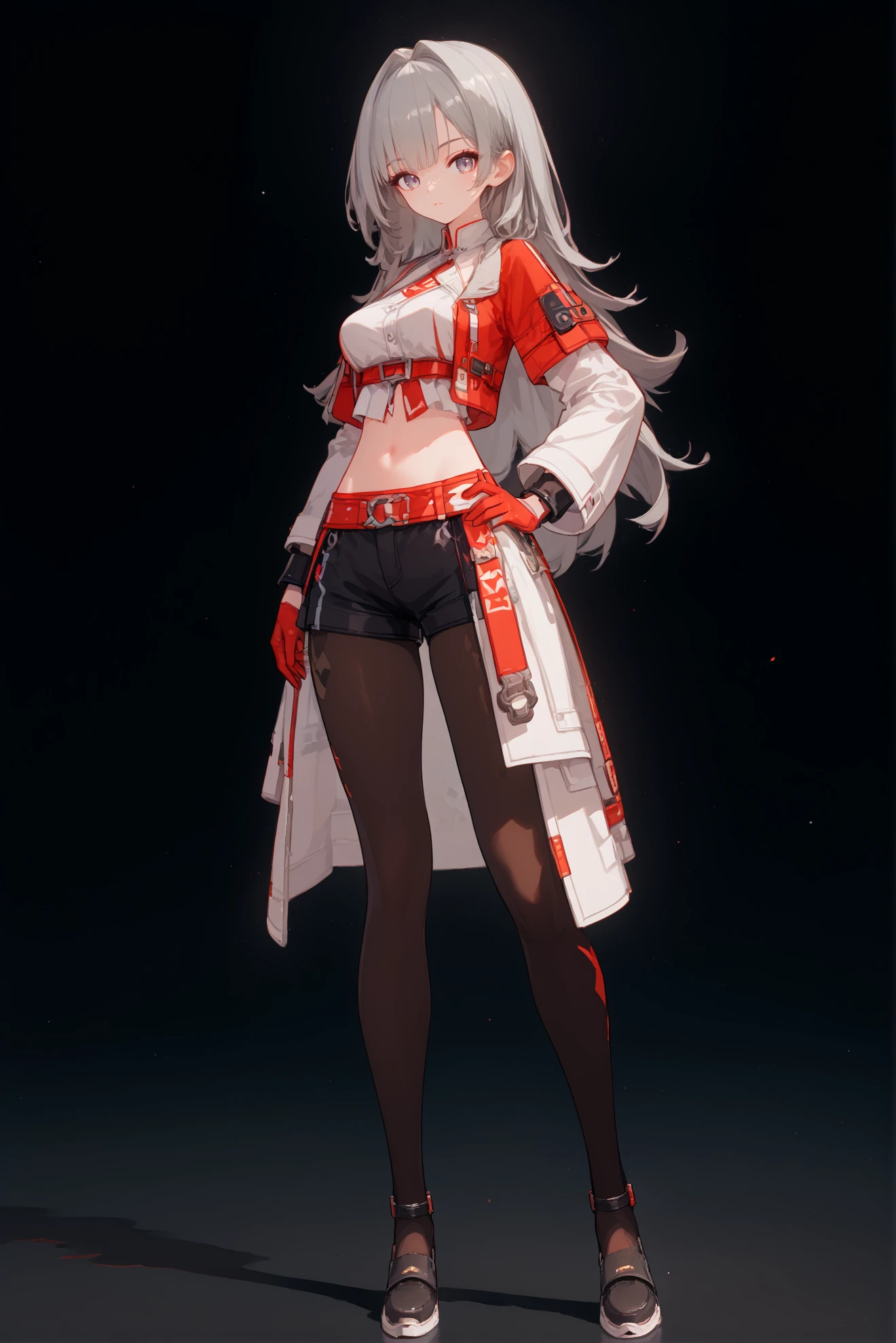 Helia, def clothes, 1girl, gloves, long hair, grey hair, navel, pantyhose, shorts, breasts,
