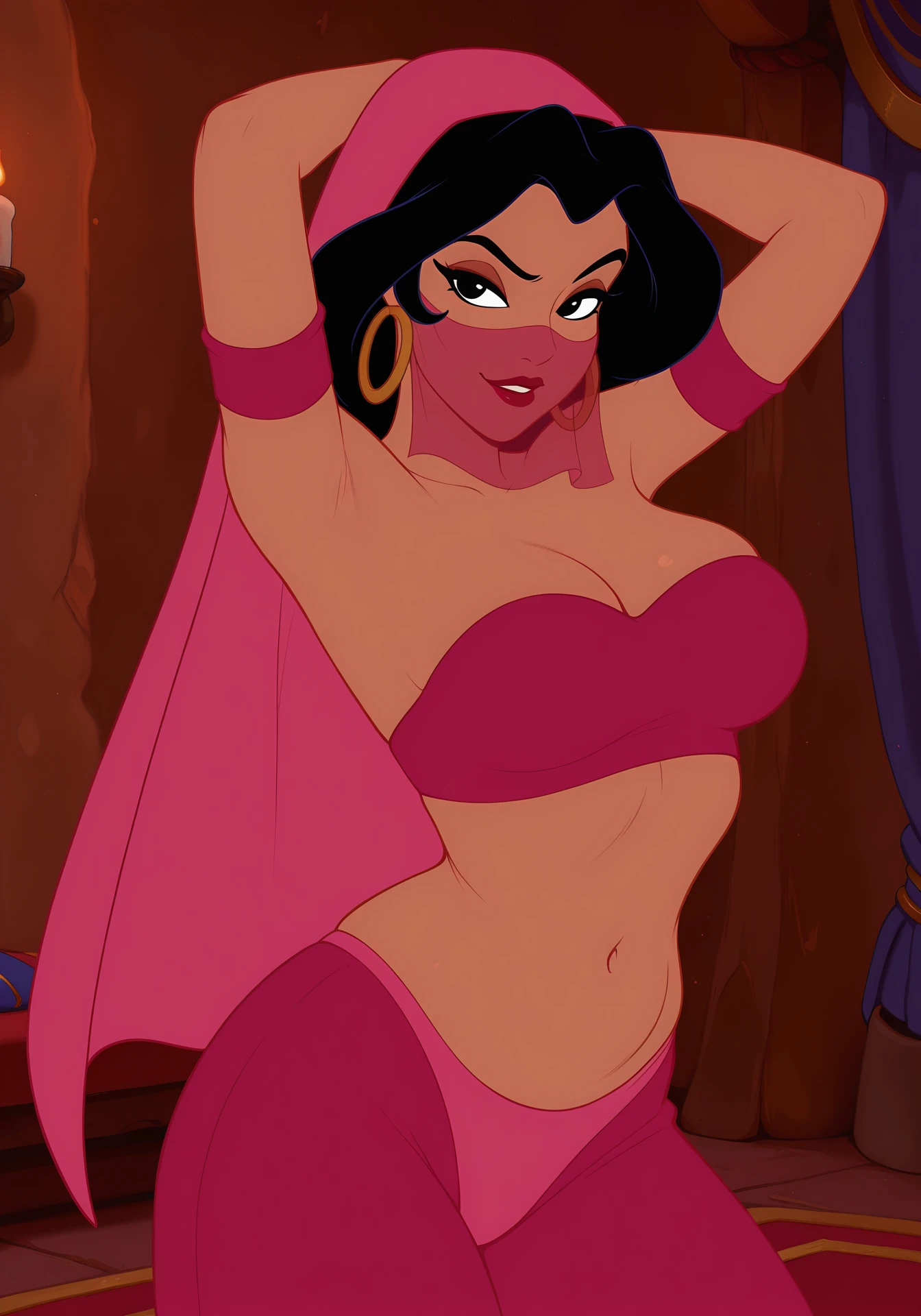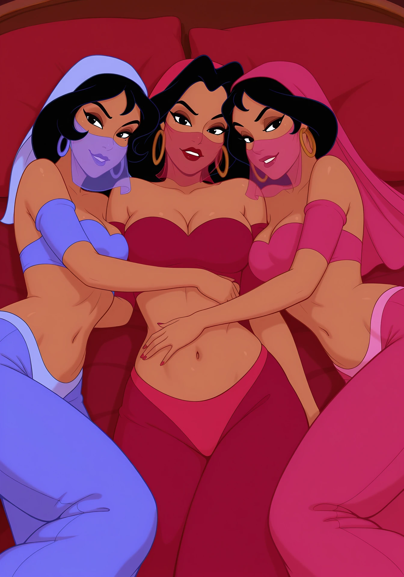 The Harem Girls are minor characters from the Aladdin franchise. The names of the Harem Girls are Naji, Taji, and Maji. Naji is the fuchsia one, Taji is the pink one, and Maji is the lavender one. They are a trio of brothel workers who reside in Agrabah.