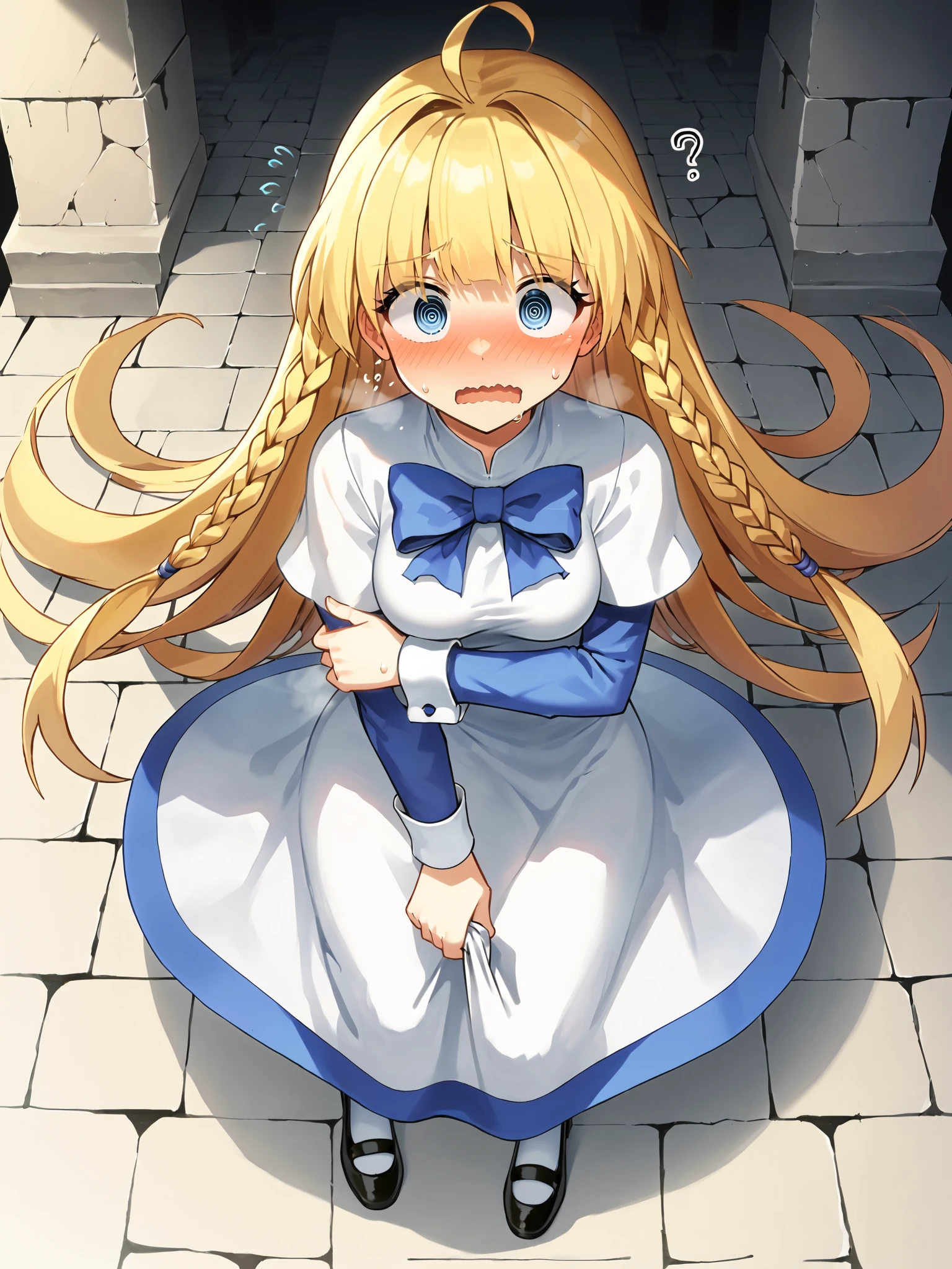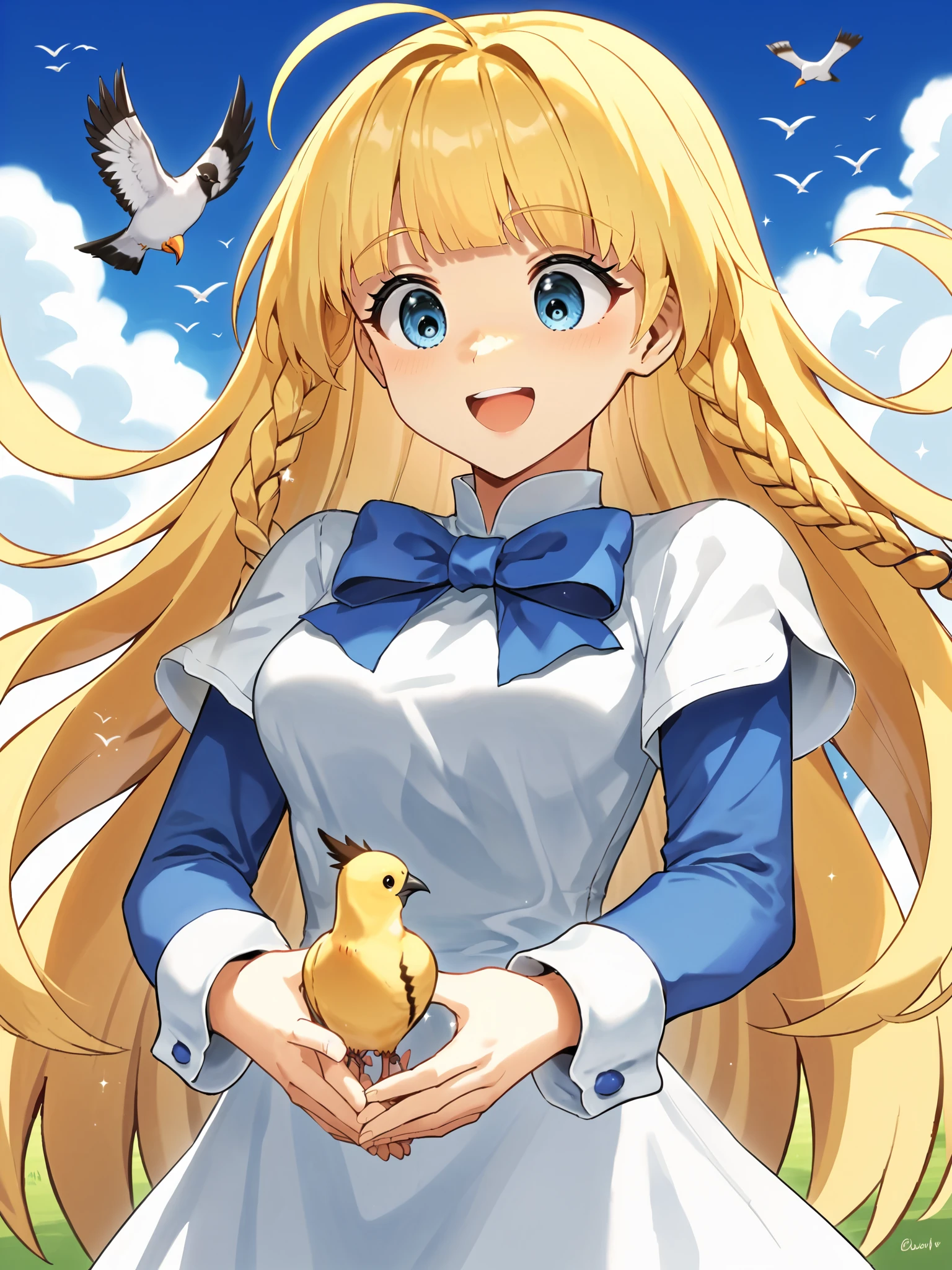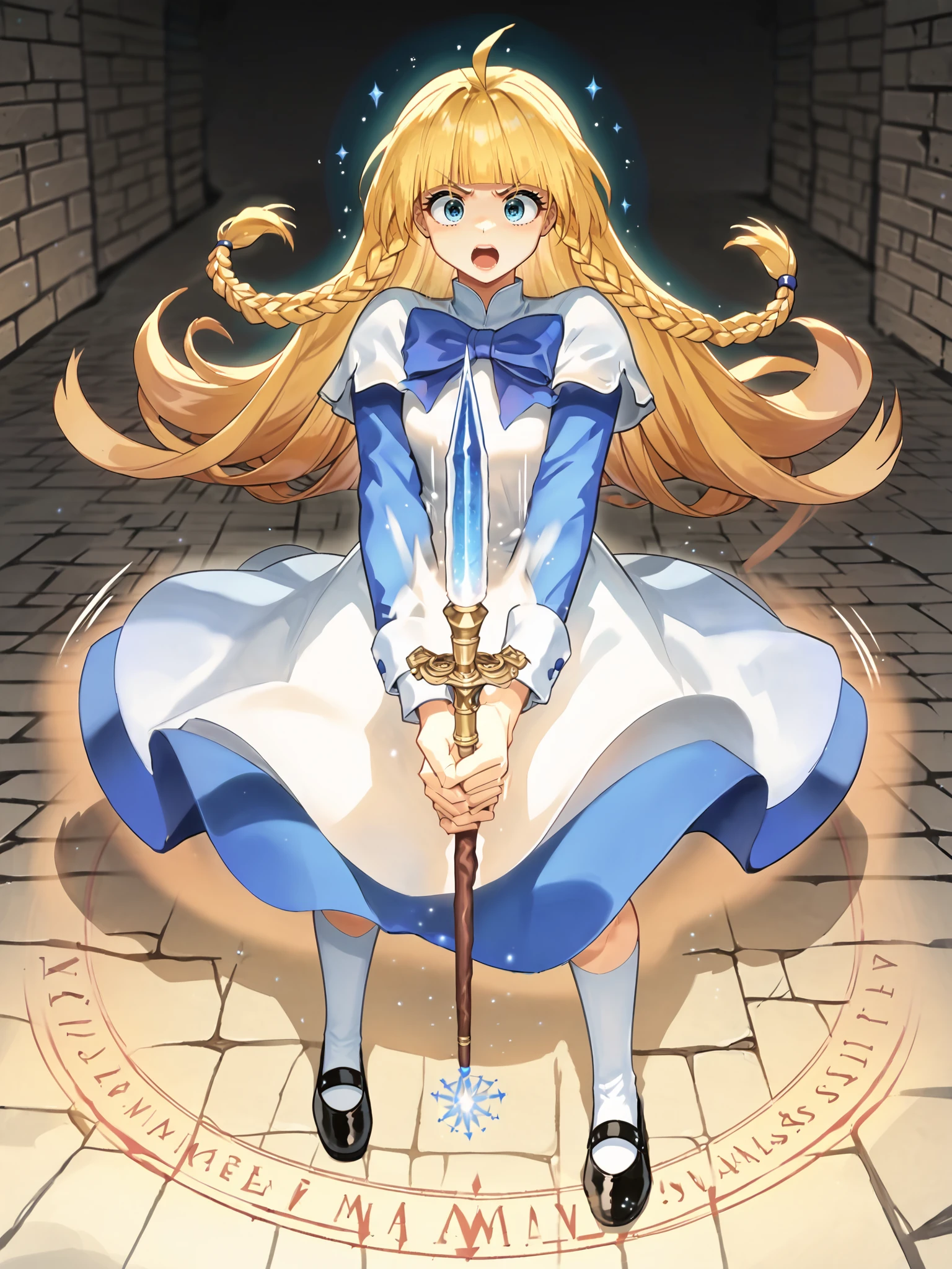 SD1.5: blonde hair, blunt bangs, ahoge, twin braids, very long hair, white dress over blue dress, blue hem, apron, white cuffs, long sleeves, short over long sleeves, kneehighs, white socks, black footwear, mary janes, blue eyes, blue bow,
