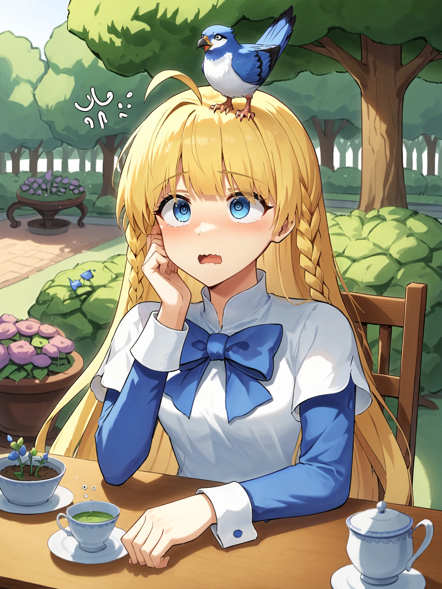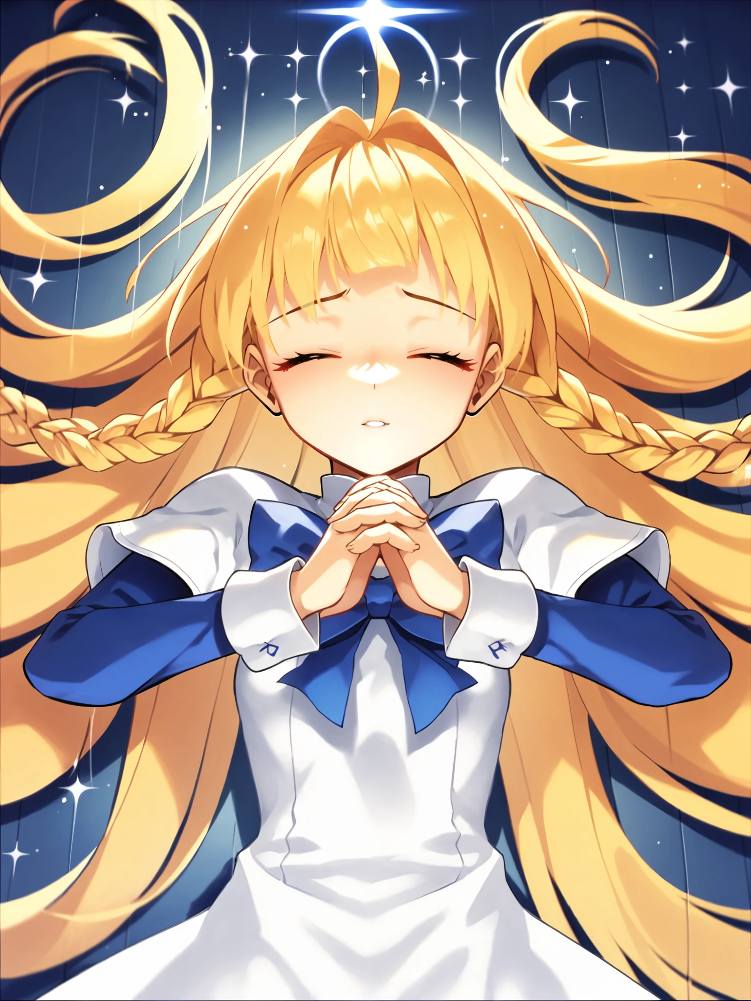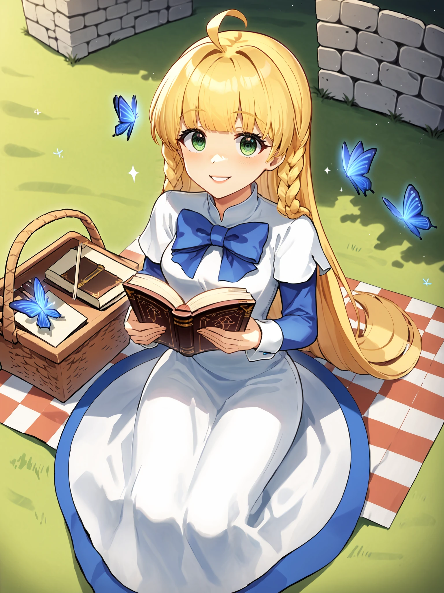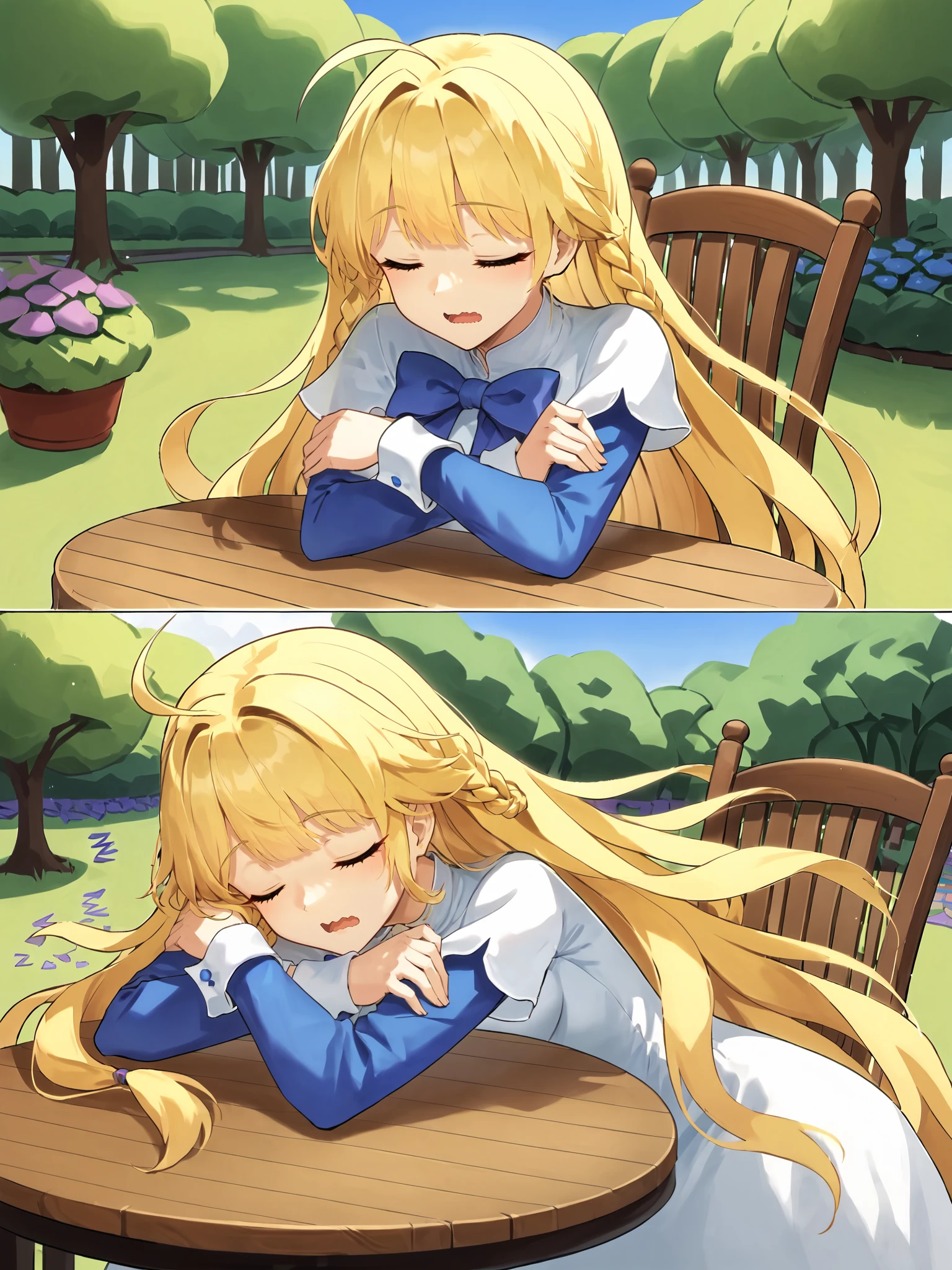 SD1.5: blonde hair, blunt bangs, ahoge, twin braids, very long hair, white dress over blue dress, blue hem, apron, white cuffs, long sleeves, short over long sleeves, kneehighs, white socks, black footwear, mary janes, blue eyes, blue bow,