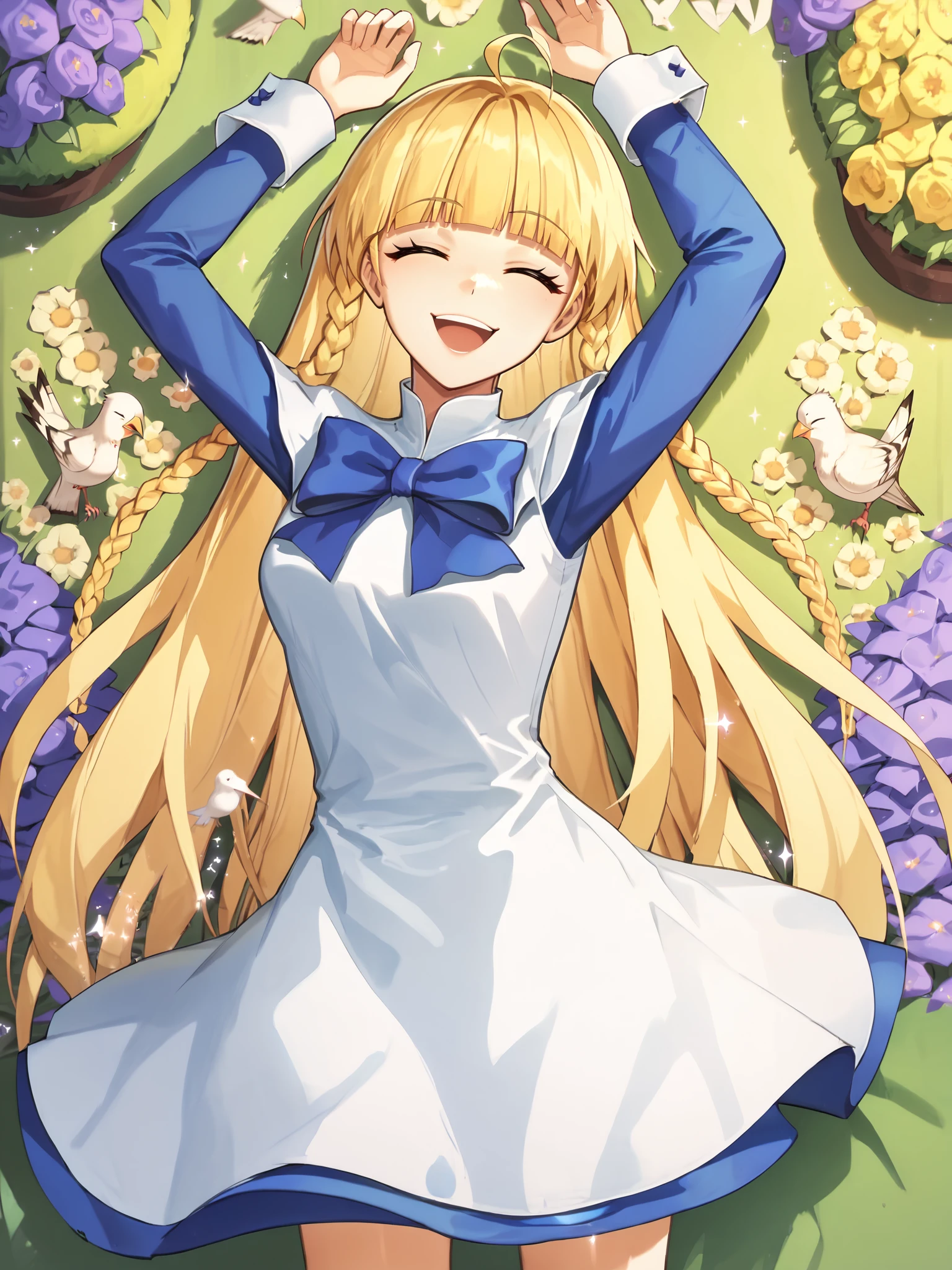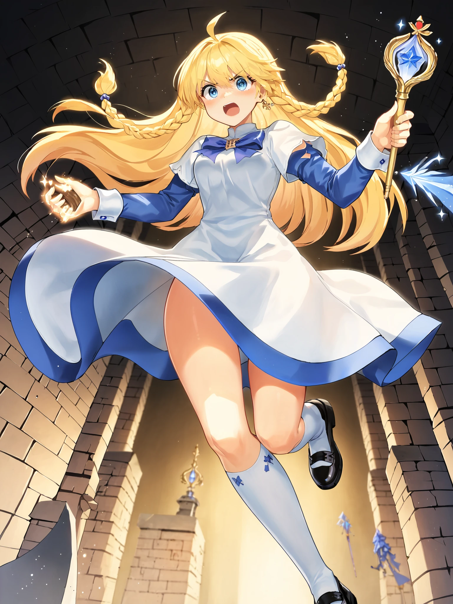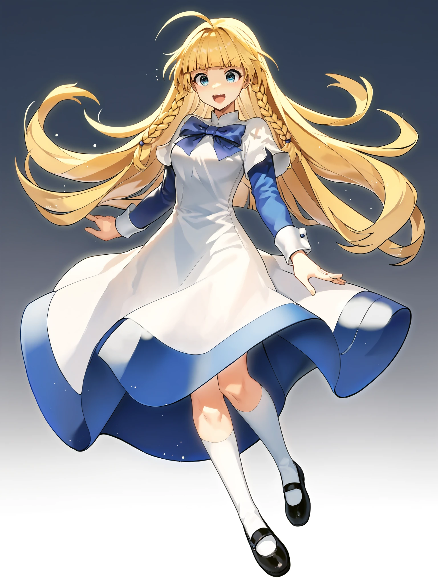 Pony: blonde hair, ahoge, twin braids, (very long hair), (white dress, long dress:1.5), (blue hem, blue petticoat:1.3), blue sleeves, white cuffs, long sleeves, short over long sleeves, blue bow, (blunt bangs:0.75), kneehighs, white socks, black footwear, mary janes,