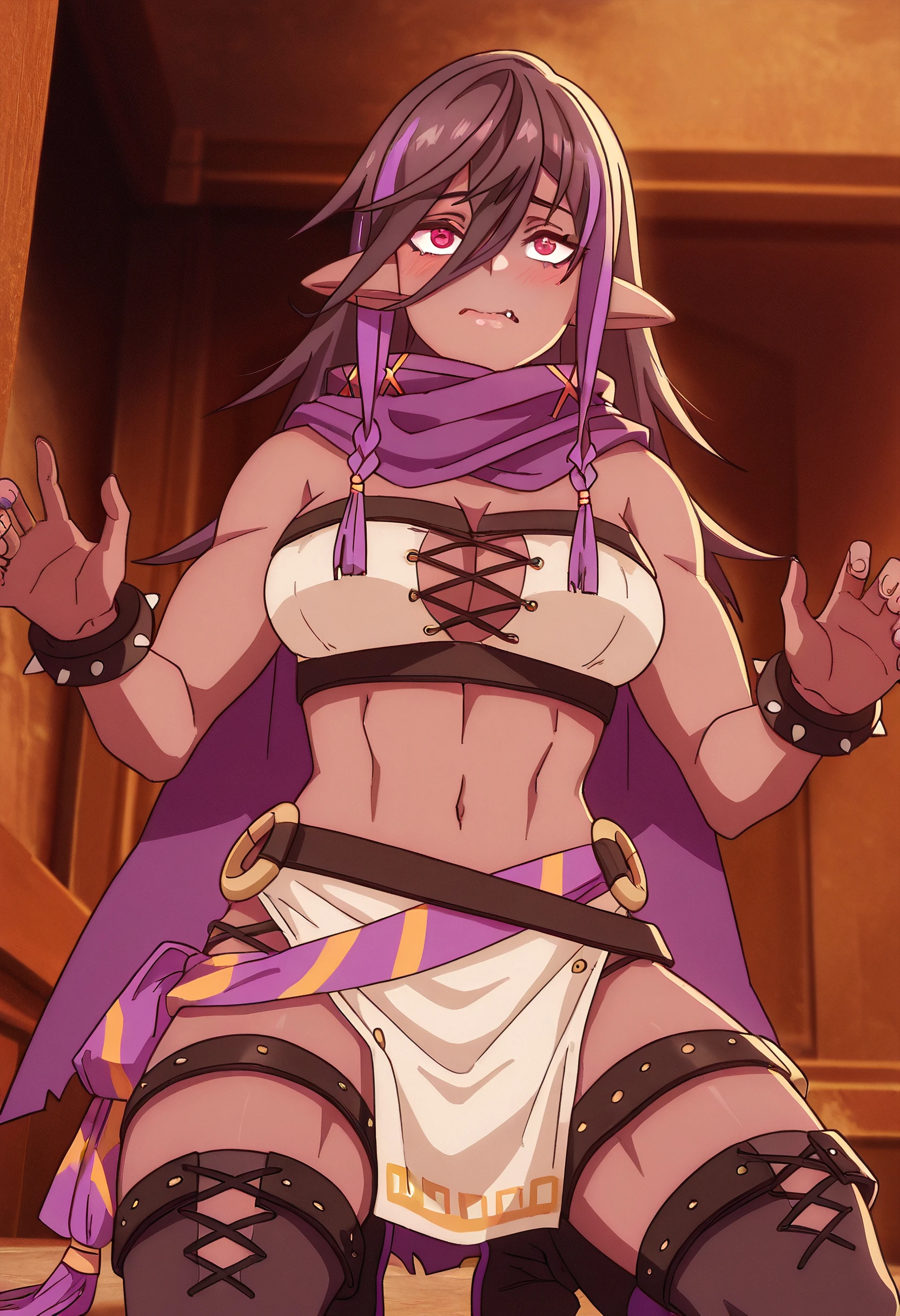 YHeLoewe, elf, long hair, black hair, pointy ears, multicolored hair, two-tone hair, muscular female, purple hair, hair between eyes, braid, red eyes, side braids, colored skin, twin braids, streaked hair, dark elf, dark skin, dark-skinned female, fang,