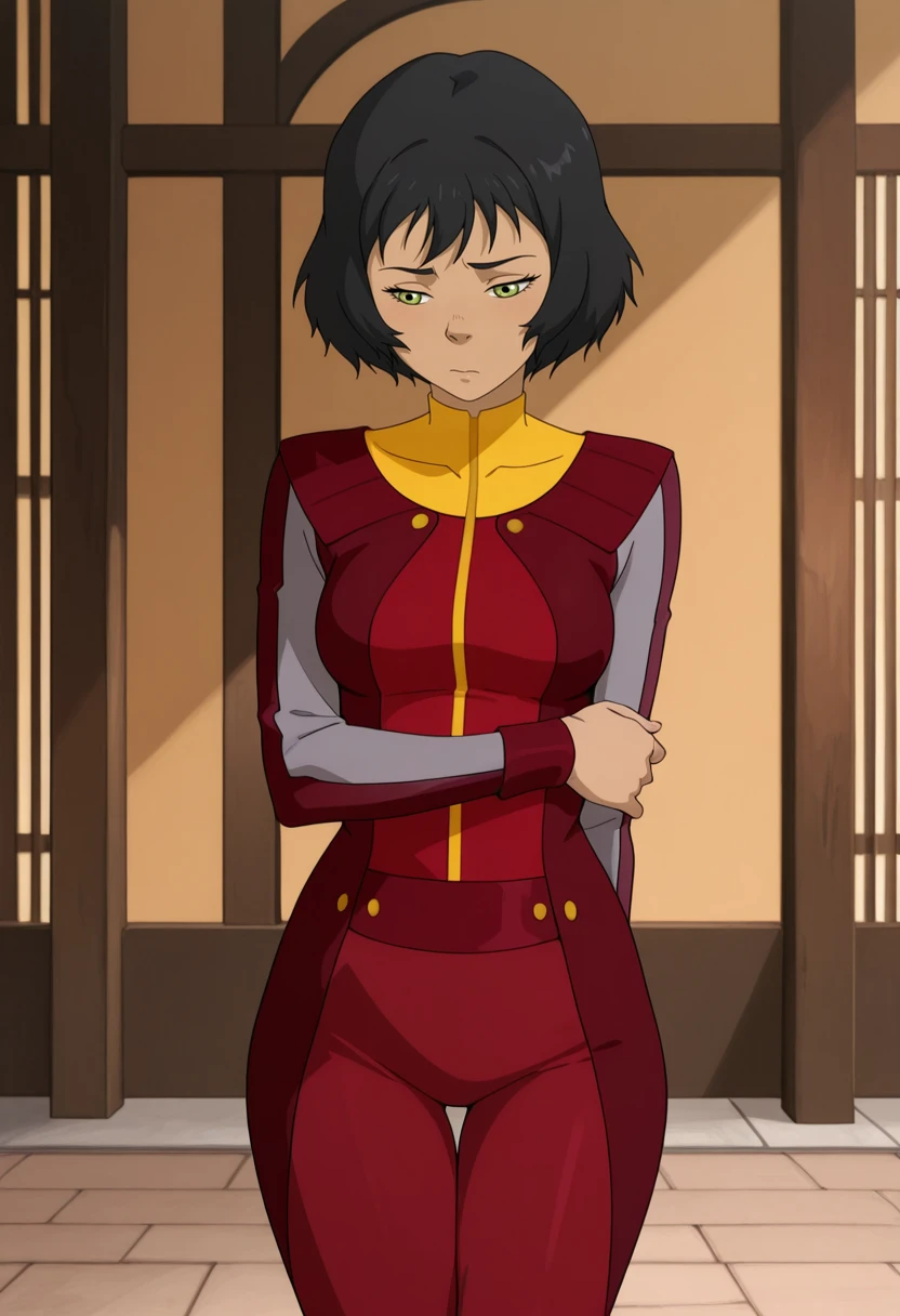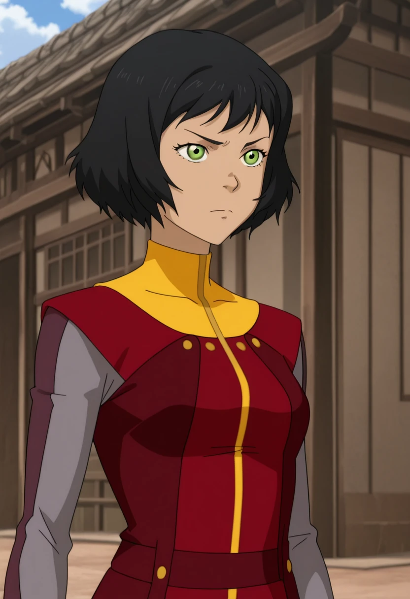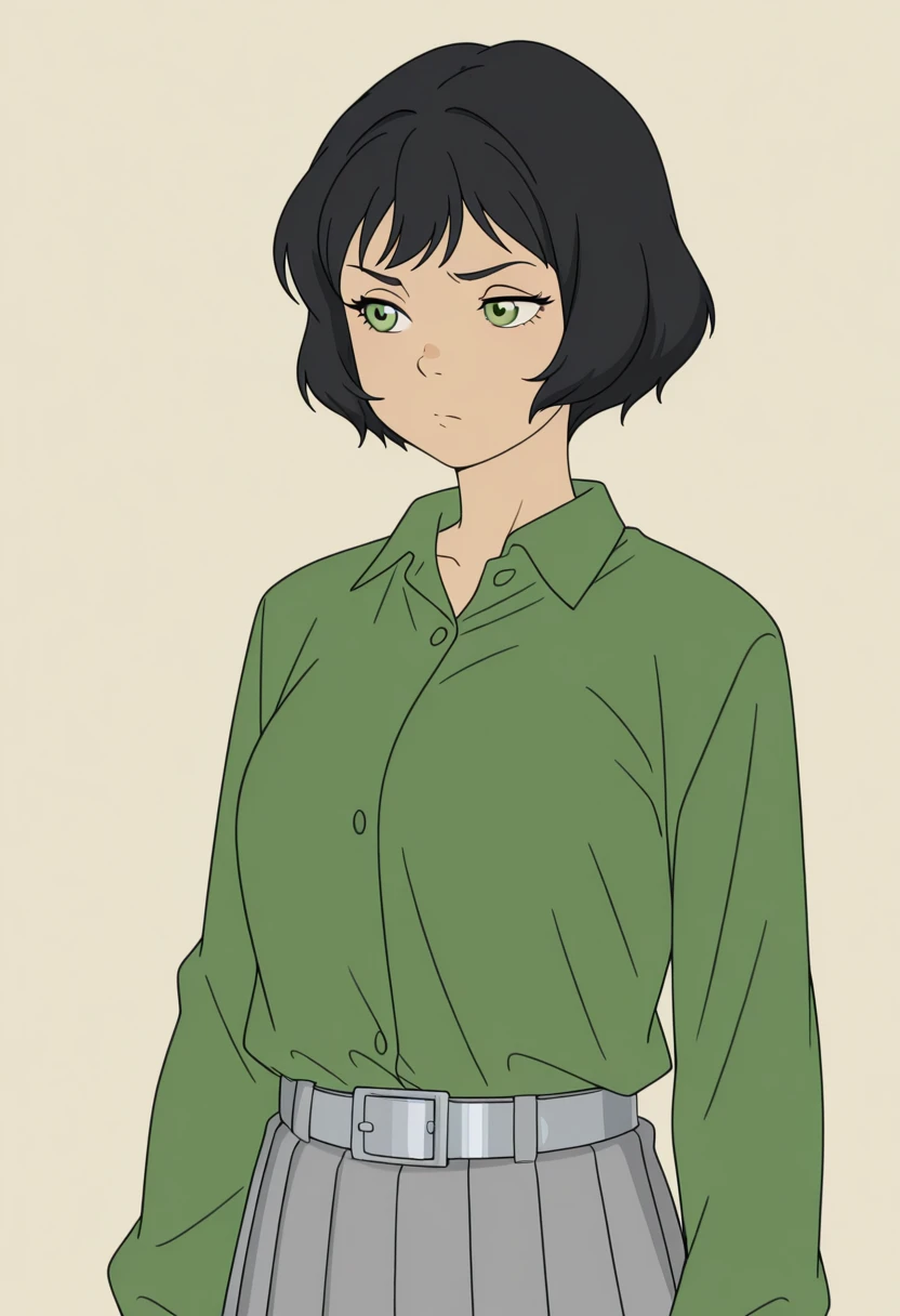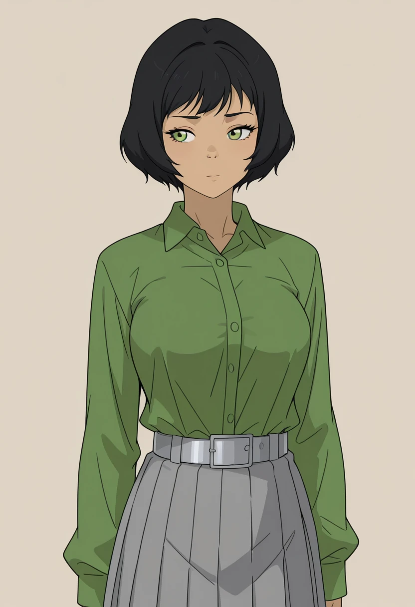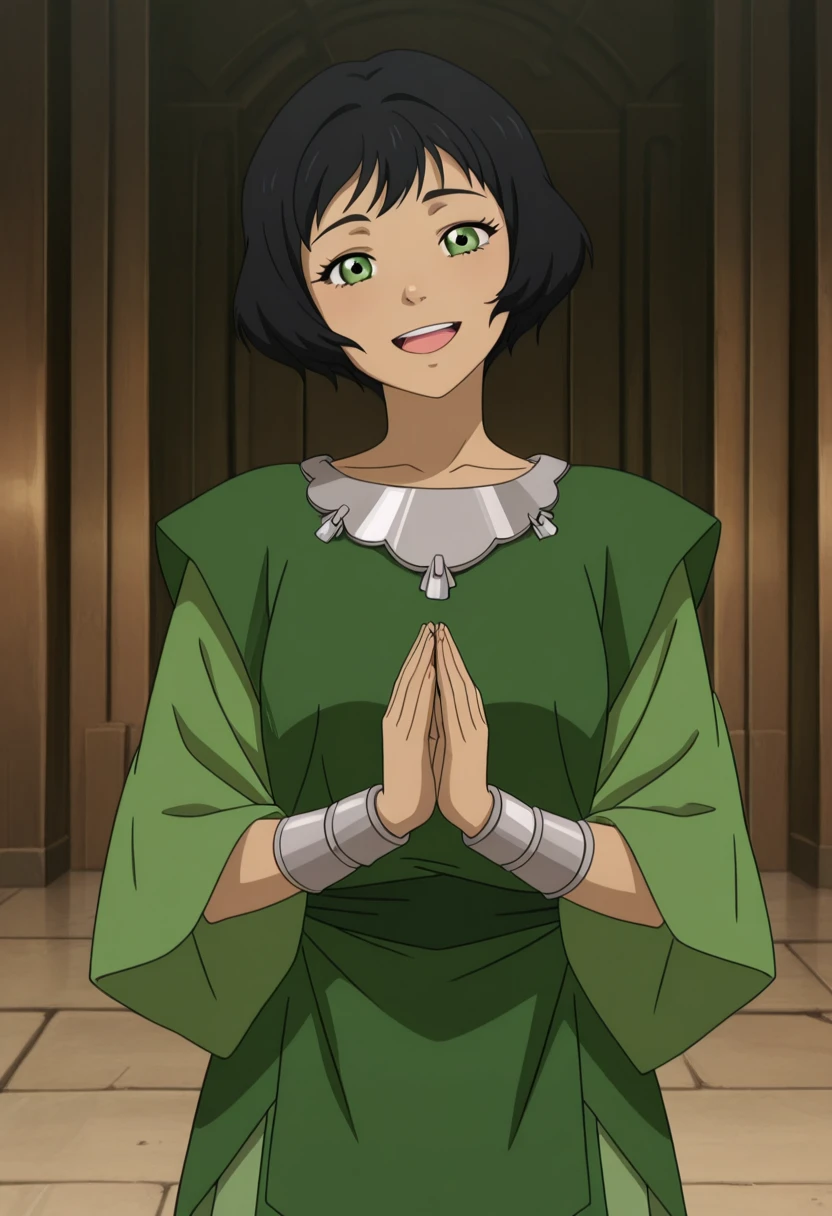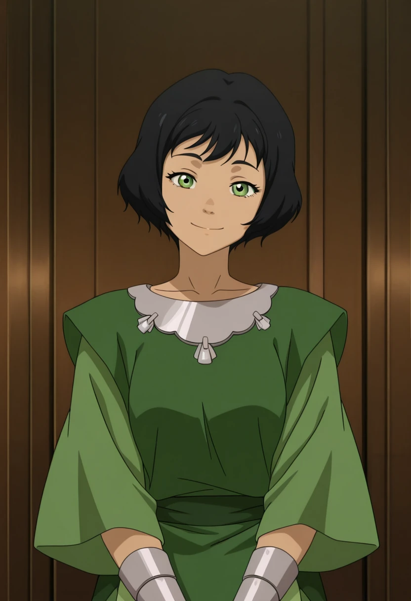 layered clothes, green tunic, wide sleves, metal necklace, metal armlet,
