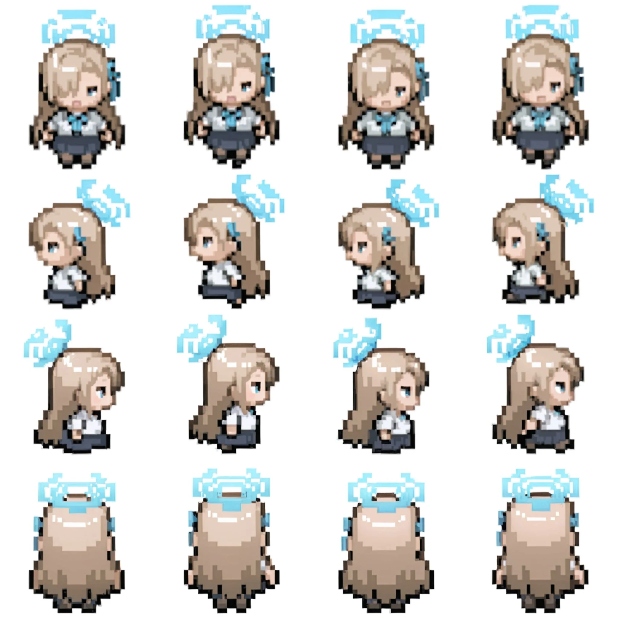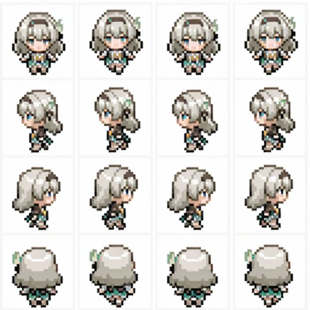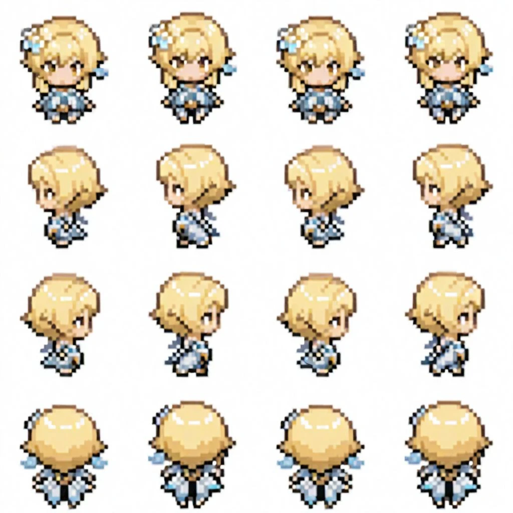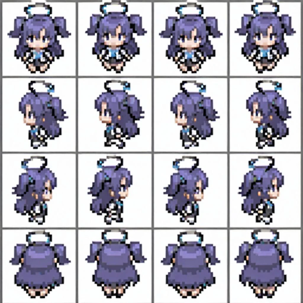 pixel_character_sprite, pxlchrctrsprt, sprite, sprite sheet, sprite art, pixel, (pixel art:1.5), retro game, retro, vibrant colors, pixelated, multiple views, concept art, (chibi:1.5), from side, looking away, from behind, back, white background, <lora:pixel_character_sprite_illustrious:0.7>Description