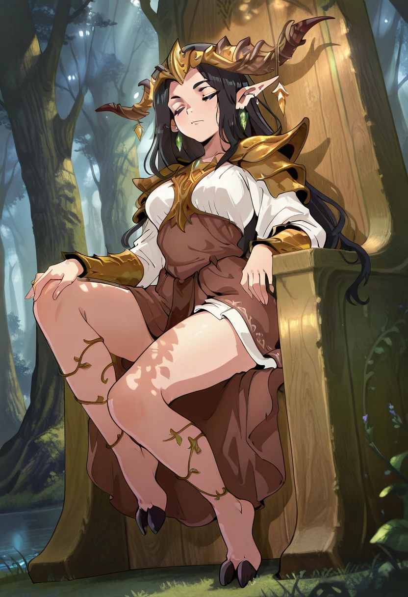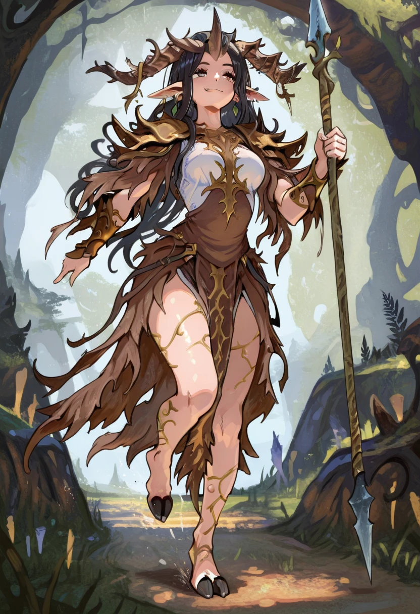 pointy ears, long pointy ears, black hair, long hair, horns, barefoot, hooves,