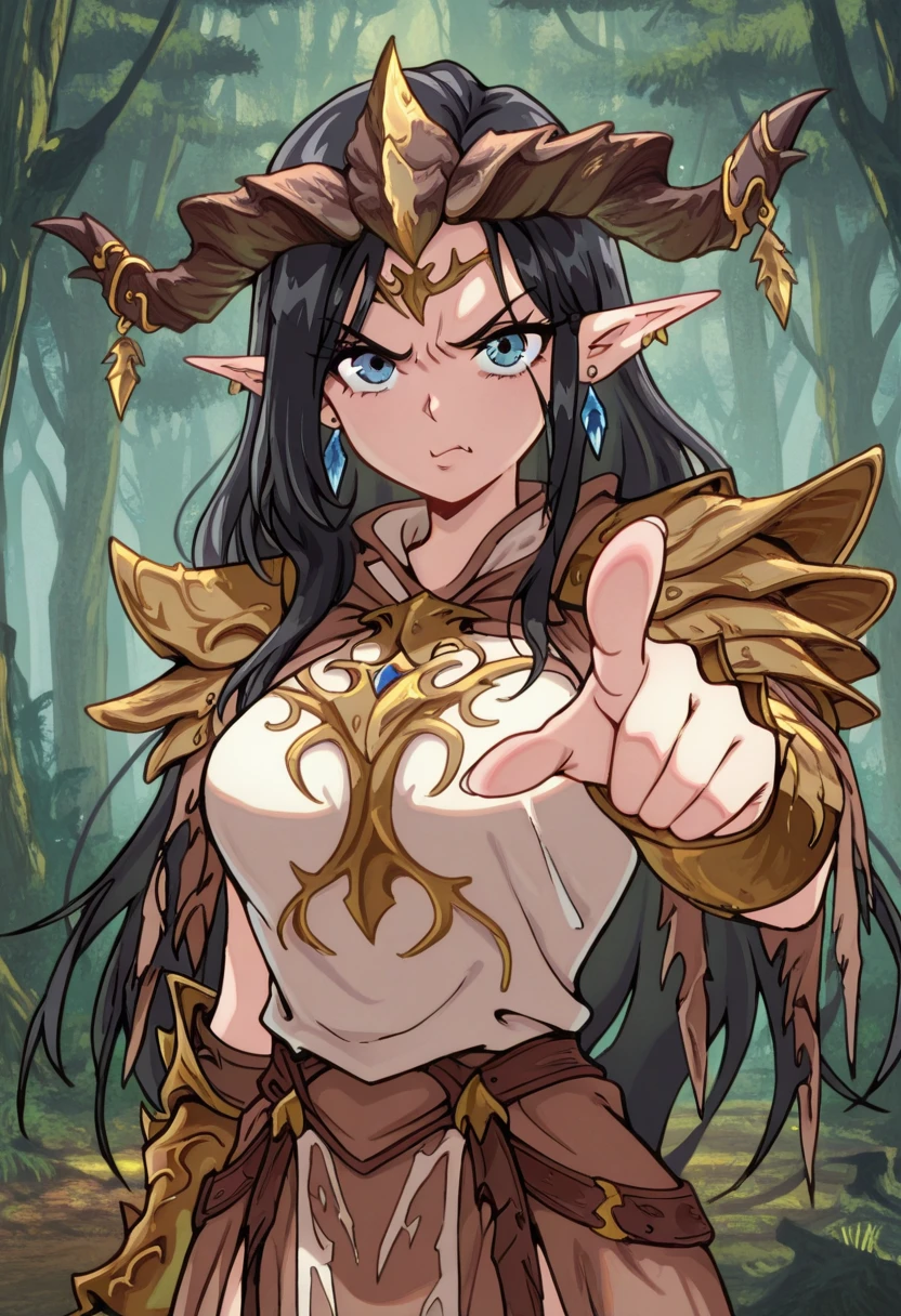 The Magic the Gathering character Morcant, leader of the elves in Lorwyn-Shadowmoor from her throne in Lys Alana. She was featured in the Lorwyn Eclipsed set.