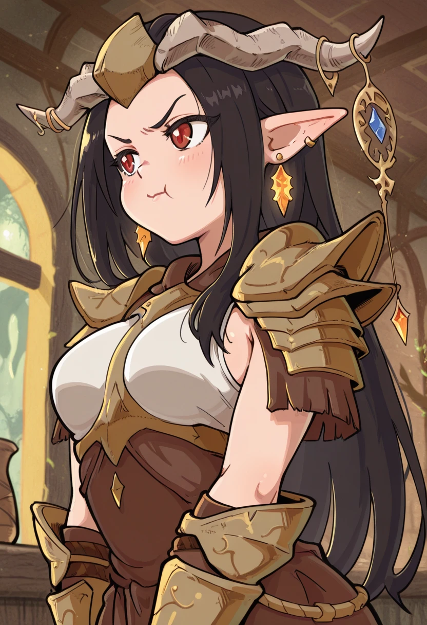 earrings, vambraces, shoulder armor, brown dress, white top,