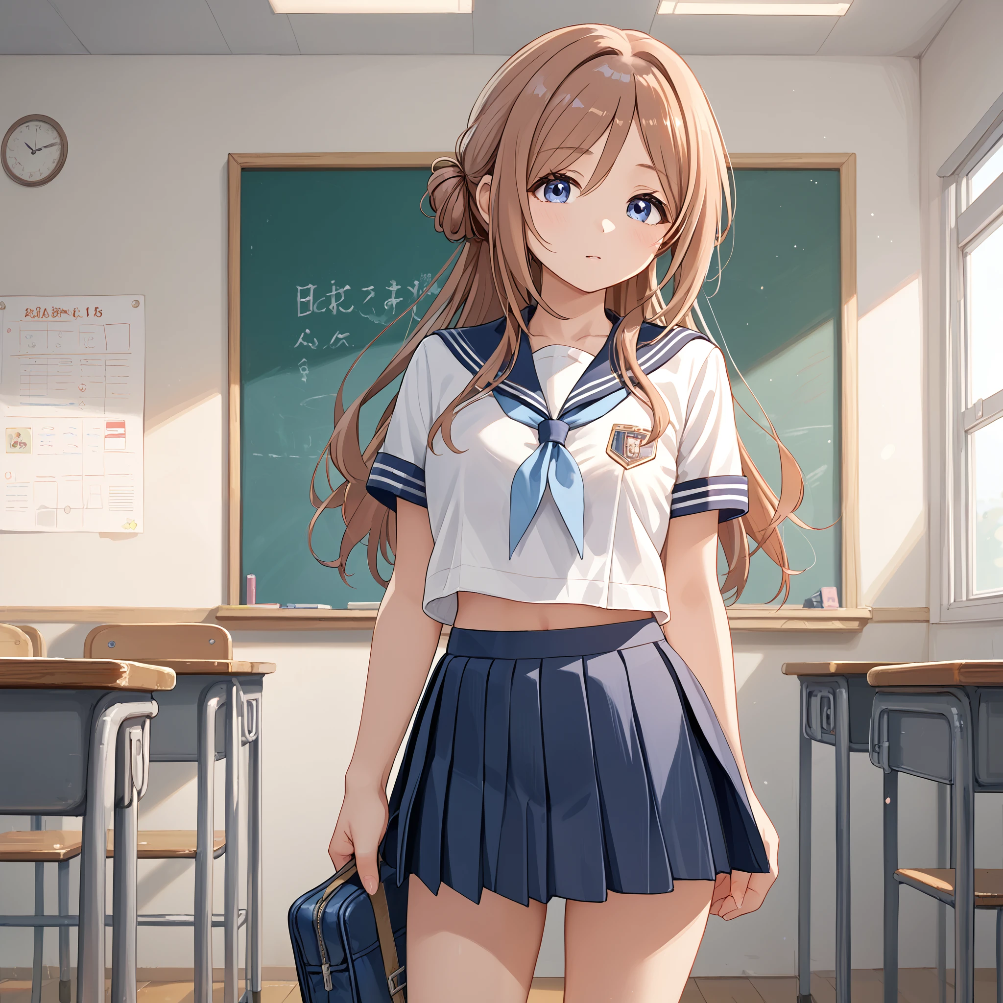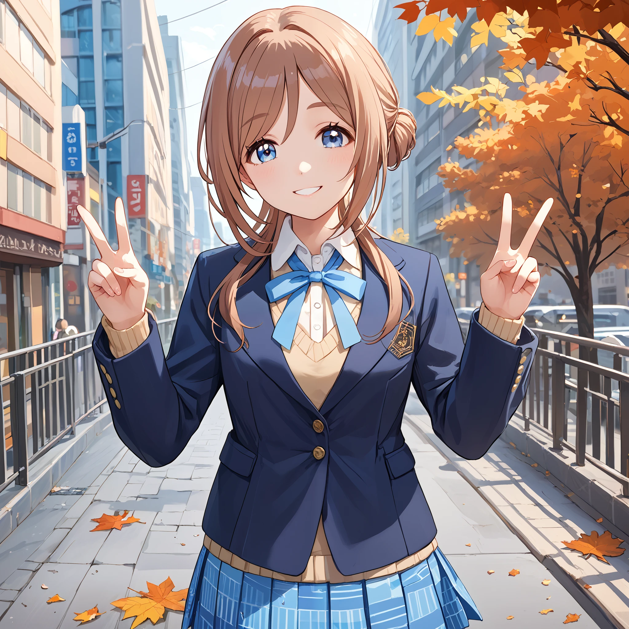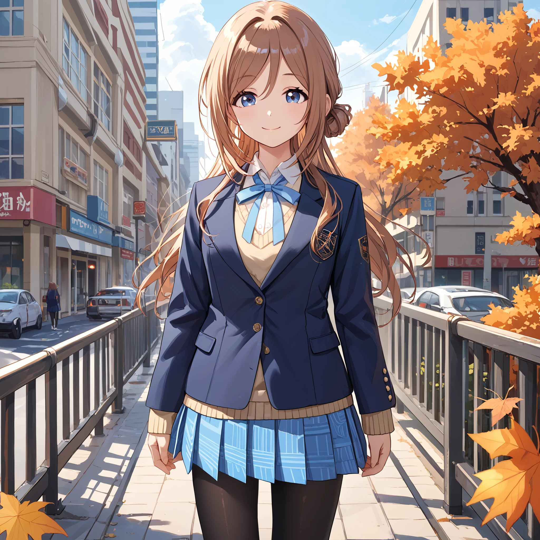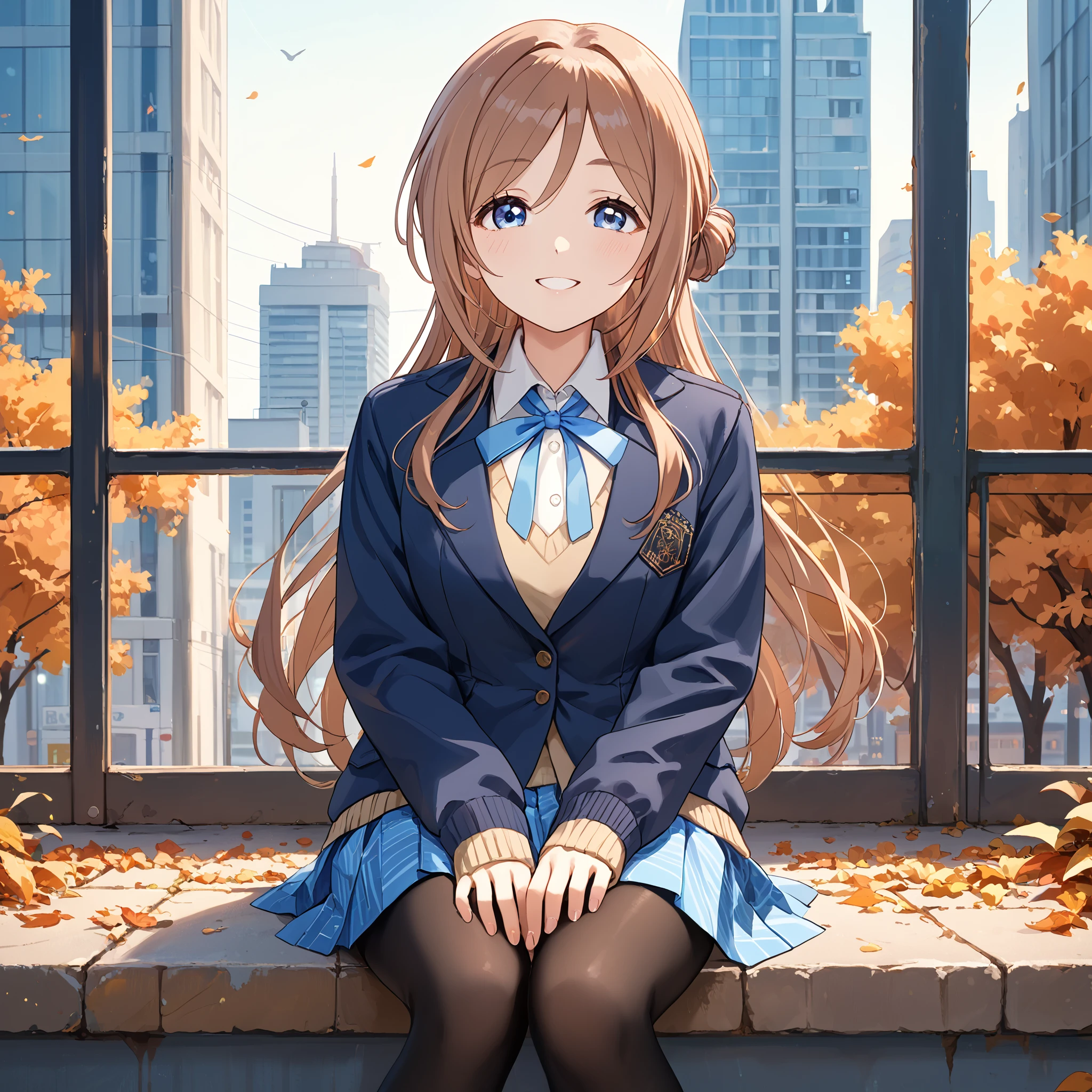 School Uniform : himesaki rinami, long hair, single side bun, blue eyes, brown hair, school uniform, blue jacket, blue ribbon, long sleeves, pleated skirt, blue skirt, black pantyhose,Description