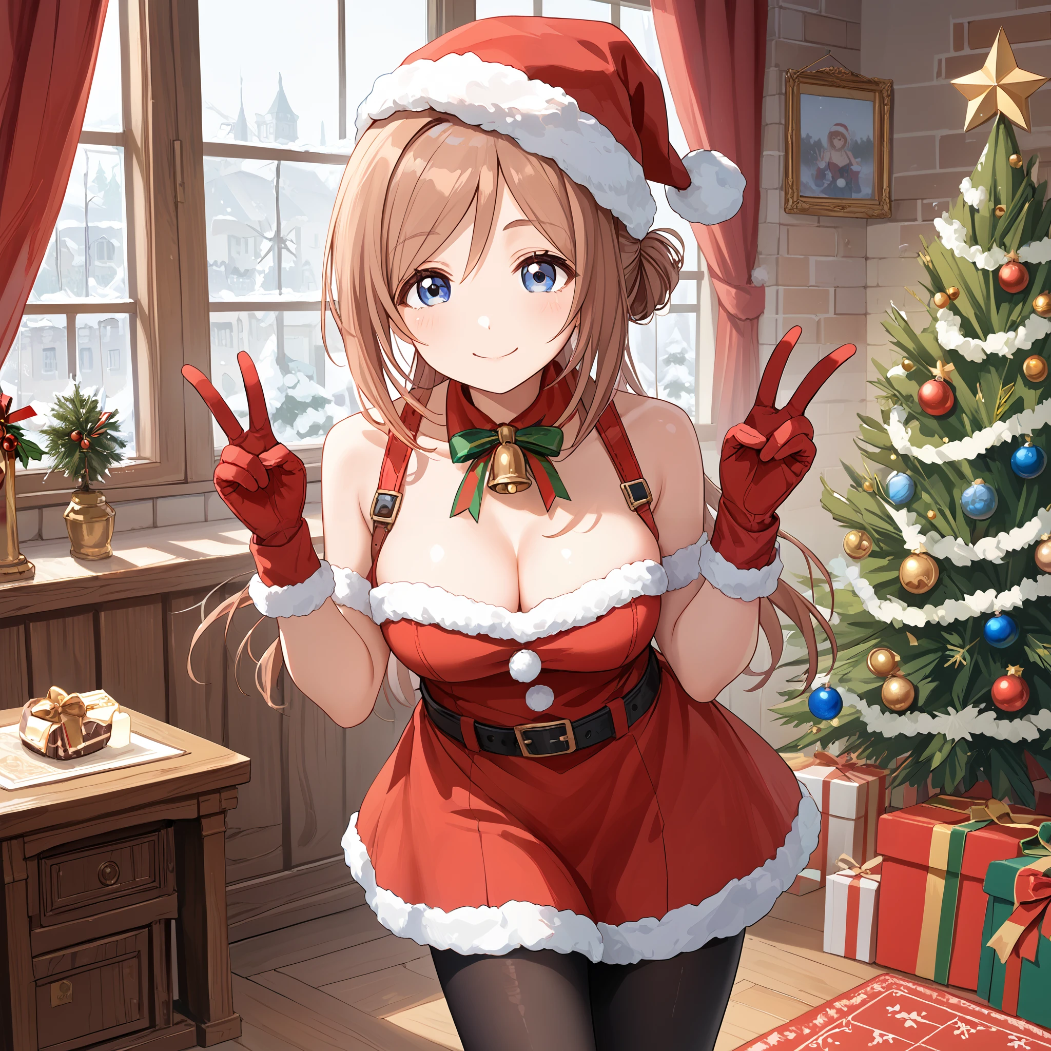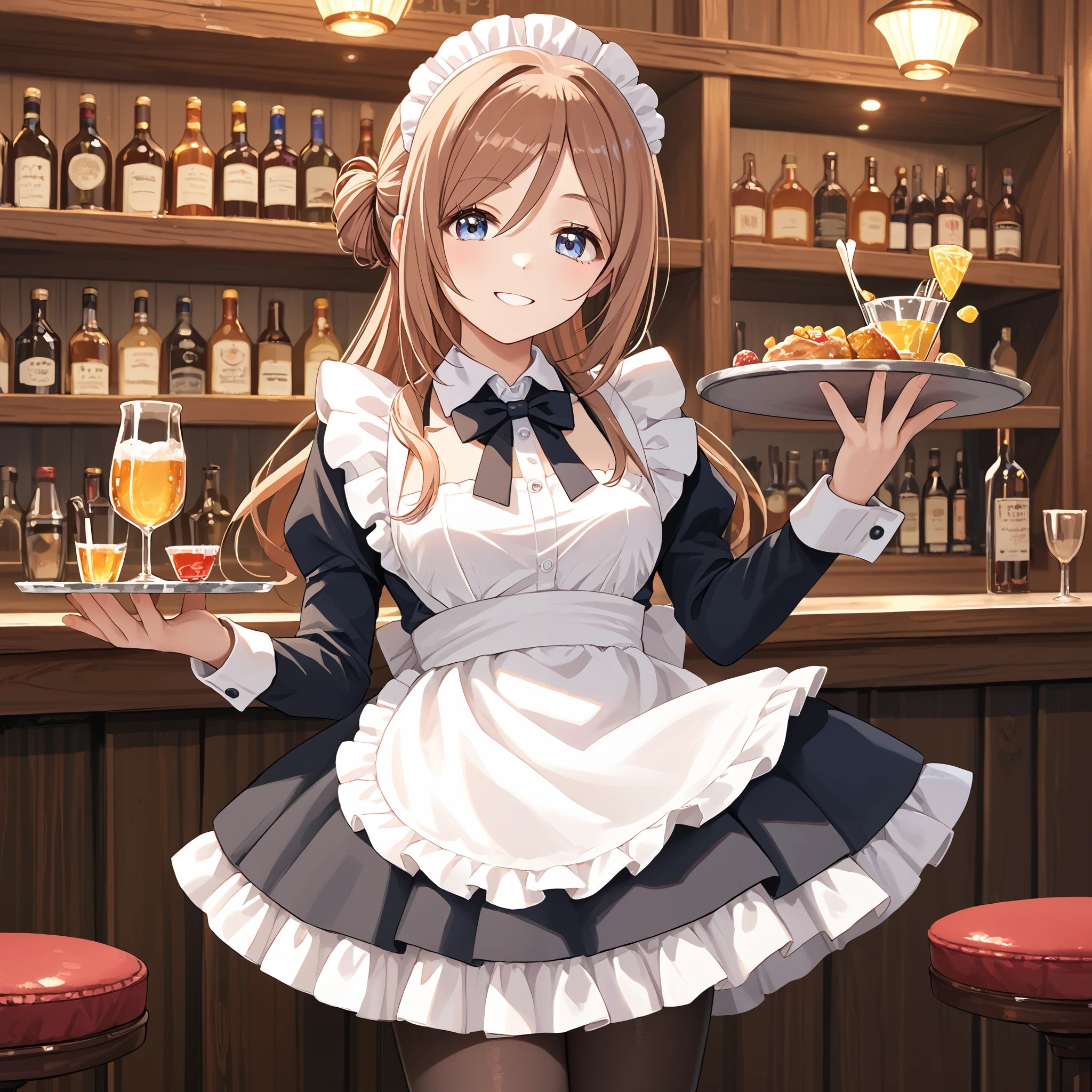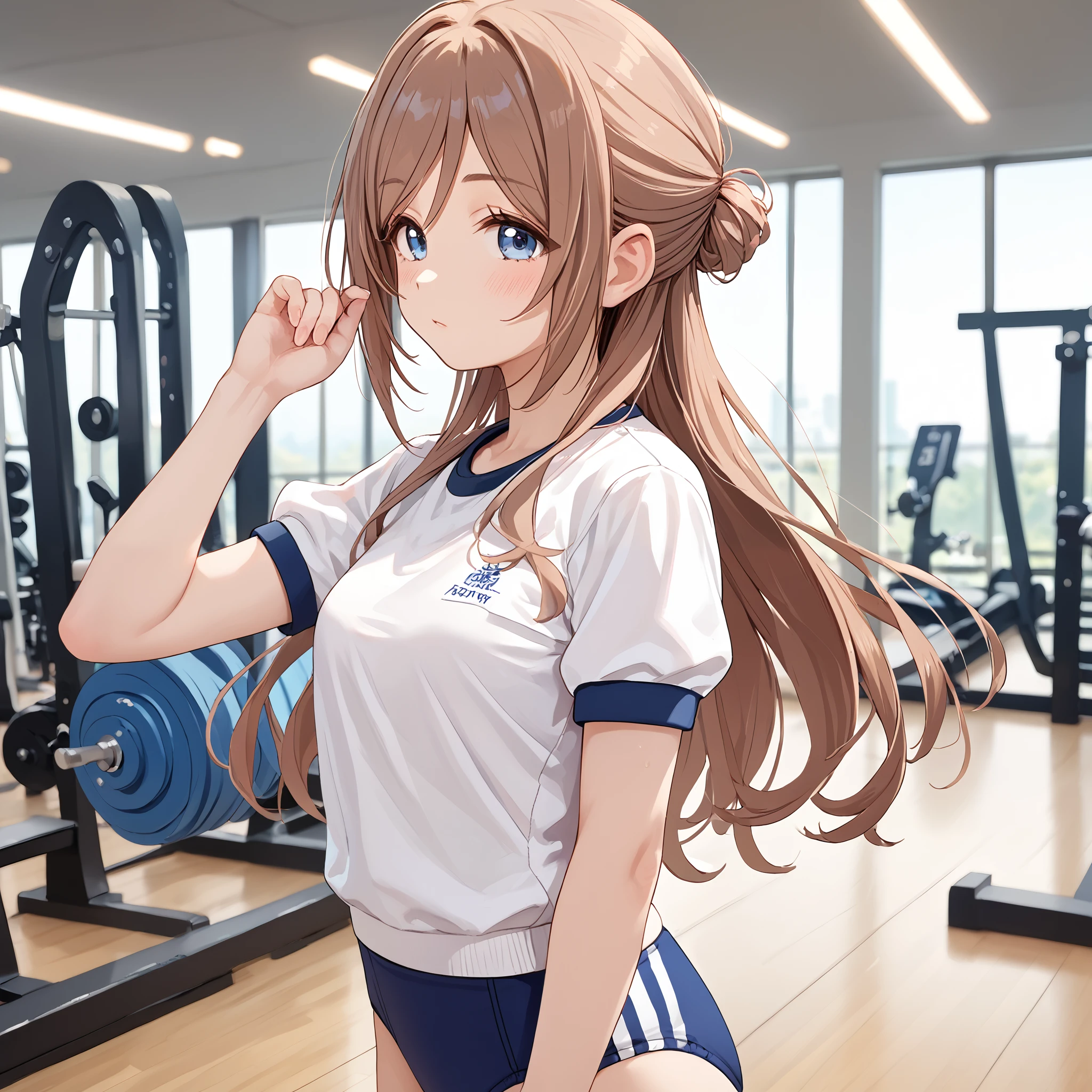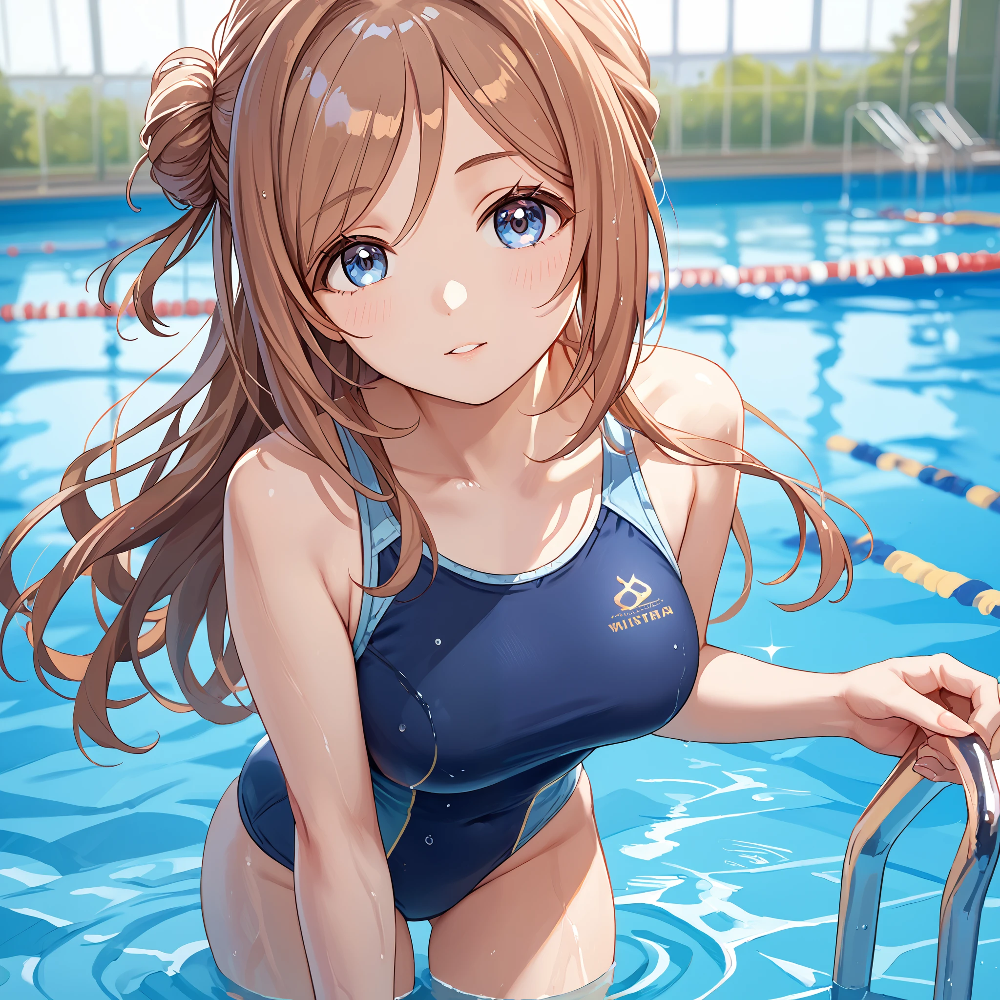 School Uniform : himesaki rinami, long hair, single side bun, blue eyes, brown hair, school uniform, blue jacket, blue ribbon, long sleeves, pleated skirt, blue skirt, black pantyhose,Description