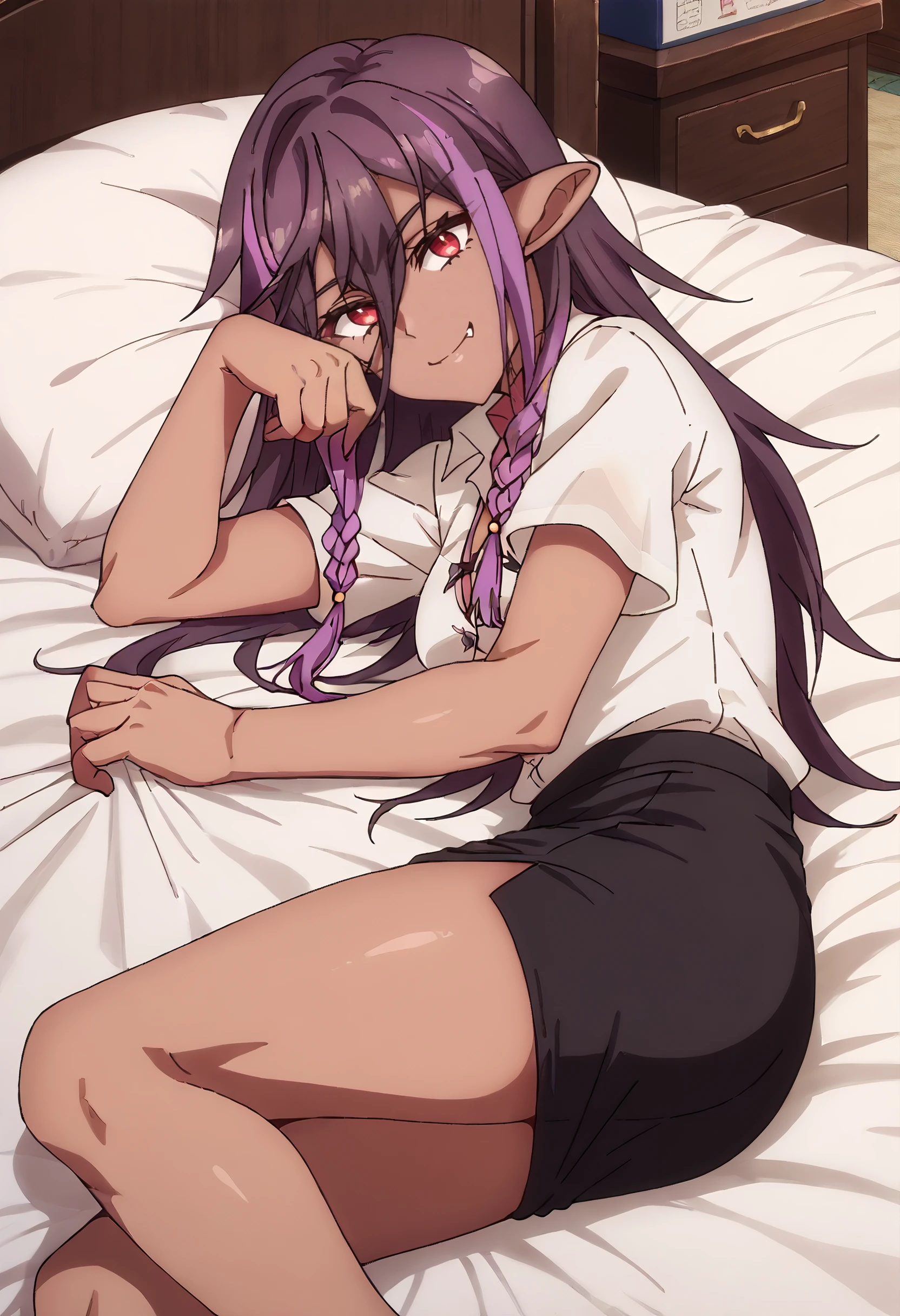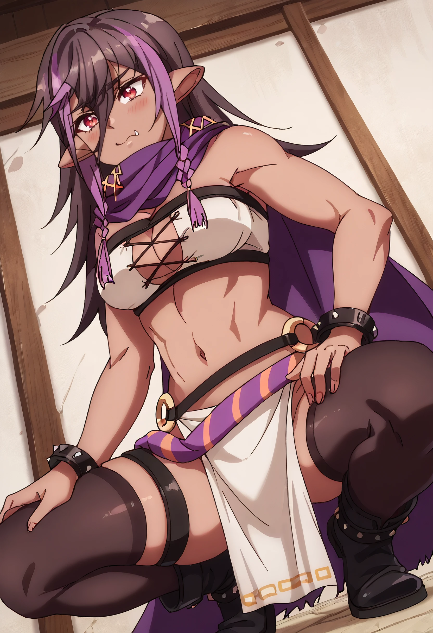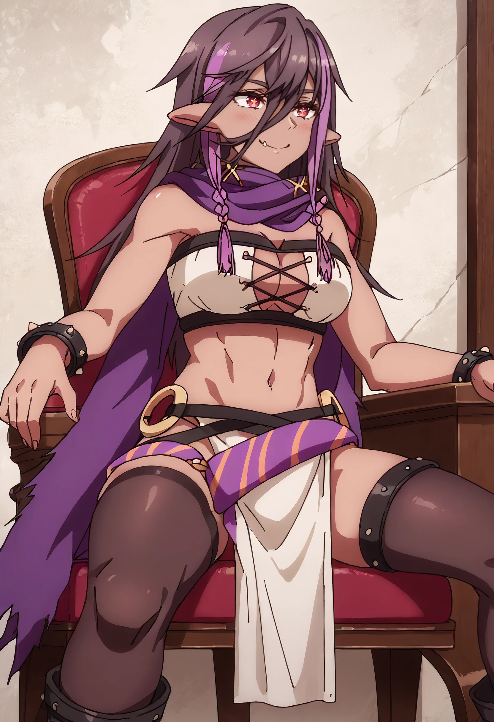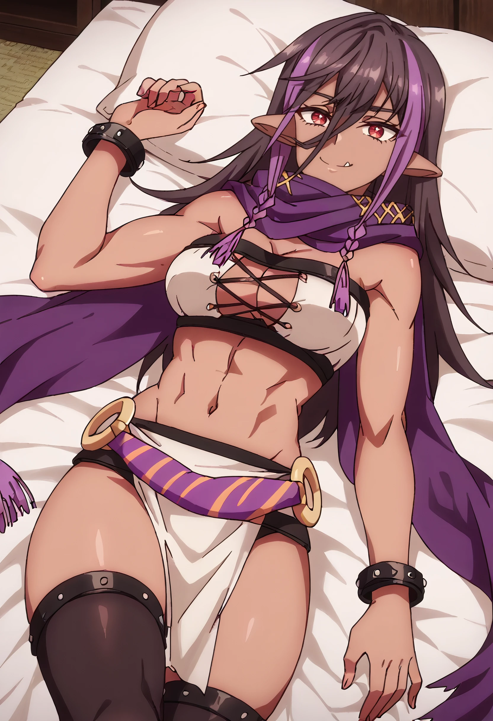 YHeLoewe, elf, long hair, black hair, pointy ears, multicolored hair, two-tone hair, muscular female, purple hair, hair between eyes, braid, red eyes, side braids, colored skin, twin braids, streaked hair, dark elf, dark skin, dark-skinned female, fang,
