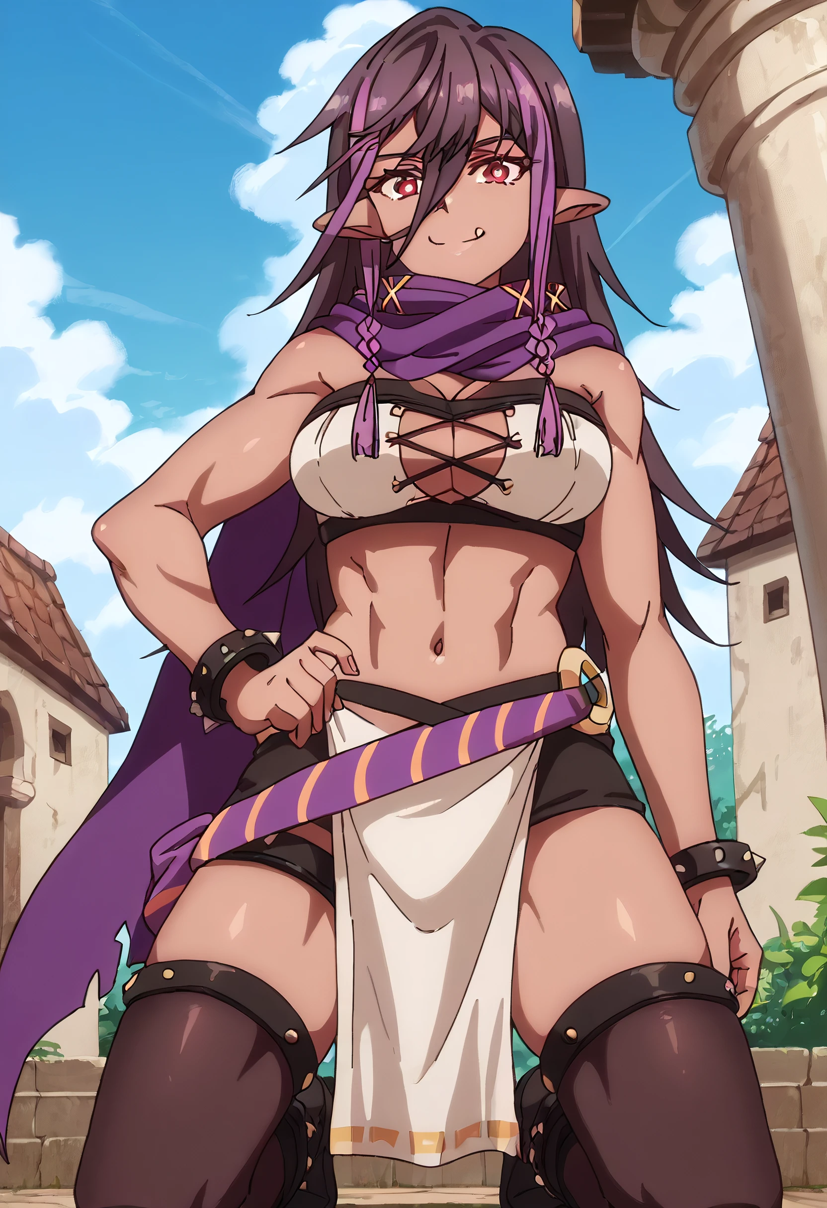 LoeweOutfit, purple scarf, scarf, cleavage, bare shoulders, navel, jewelry, midriff, bracelet, tube top, strapless, pelvic curtain, bandeau, loincloth, spiked bracelet, spikes, thighhighs, cape, white bandeau, clothing cutout, boots, thigh strap, o-ring, black thighhighs, purple cape,