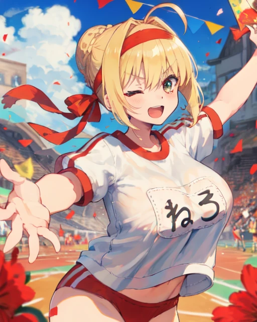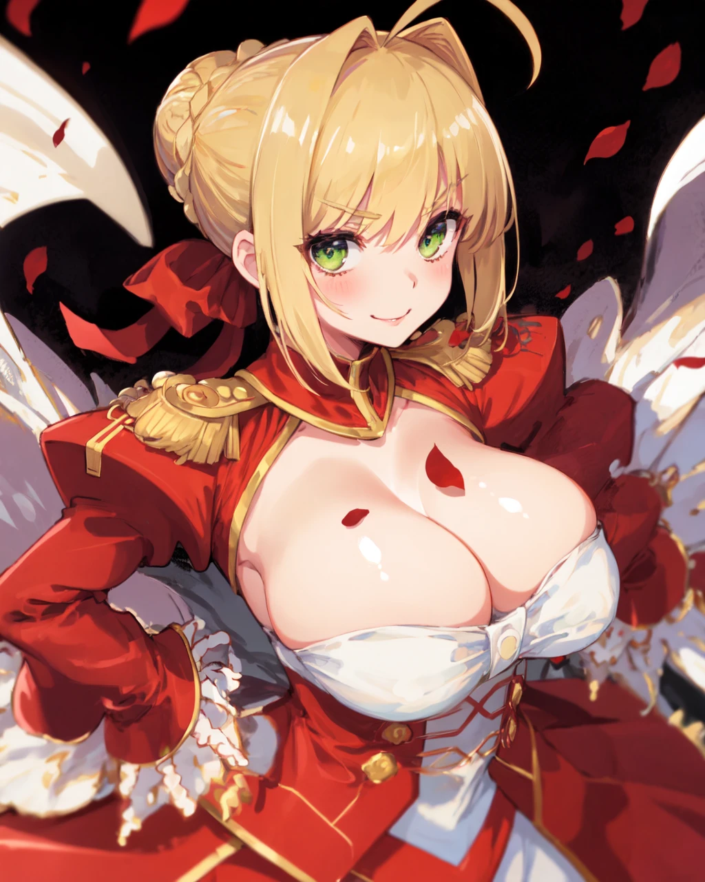 nero claudius (fate), breasts, blonde hair, cleavage, green eyes, ahoge, large breasts, epaulettes, braid, red dress, dress, hair intakes, long sleeves, juliet sleeves, bangs, collarbone, puffy sleeves, french braid, short hair, ribbon, hair bun, red ribbon