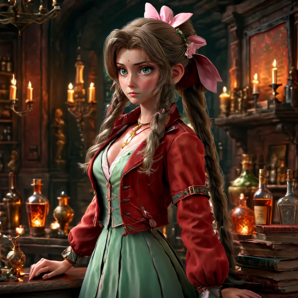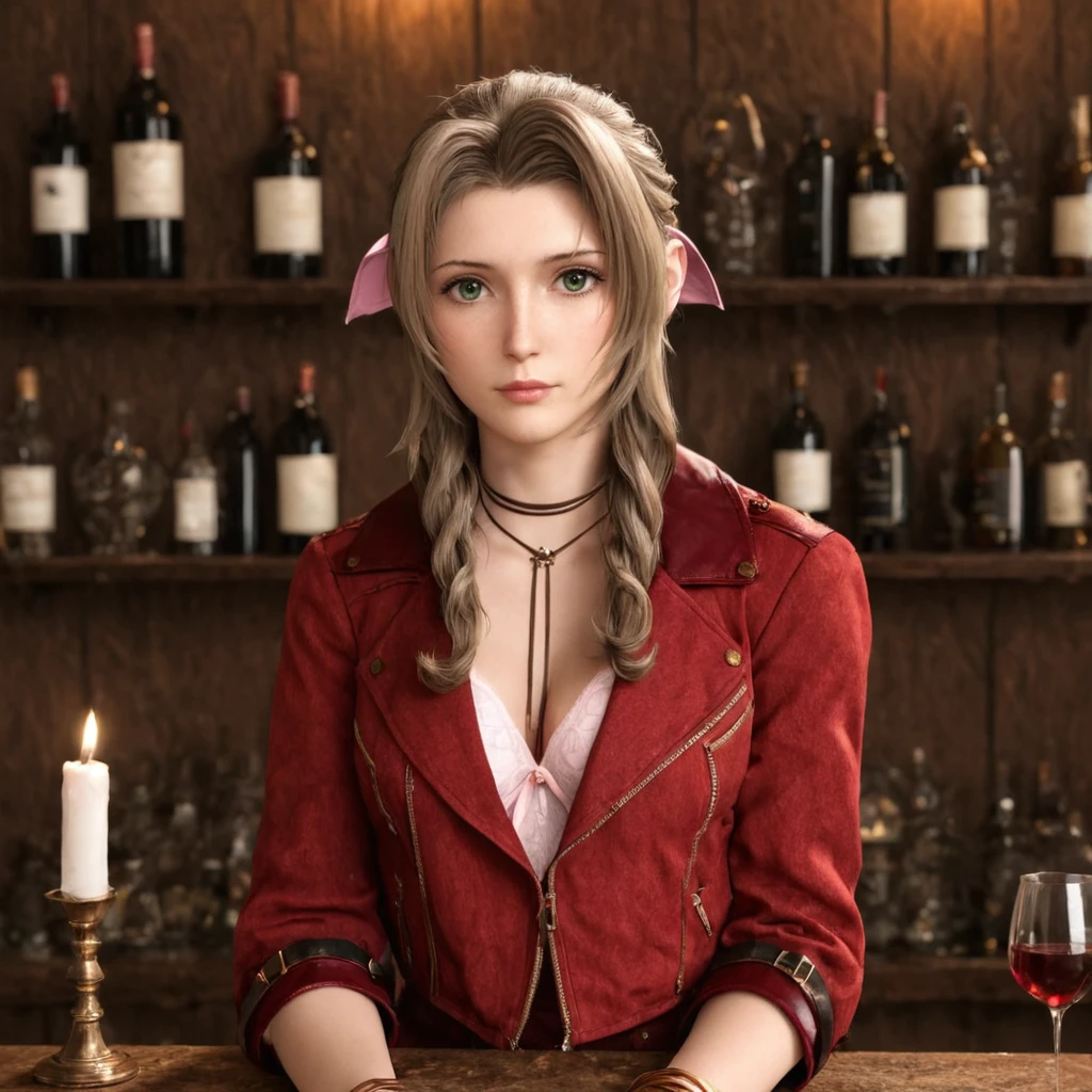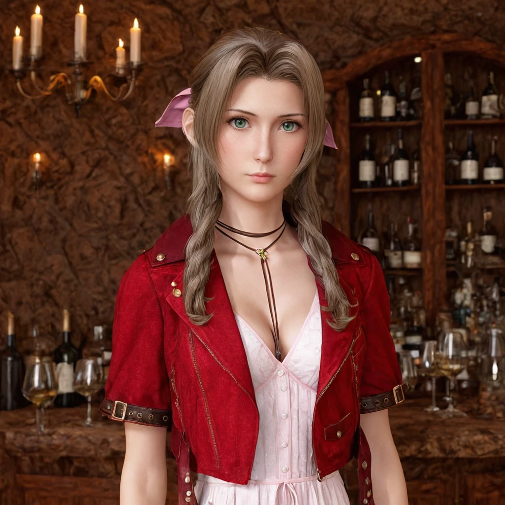 aerith gainsborough,hair ribbon,sidelocks,braid,braided ponytail,parted bangs,green eyes,jewelry,choker,pink bow,pink dress,cropped jacket,open jacket,red jacket,boots,bracelet