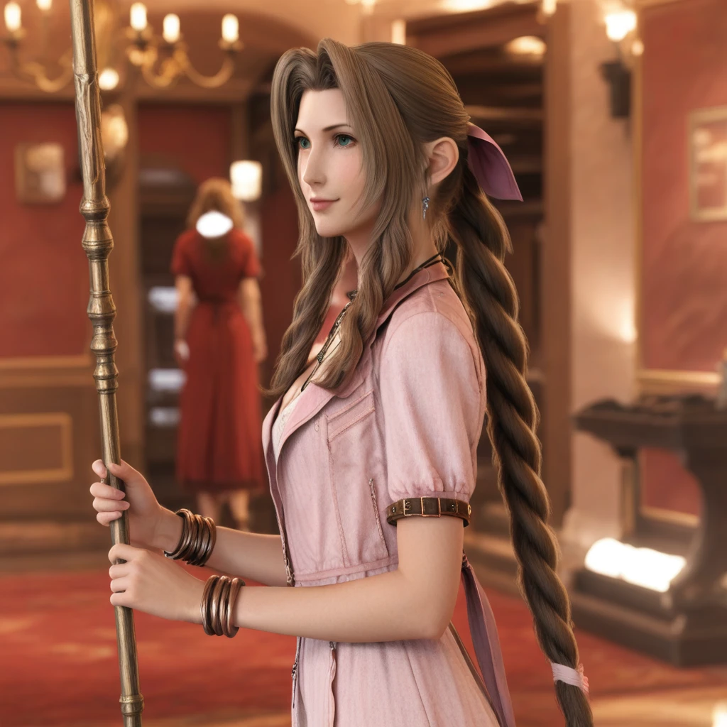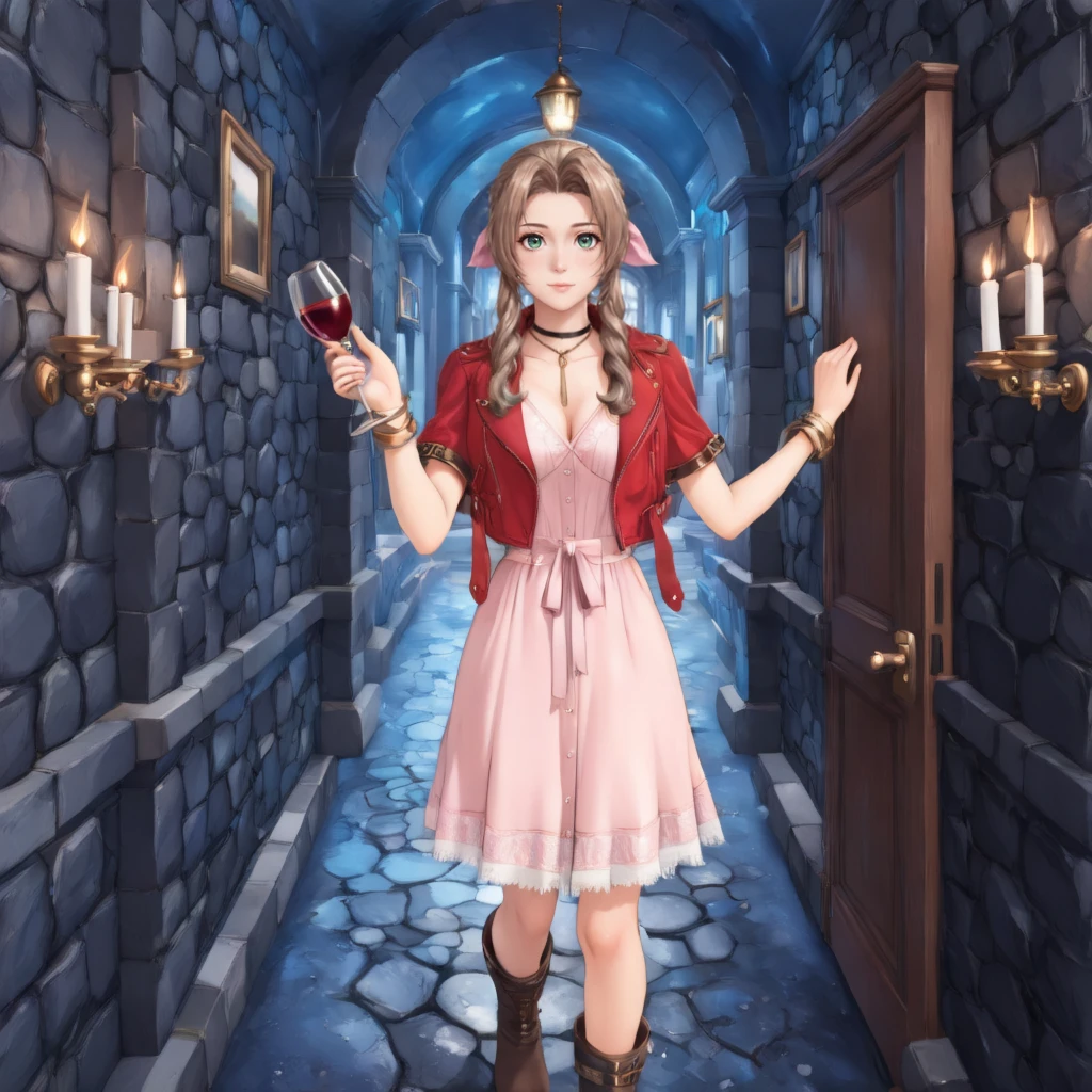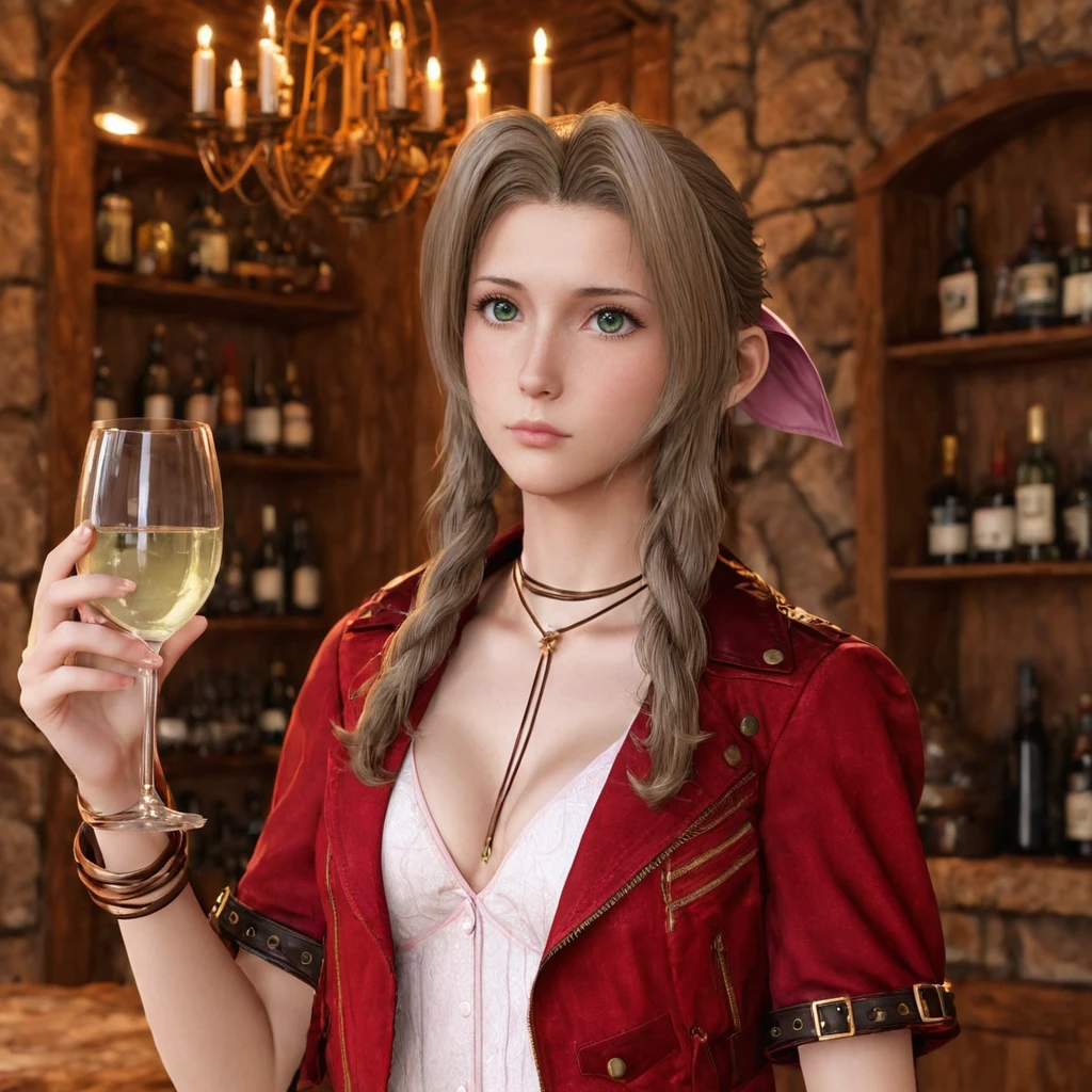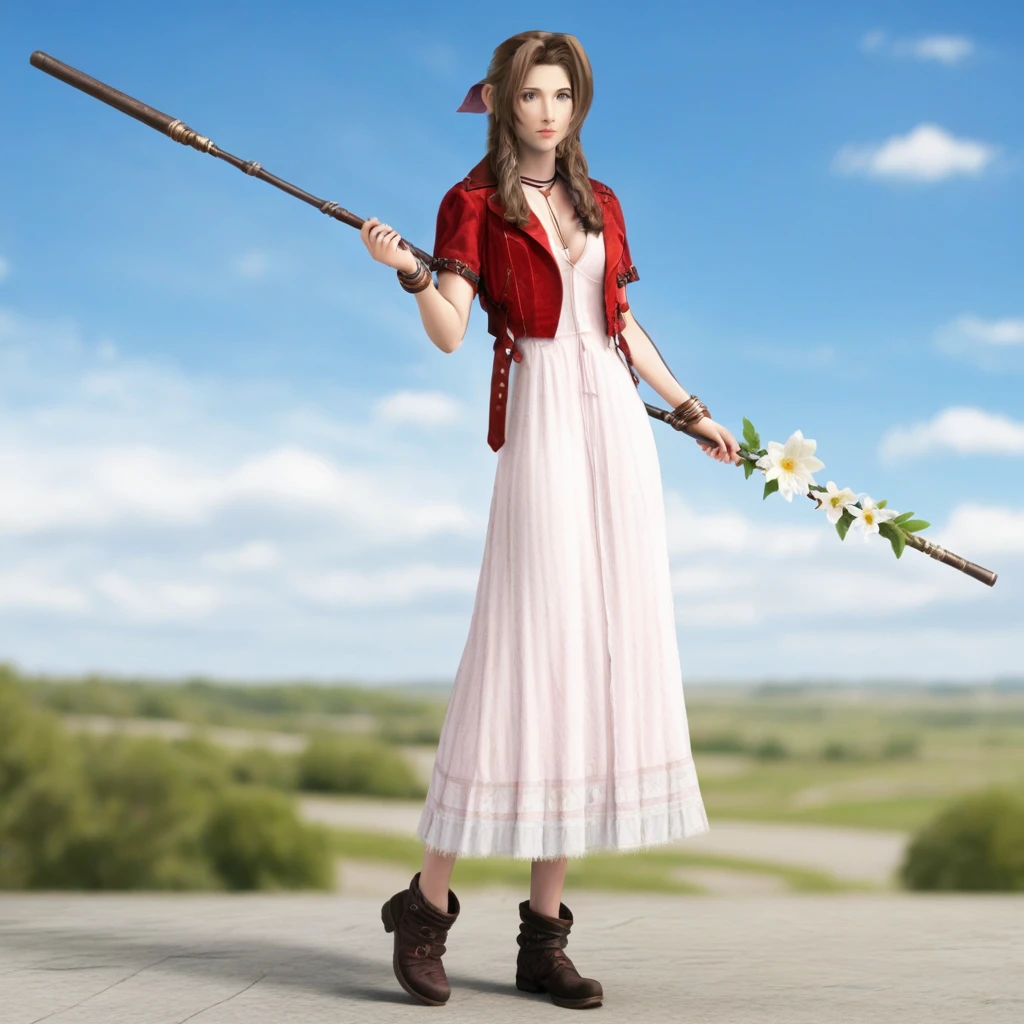 aerith gainsborough,hair ribbon,sidelocks,braid,braided ponytail,parted bangs,green eyes,jewelry,choker,pink bow,pink dress,cropped jacket,open jacket,red jacket,boots,bracelet