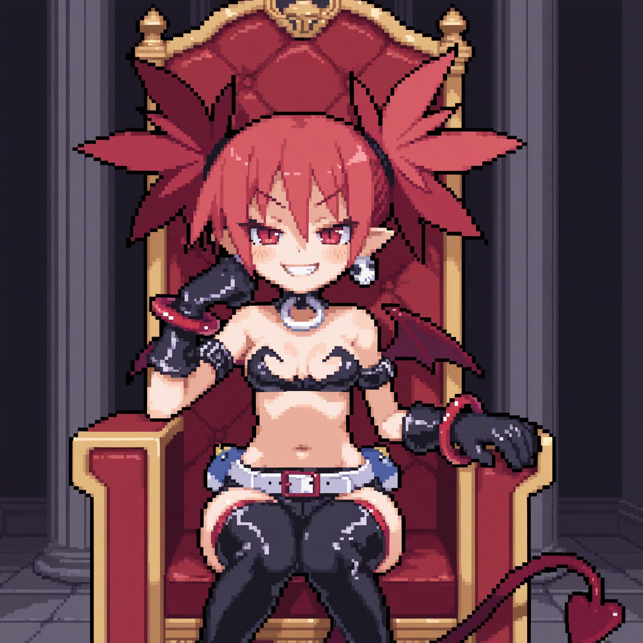 Disgaea 2: Cursed Memories Outfit: etdis, etna (disgaea), demon girl, short twintails, hair tie, red hair, short hair, red eyes, slit pupils, pointy ears, flat chest, demon wings, demon tail, outfit 2, skull earrings, black o-ring choker, black bikini top, strapless, black elbow gloves, black arm belt, red studded bracelet, black miniskirt, side slit, white belt, fanny pack, black thighhighs, red studded anklet, two-tone boots, black boots, red boots