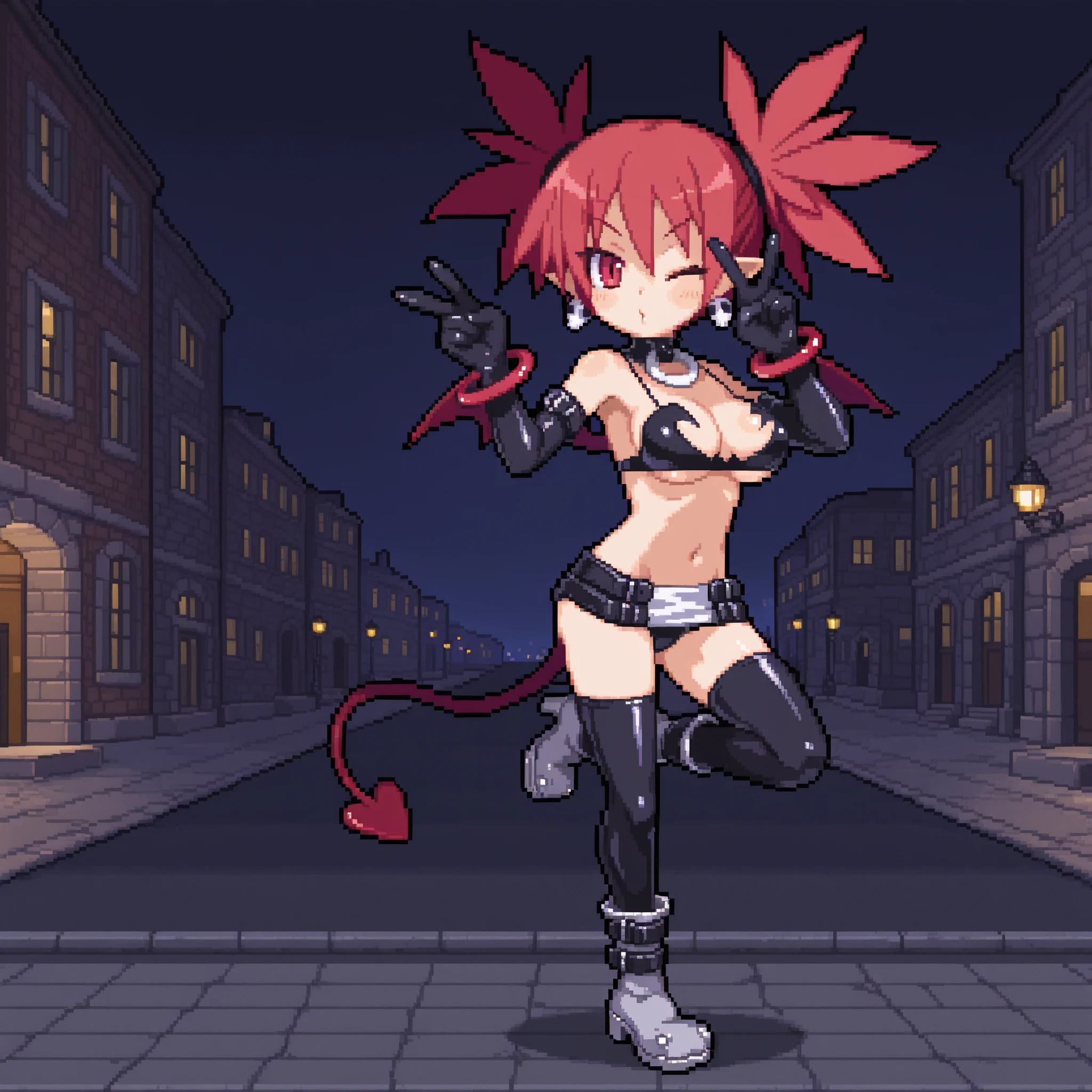 Disgaea: Hour of Darkness Outfit: etdis, etna (disgaea), demon girl, short twintails, hair tie, red hair, short hair, red eyes, slit pupils, pointy ears, demon wings, demon tail, outfit 1, skull earrings, black o-ring choker, black bikini top, elbow gloves, black arm belt, red bracelet, black microskirt, black thighhighs, silver boots, black ankle belt