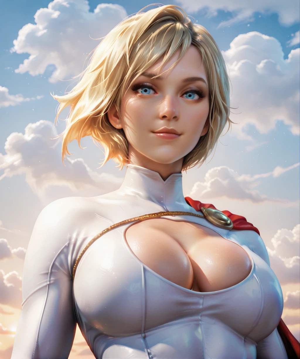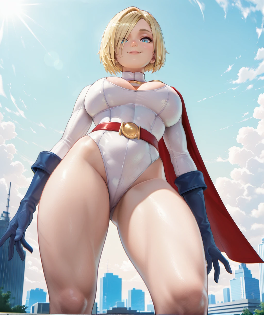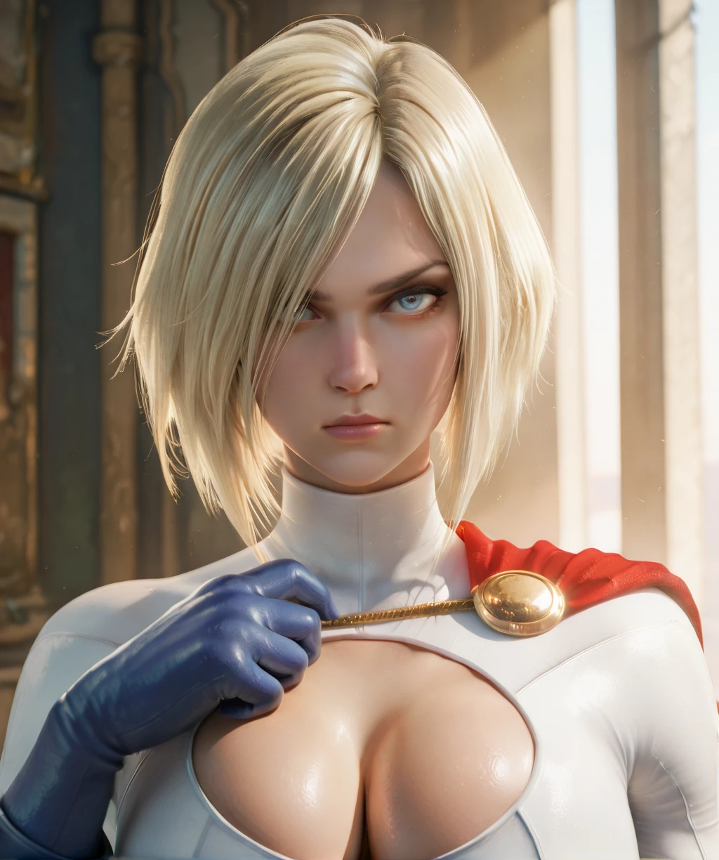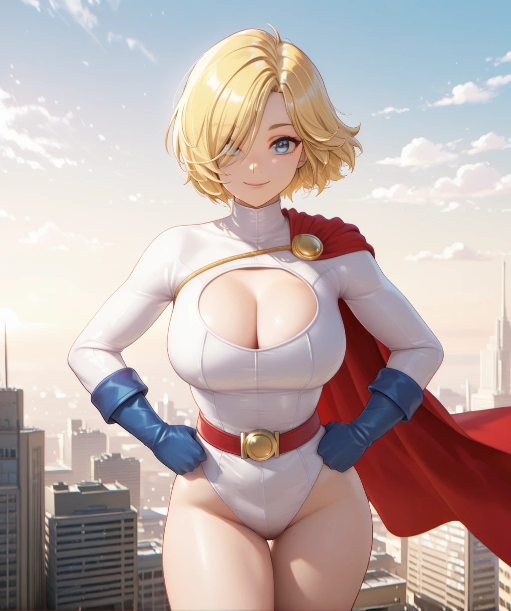 white leotard, large breasts, left shoulder cape and chain, cleavage cutout, long sleeves, red belt, blue gloves, and blue boots,
