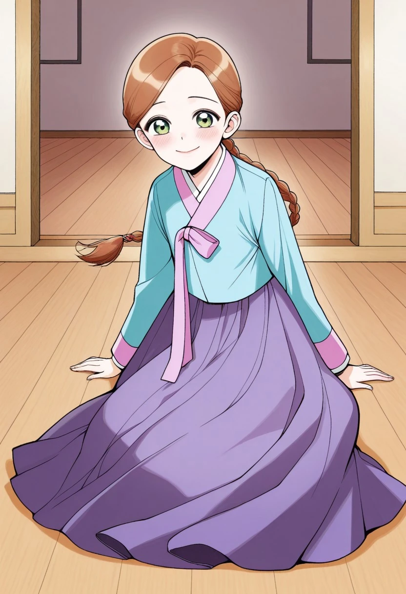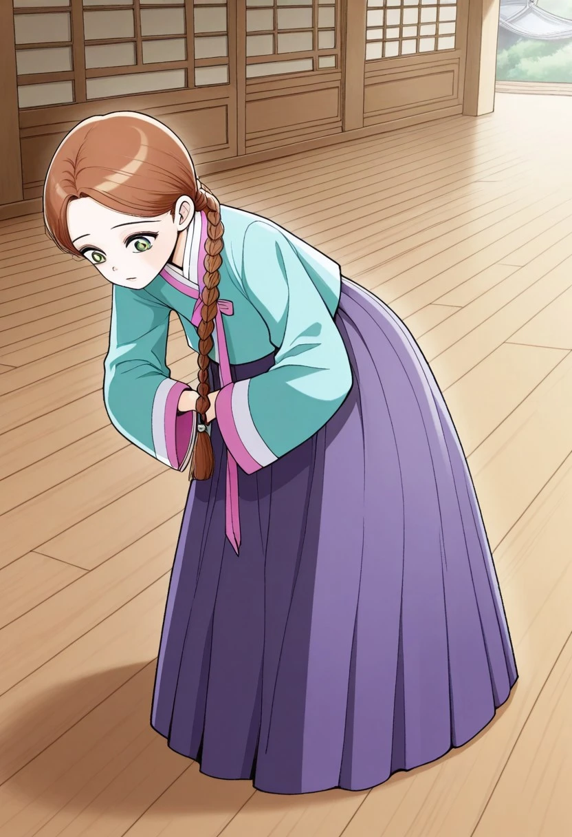 gungnyeo,gungnyeo outfit, green eyes, gungnyeo hairstyle, braid, long hair, hanbok, korean clothes, long skirt, traditional clothes, bowing, sleeves together,