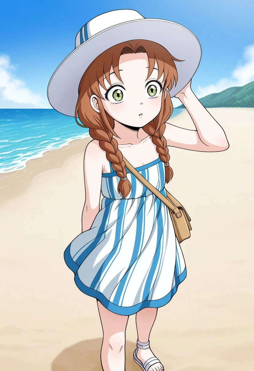 misojang,braid, twin braids, long hair, green eyes, hat, dress, striped dress, bare shoulders, bag, sandals,