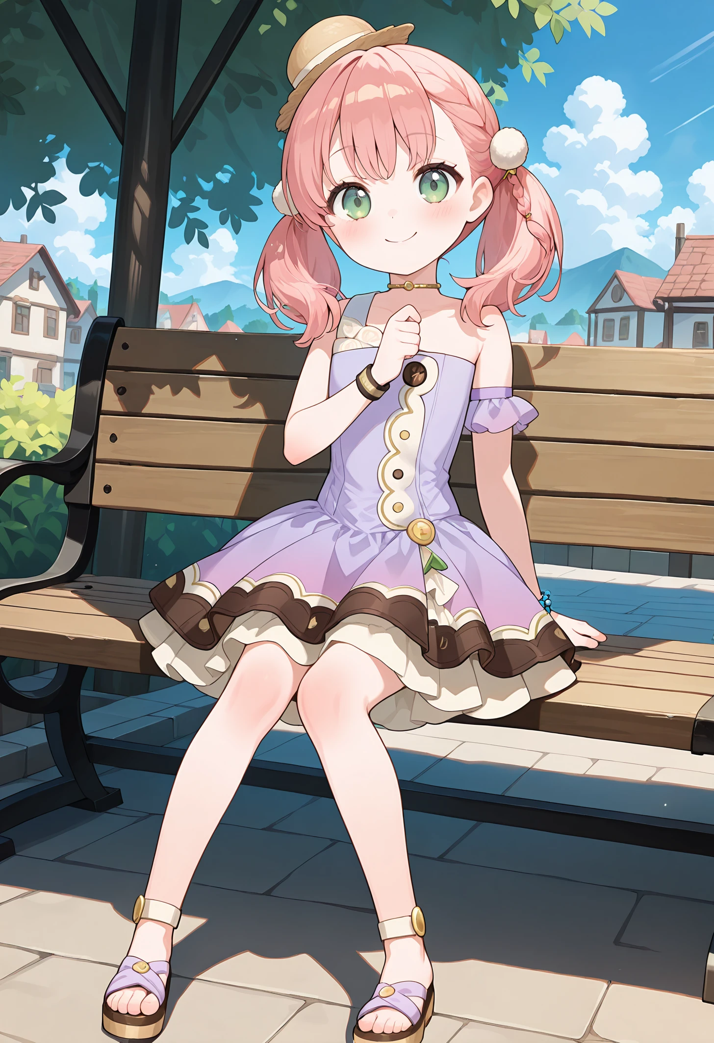 eschaa18, child, hair ornament, bare shoulders, sleeveless dress, gold choker, sandals, purple dress, mini hat, bead bracelet, wristband, armband,