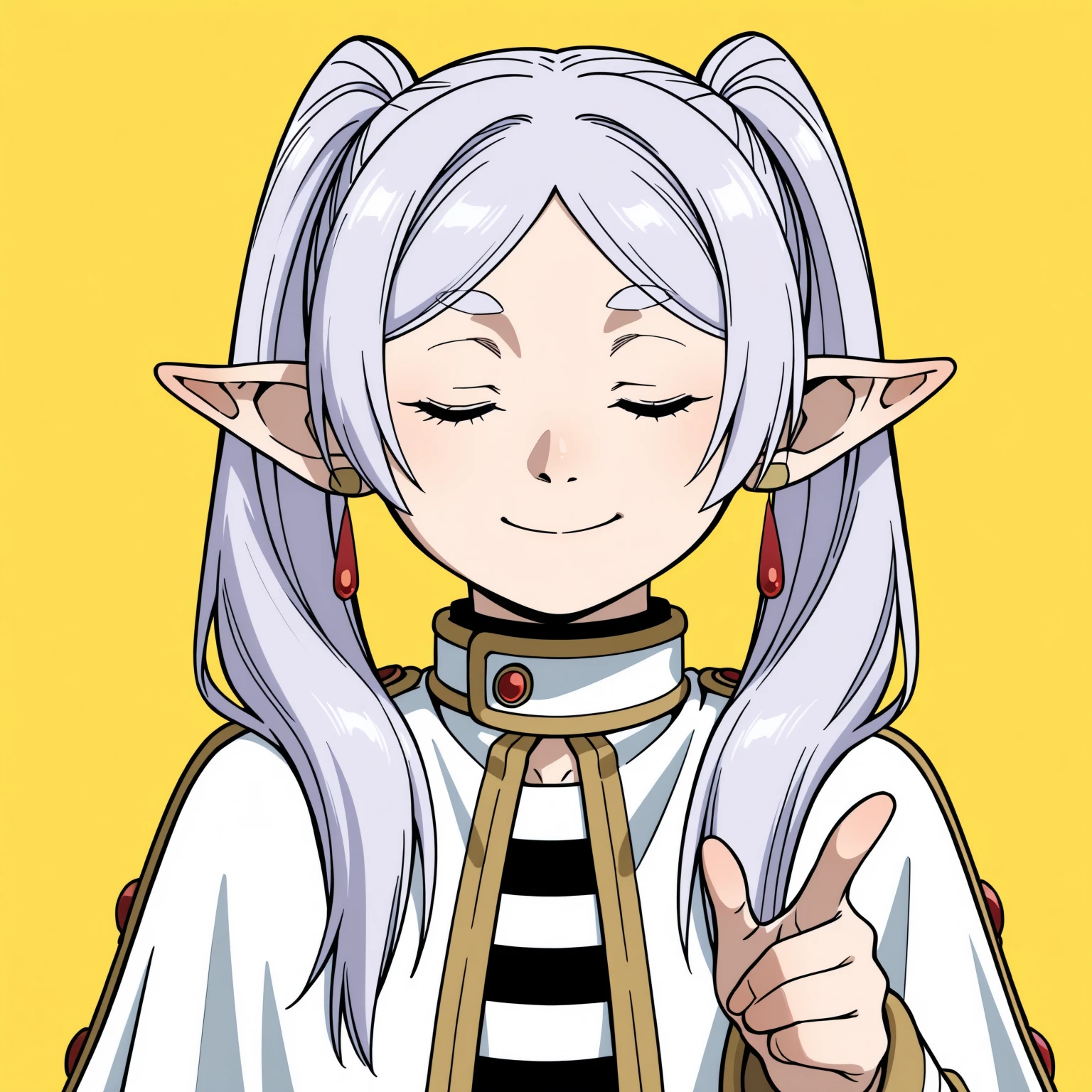 Recommend using some of these tags: white background, yellow background, index finger raised, closed eyes, upper body