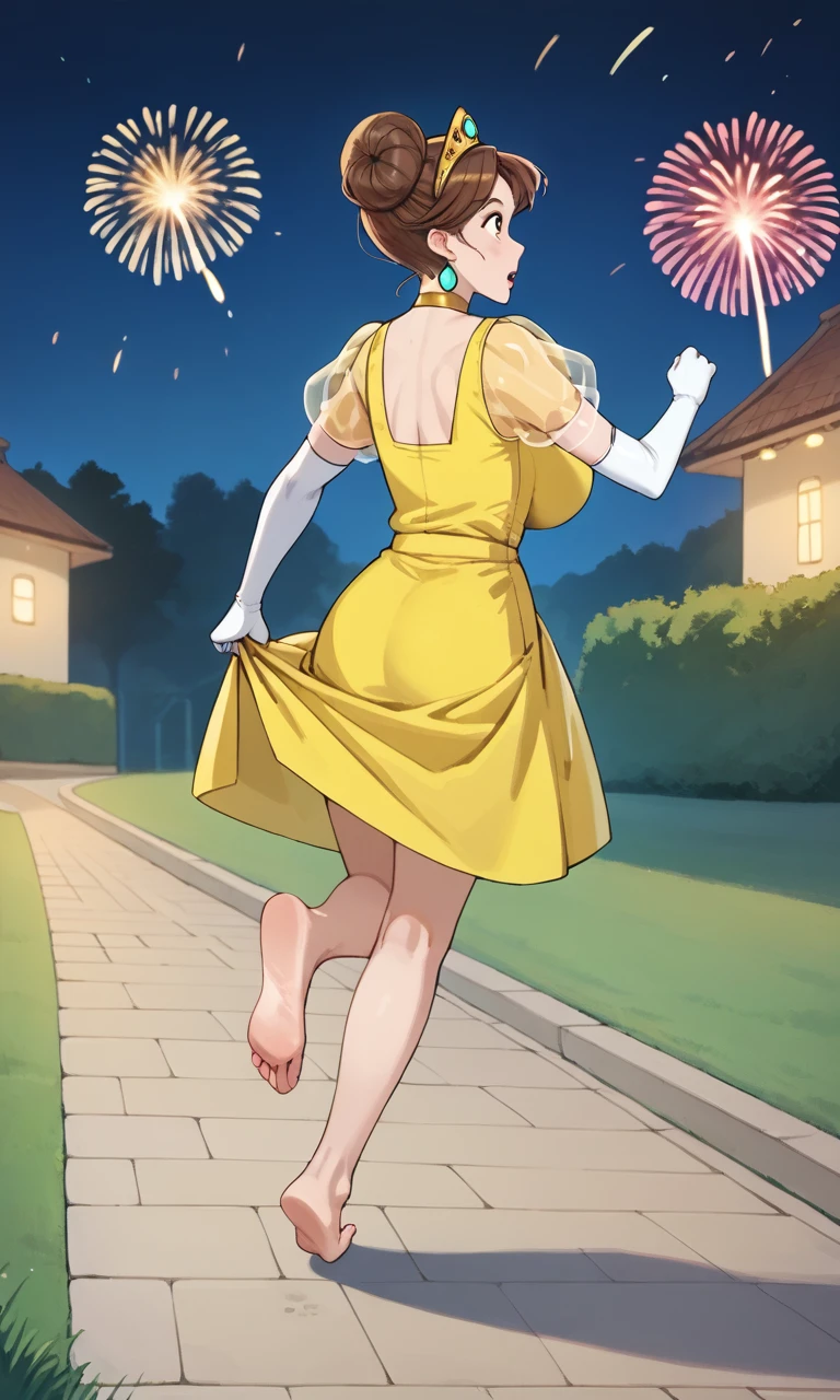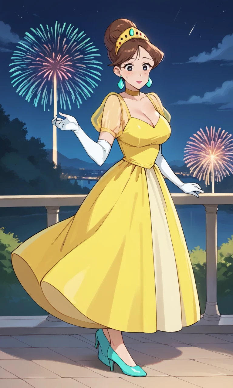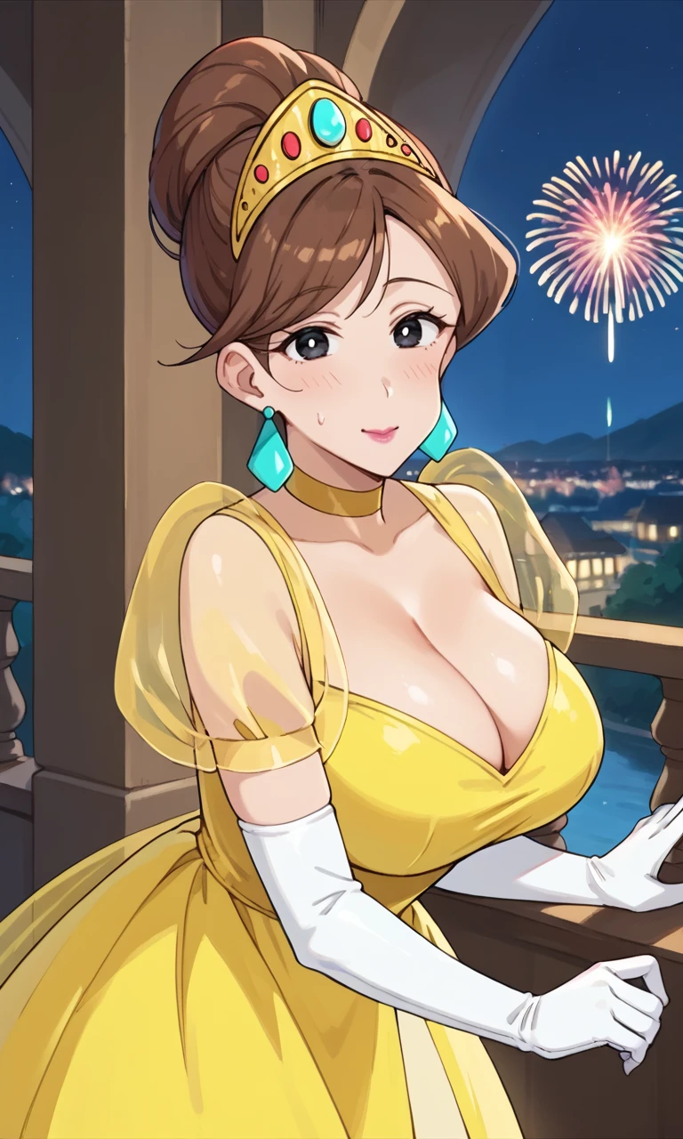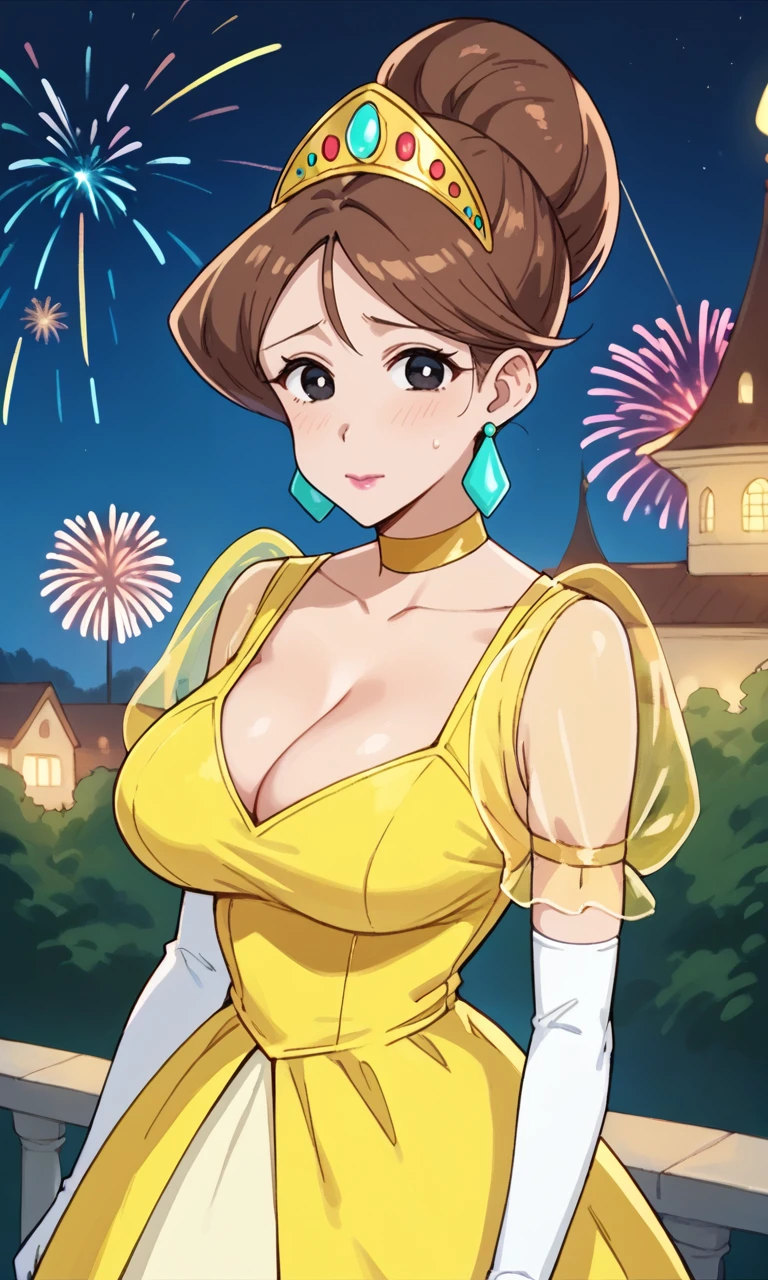 aqua earrings, pink lips, single hair bun, yellow tiara, aqua jewelry, yellow dress, see-through puffy short sleeves, yellow choker, yellow skirt, white elbow gloves, huge breasts, cleavage