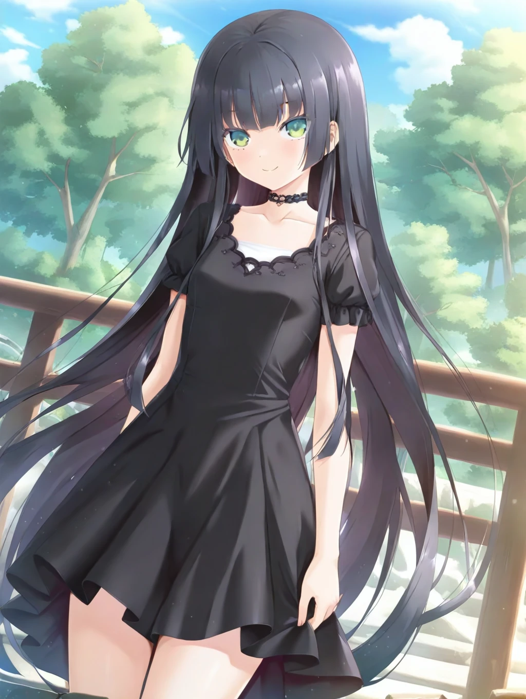 renge,1girl,solo,very long hair,black hair,green eyes,standing,smile,looking at viewer,outdoors,black dress