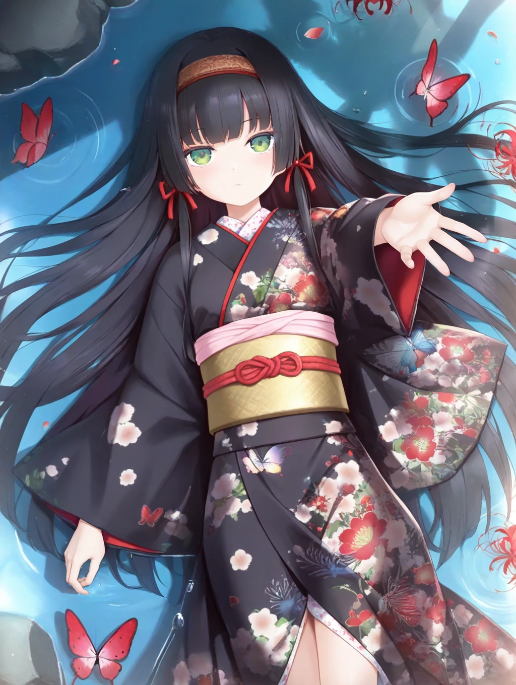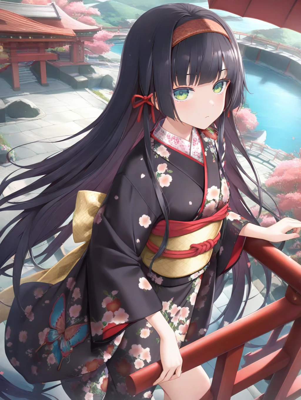 renge,1girl,solo,very long hair,black hair,green eyes,black kimono,floral print,butterfly print,japanese clothes,standing,looking at viewer,from above,hairband,red ribbon,hair ribbon