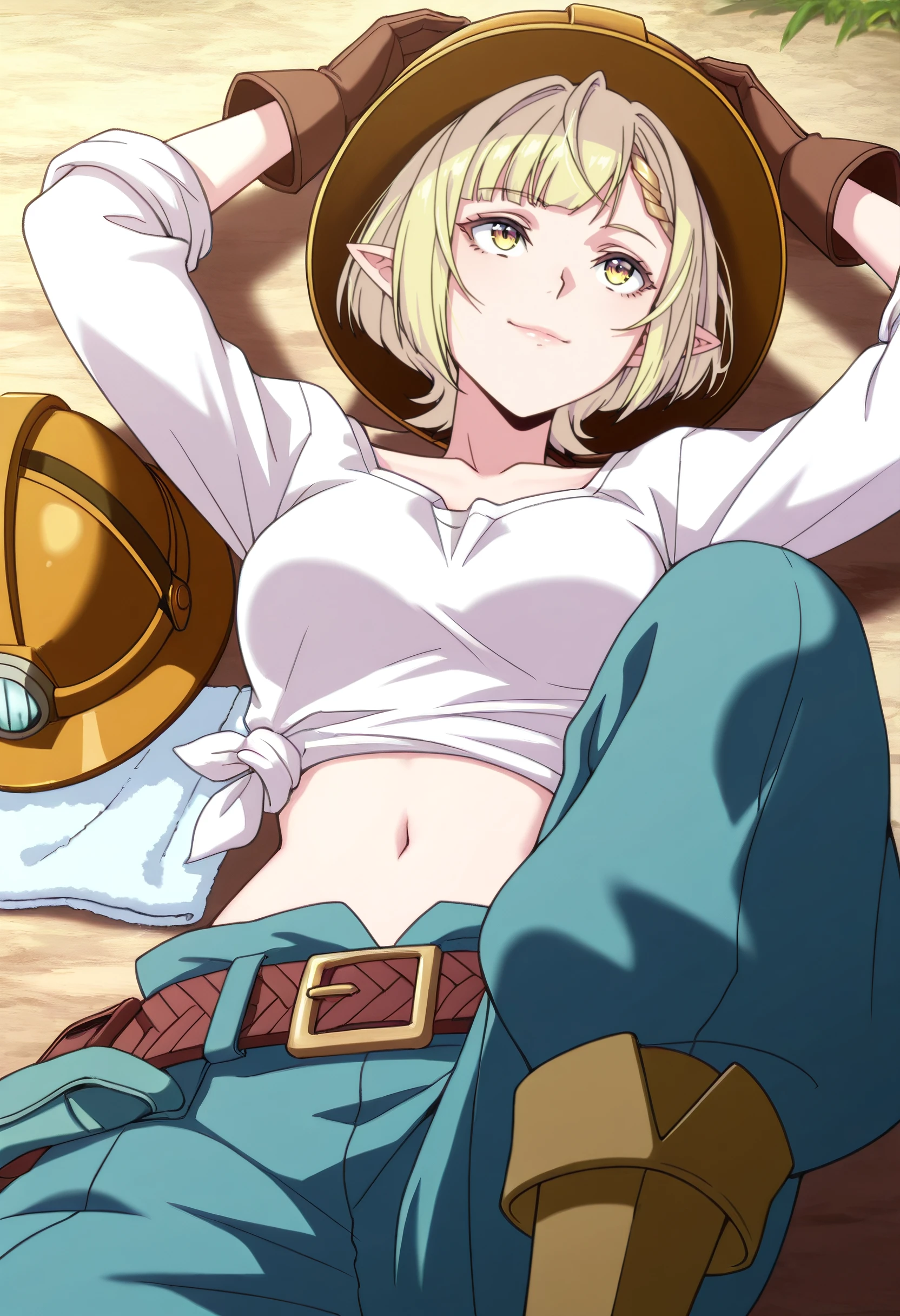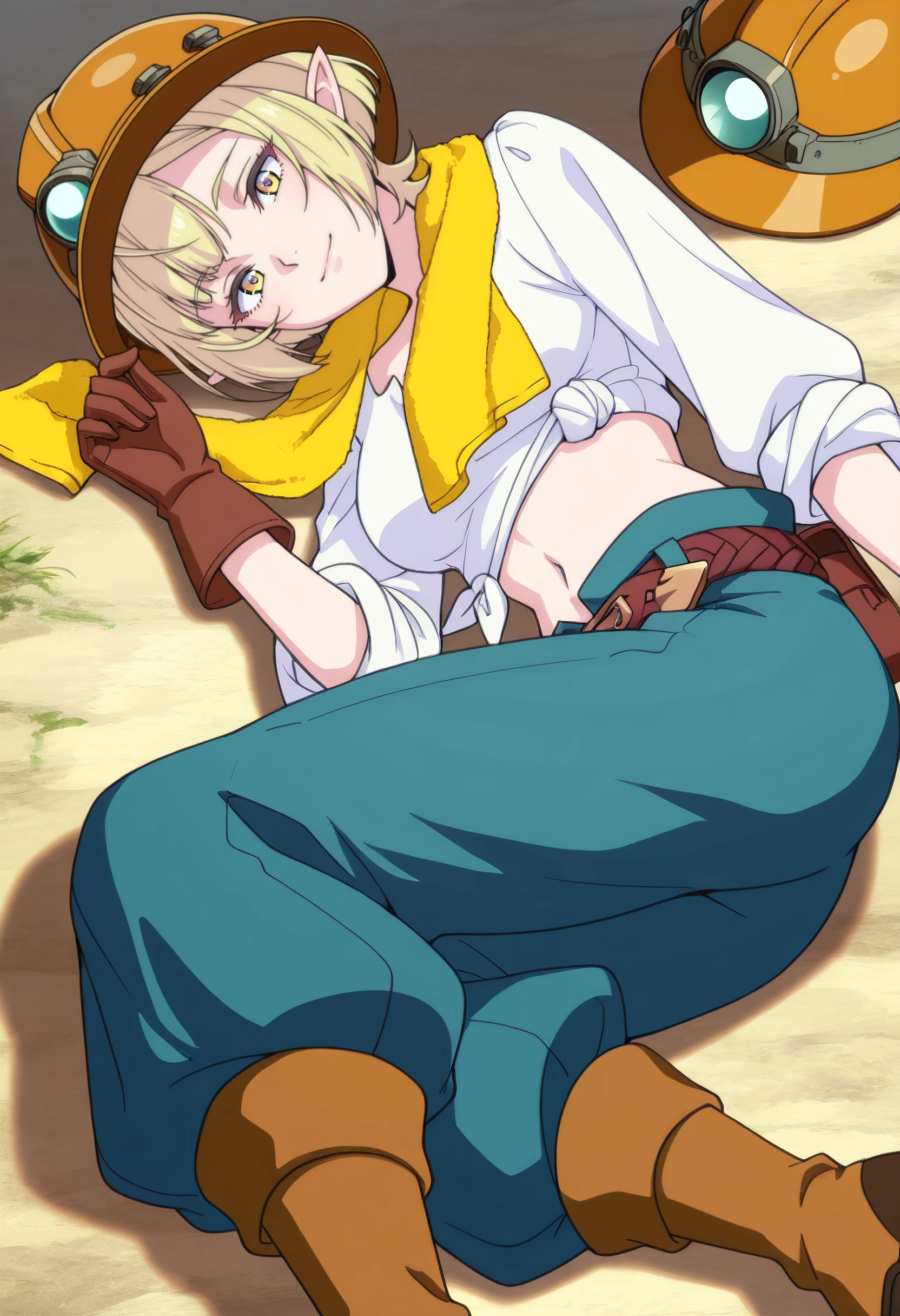 UrzaMiner, helmet, hard hat, hat, shirt, towel around neck, gloves, belt, navel, pith helmet, pants, brown gloves, midriff, blue pants, tied shirt, white shirt, sleeves rolled up, baggy pants, boots, brown footwear, long sleeves, puffy pants, braid, brown belt, brown headwear, brown hat,