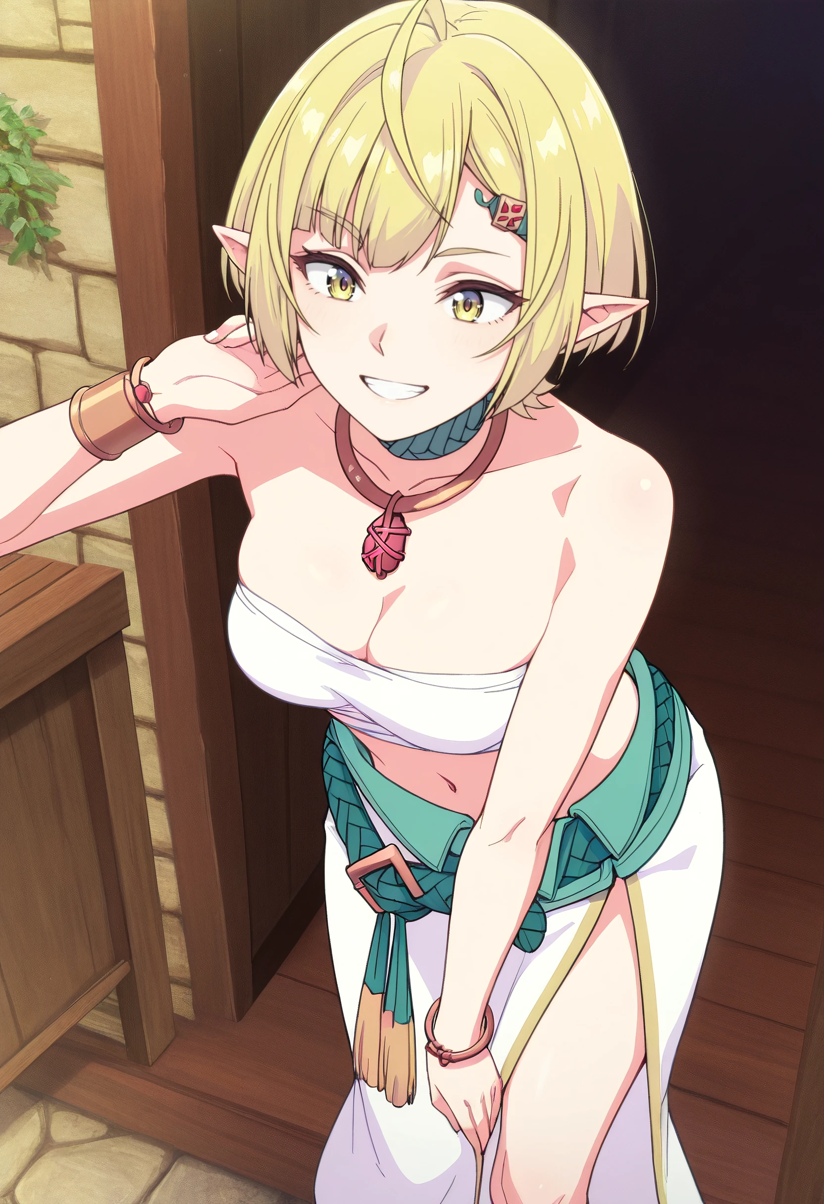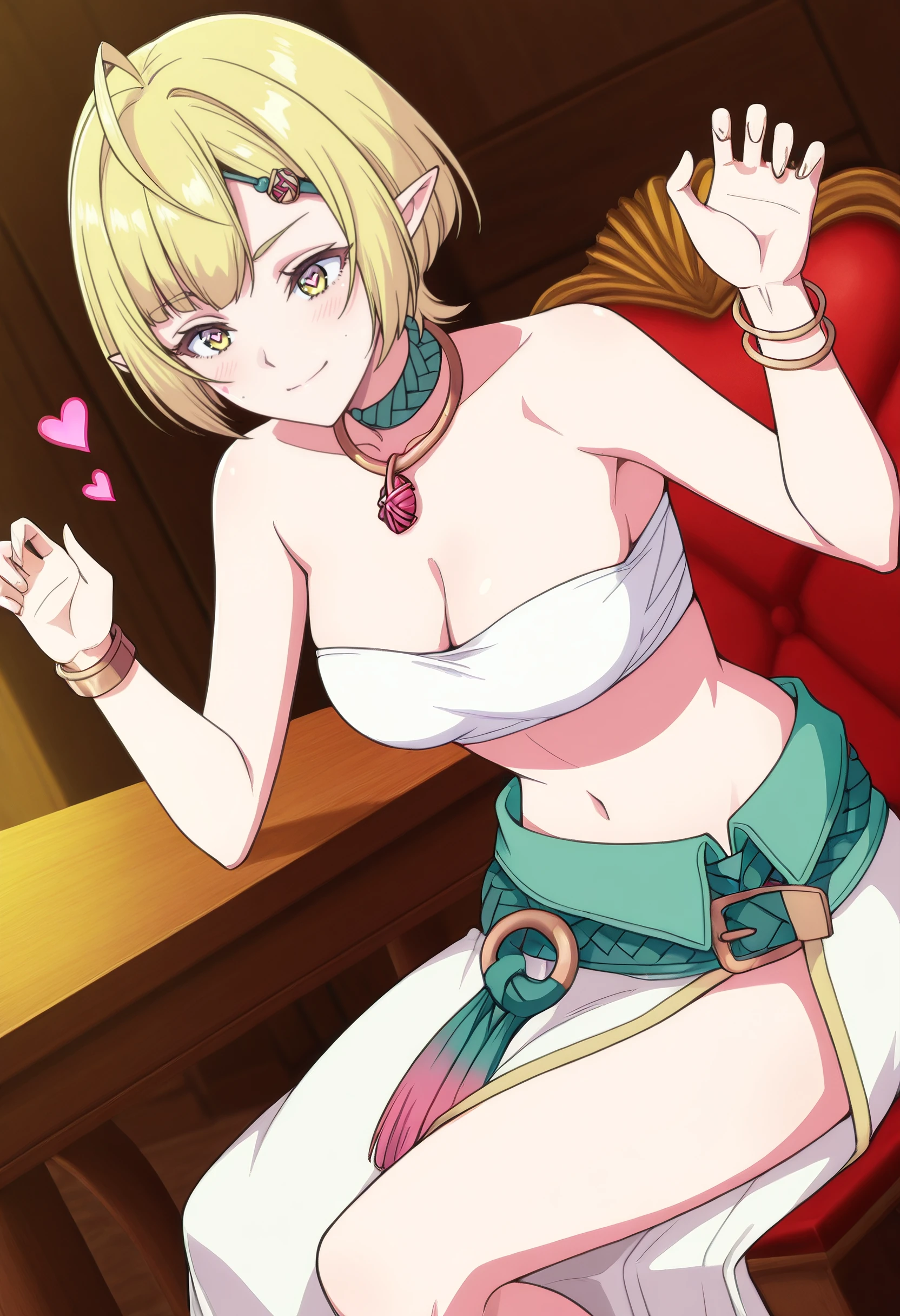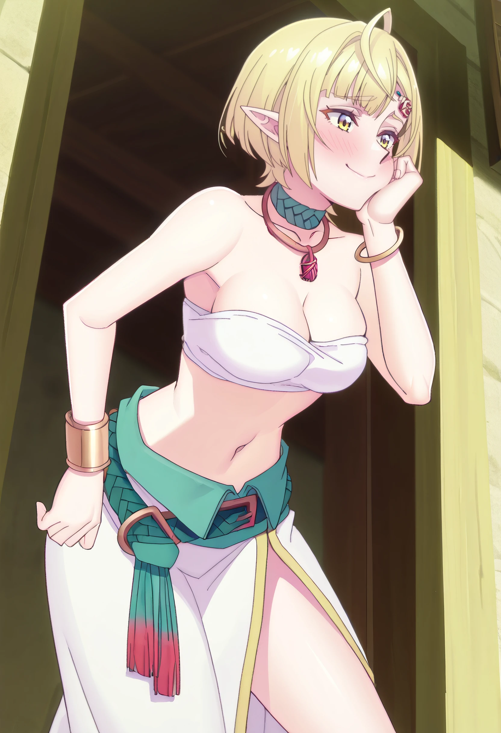 UrzaSkirt, jewelry, bare shoulders, strapless, midriff, bandeau, bracelet, necklace, navel, tube top, skirt, cleavage, ahoge, neck ring, choker, hair ornament, anklet, belt, sarashi, chest sarashi, green belt, green choker, white skirt, hairclip, white bandeau, side slit, collar,