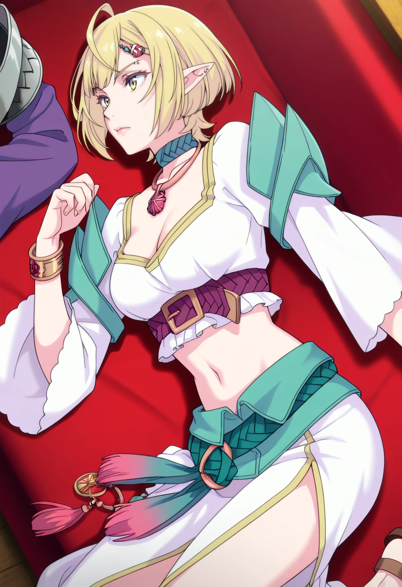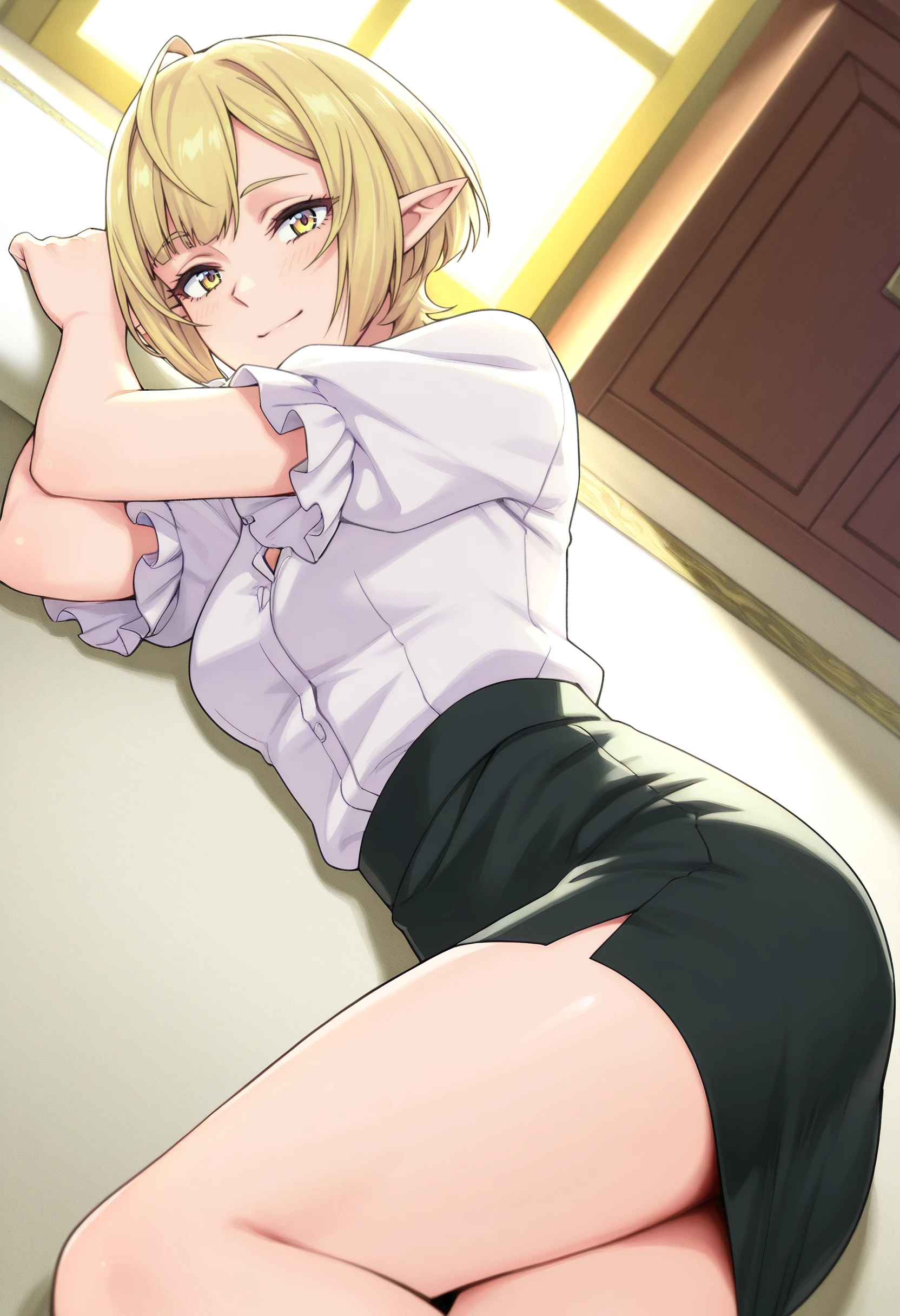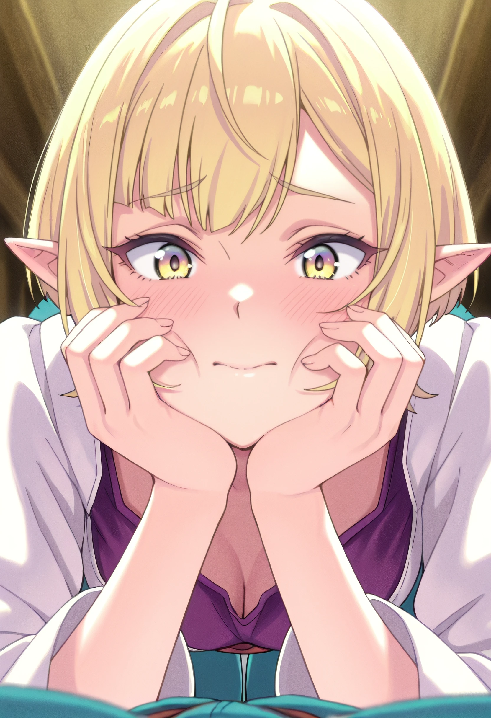 TNSUrza, short hair, pointy ears, blonde hair, yellow eyes, elf,
