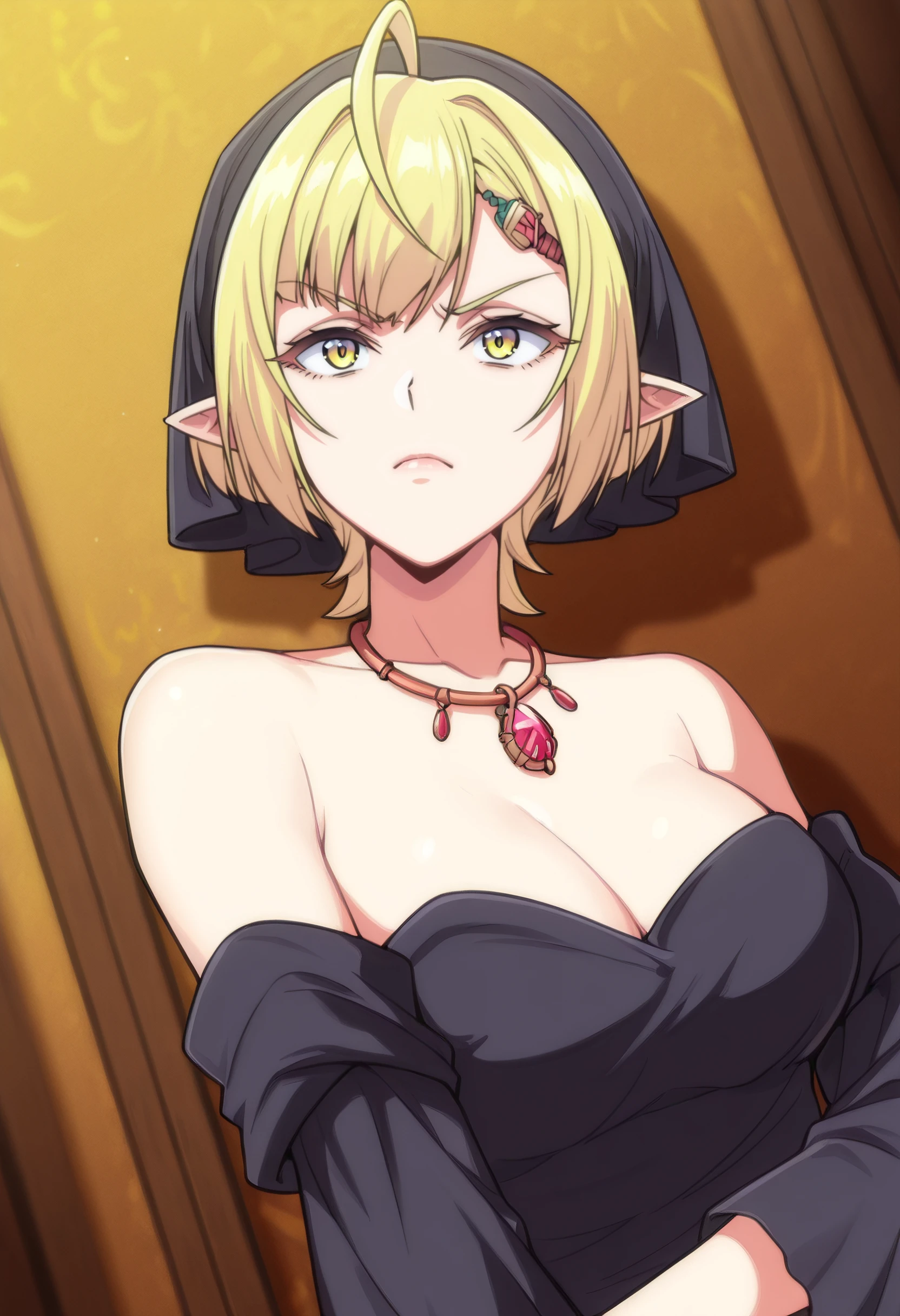 UrzaDress, jewelry, necklace, dress, cleavage, black dress, long sleeves, ahoge, braid, bare shoulders, pendant, strapless, headscarf, off-shoulder dress, gem, strapless dress,