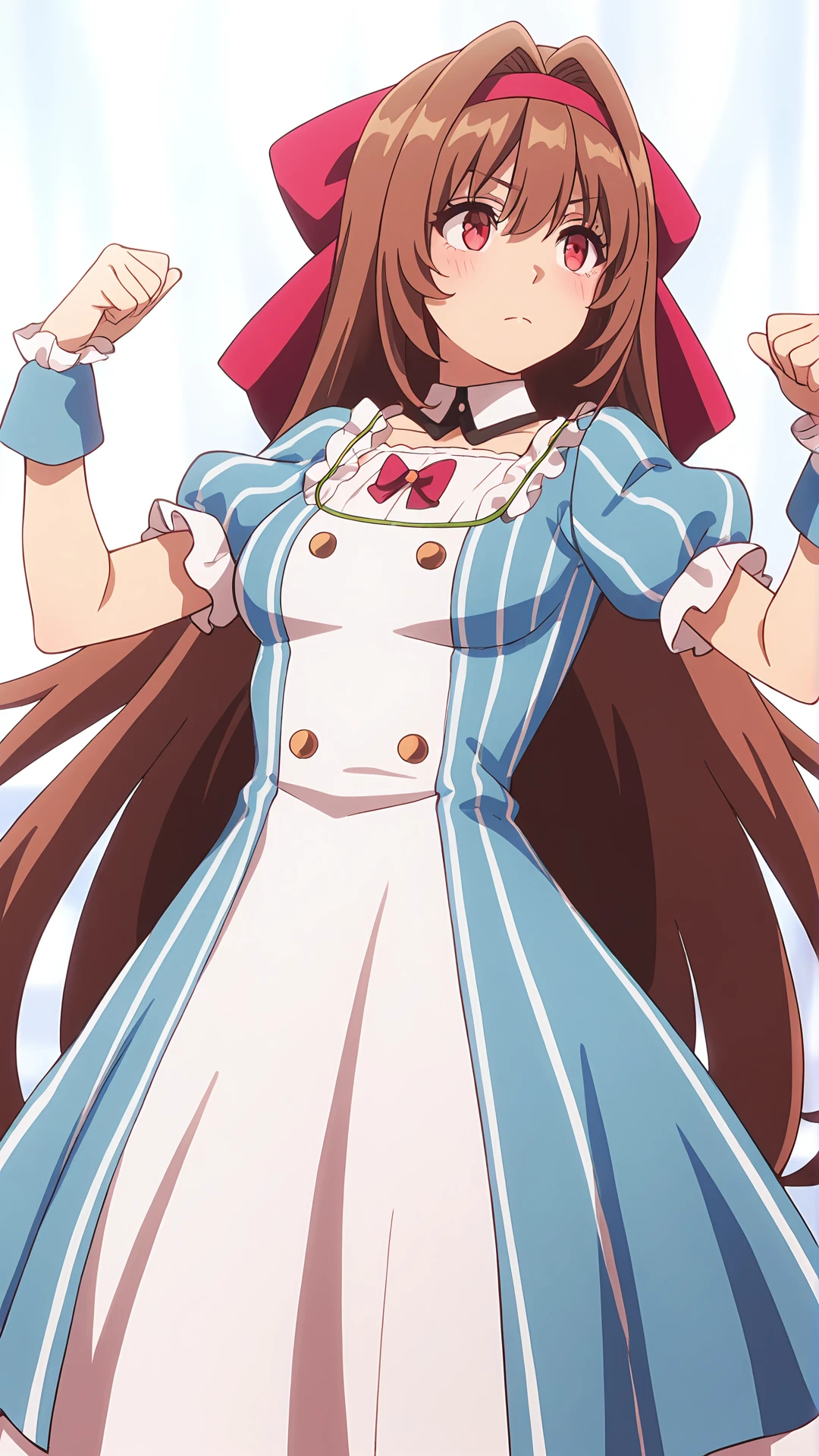 redoKeyaru,1girl,solo,brown hair,very long hair,red eyes,dress,blue dress,short sleeves,puffy sleeves,puffy short sleeves,bow,red bow,hair bow,hairband,wrist cuffs,hair intakes,