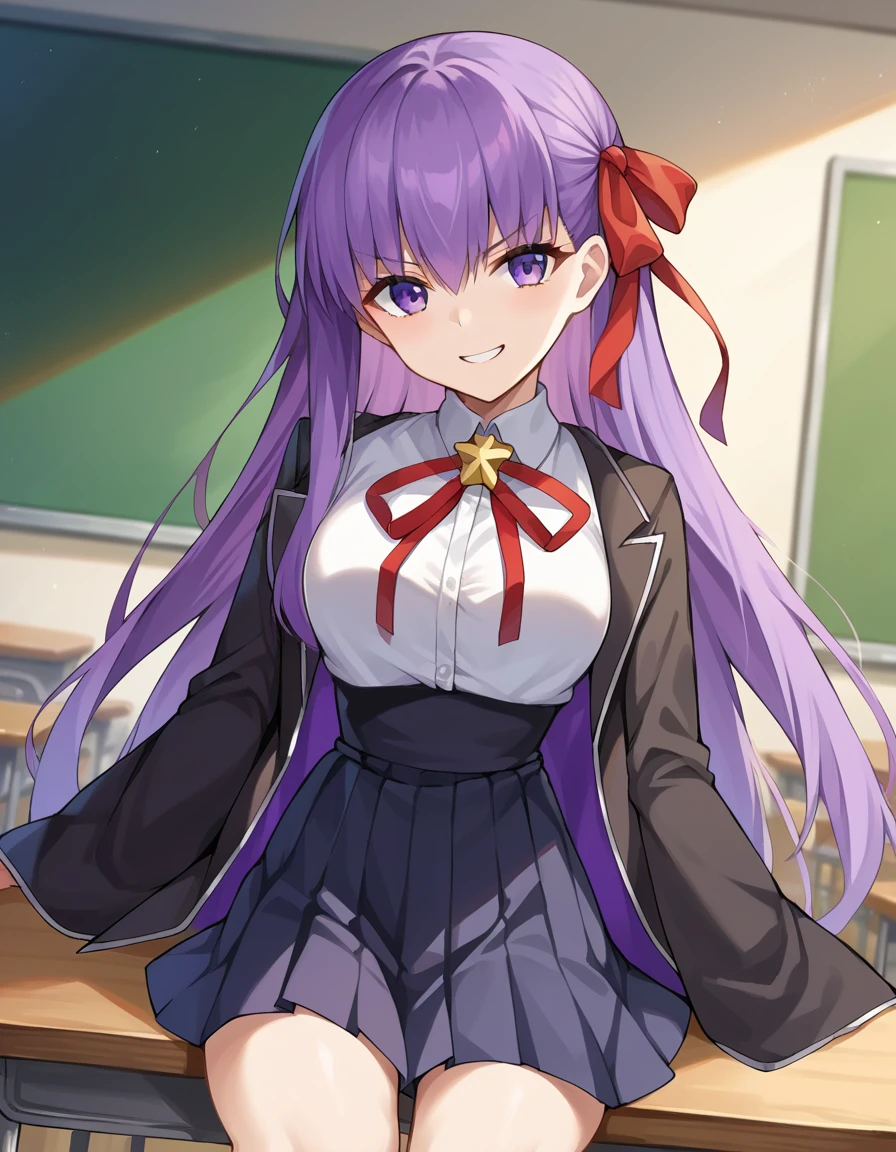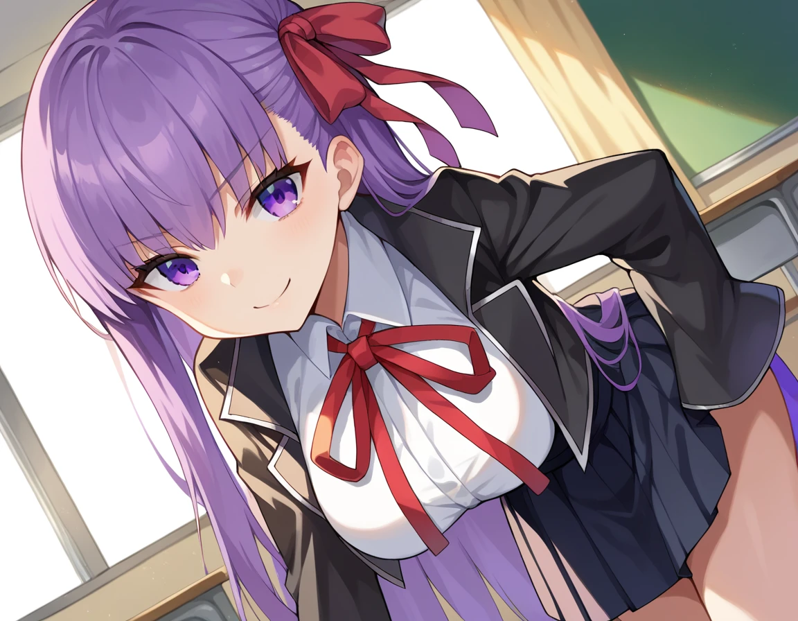 purple eyes, black jacket, black skirt, collared shirt, hair ribbon, high-waist skirt, jacket, long sleeves, neck ribbon, open clothes, open jacket, pleated skirt, red ribbon, ribbon, shirt, skirt, sleeves past wrists, white shirt, wide sleeves,