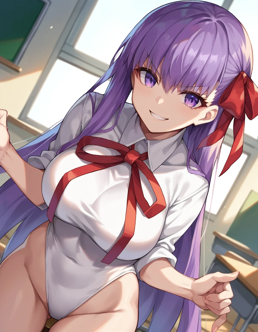 purple eyes, hair ribbon, leotard, neck ribbon, popped collar, red ribbon, ribbon, white leotard,