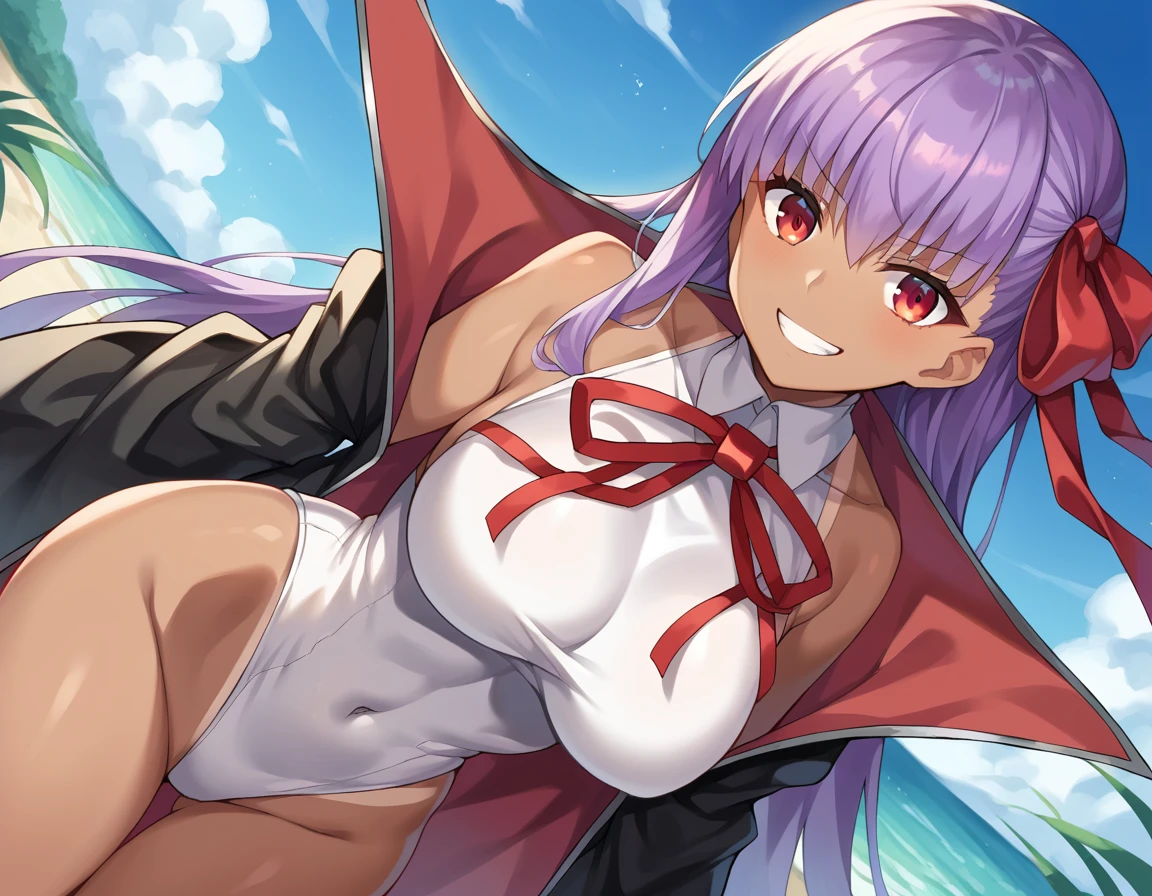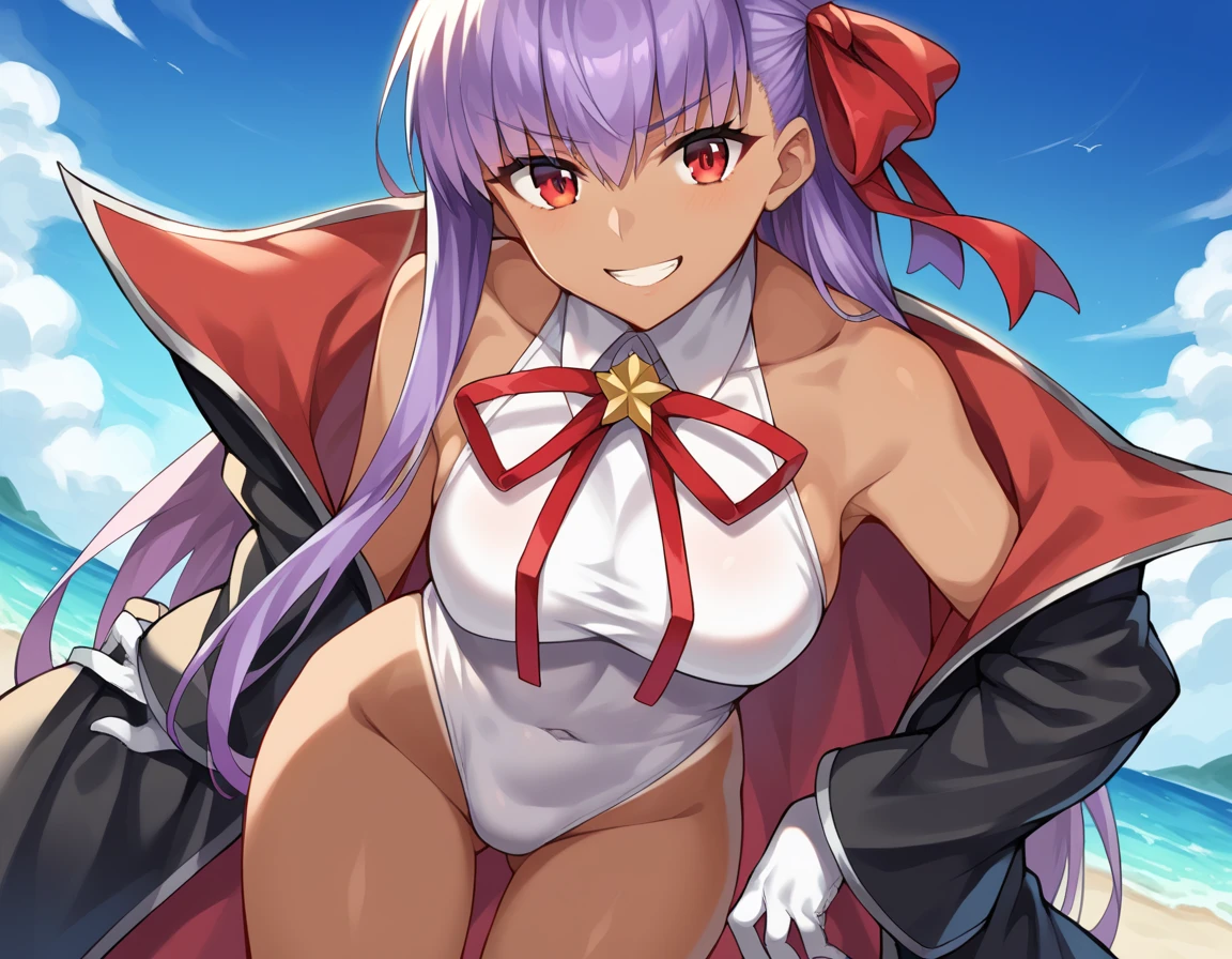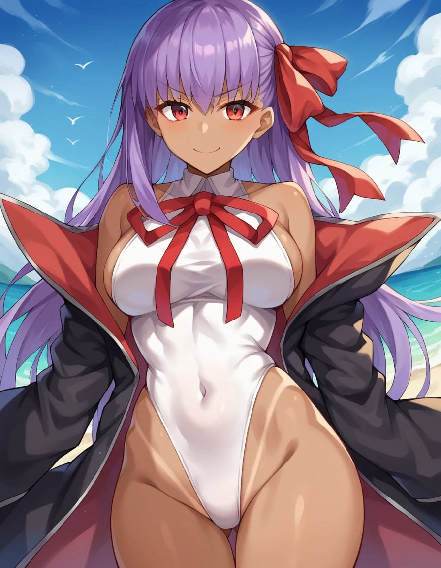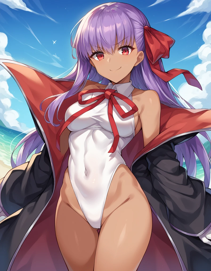 red eyes, bare shoulders, black coat, coat, covered navel, dark skin, dark-skinned female, gloves, hair ribbon, highleg, highleg leotard, leotard, neck ribbon, open clothes, open coat, popped collar, red ribbon, ribbon, tan, white gloves, white leotard,