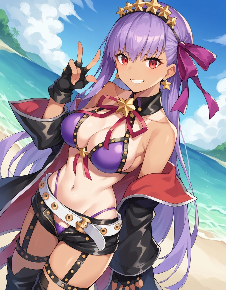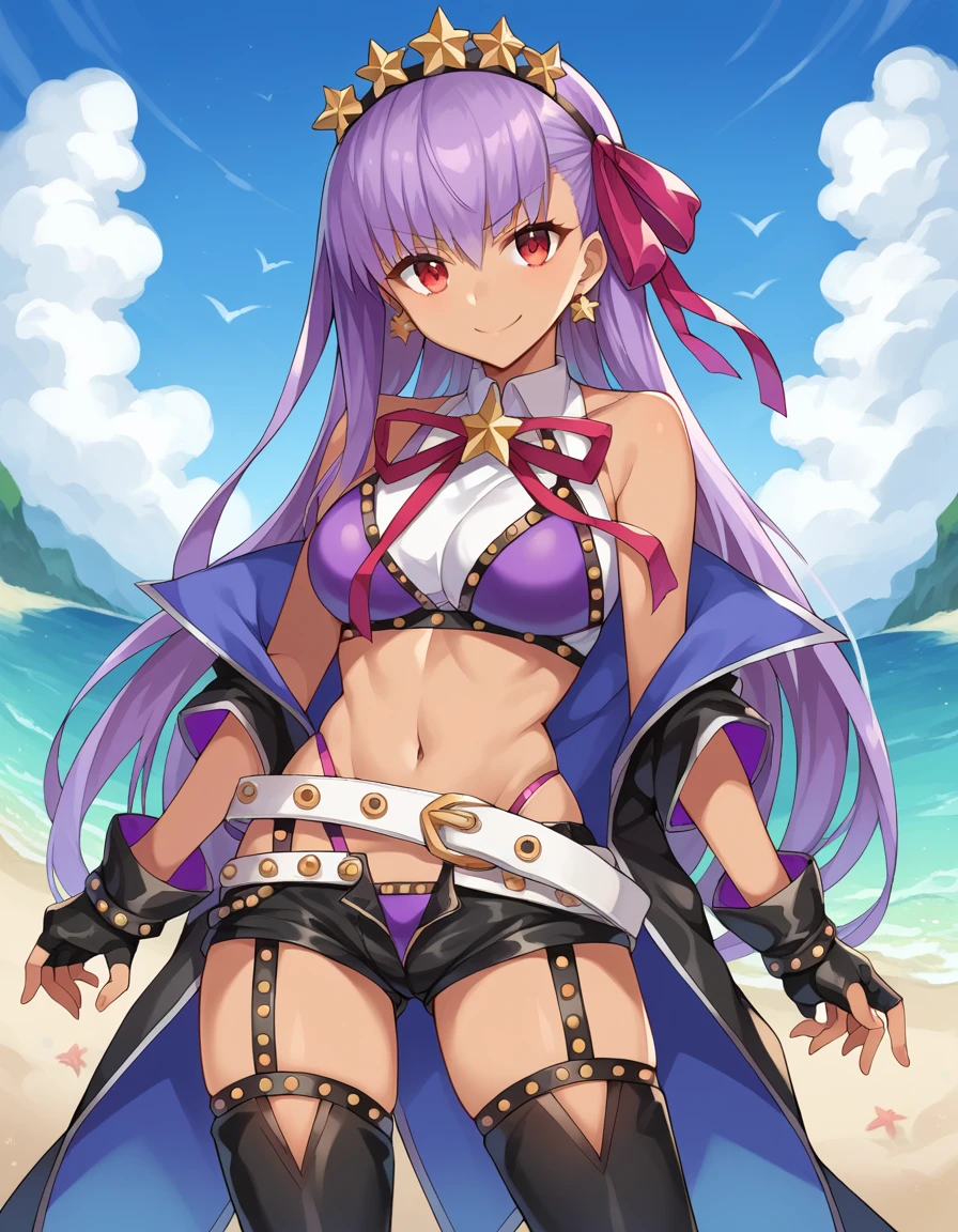 red eyes, bare shoulders, belt, bikini, black garter belt, black gloves, black thighhighs, fingerless gloves, gloves, hair ribbon, hairband, jewelry, micro shorts, navel, neck ribbon, purple bikini, purple ribbon, ribbon, shorts, swimsuit, tan, thighhighs, white belt,
