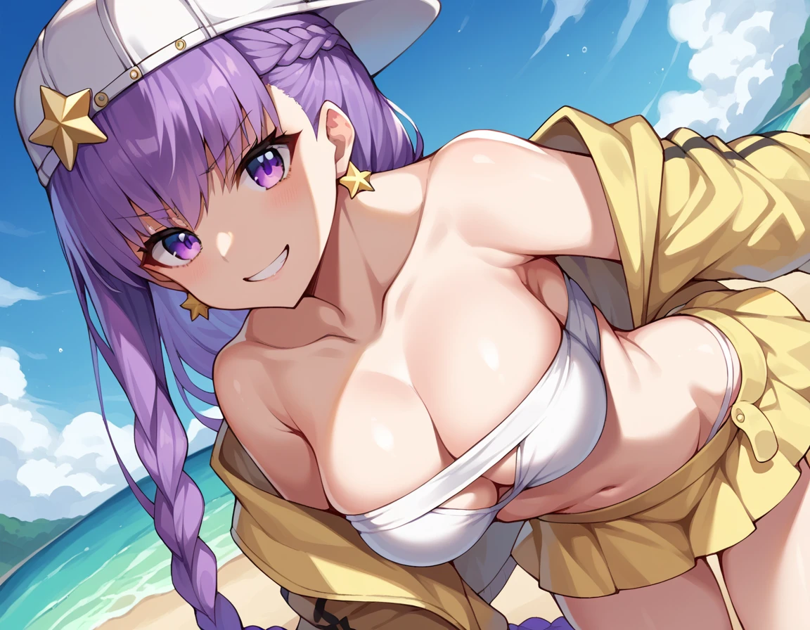 purple eyes, backwards hat, bandeau, bare shoulders, baseball cap, braid, collarbone, hat, hat ornament, jacket, navel, off shoulder, single braid, star \(symbol\), star hat ornament, white headwear, yellow jacket, yellow skirt, bikini, white bikini,
