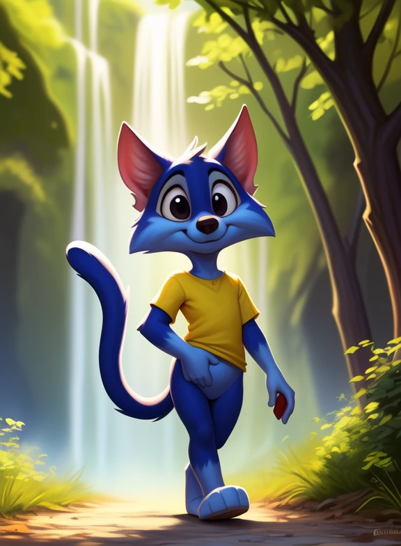 FurrballCatLonTun, cat, black nose, white sclera, blue fur, light blue belly, bandages on tail, yellow shirt, chibi,