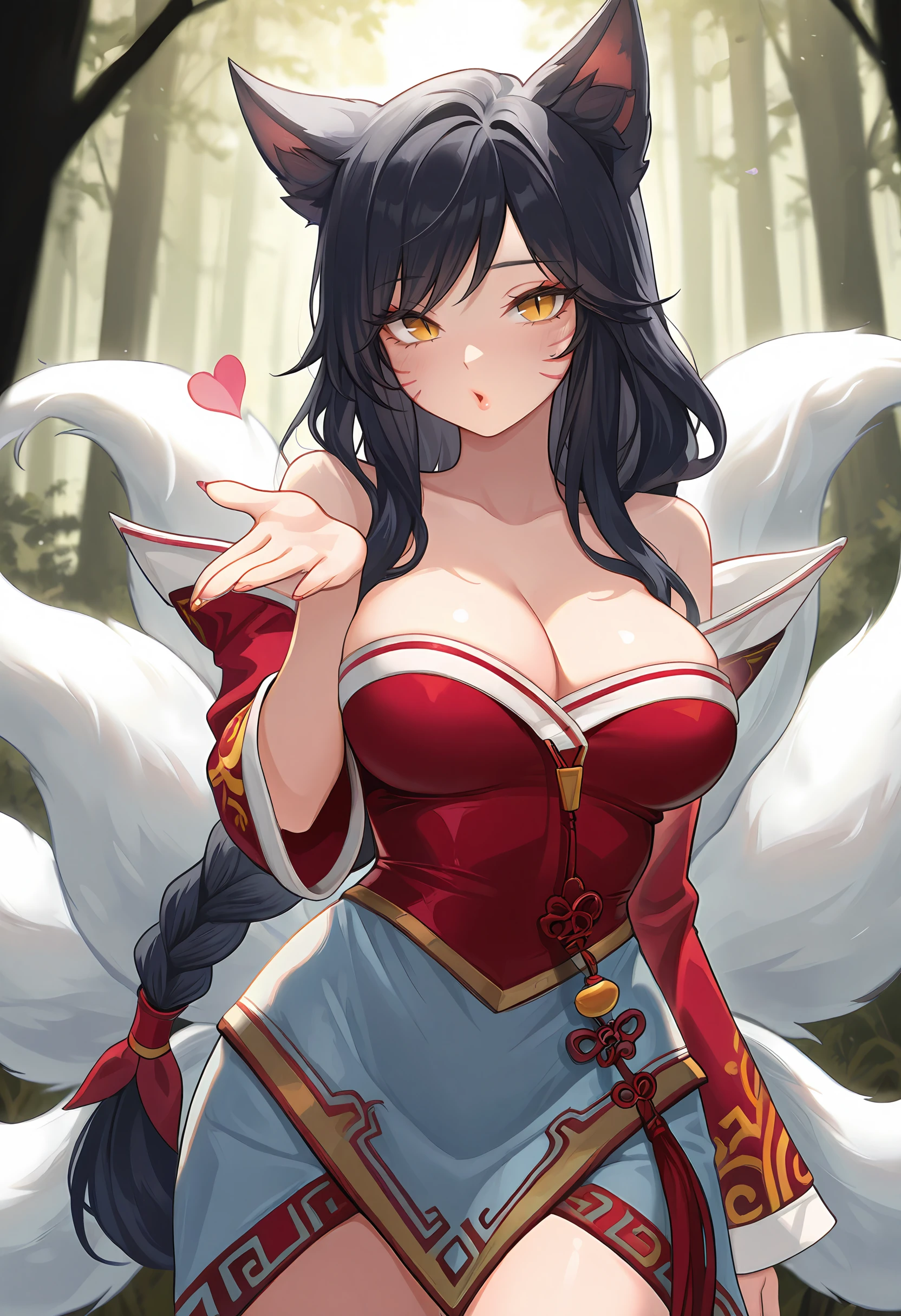 ahriil, ahri (league of legends), black hair, fox ears, whisker markings, bare shoulders, detached sleeves, korean clothes, slit pupils, braid,