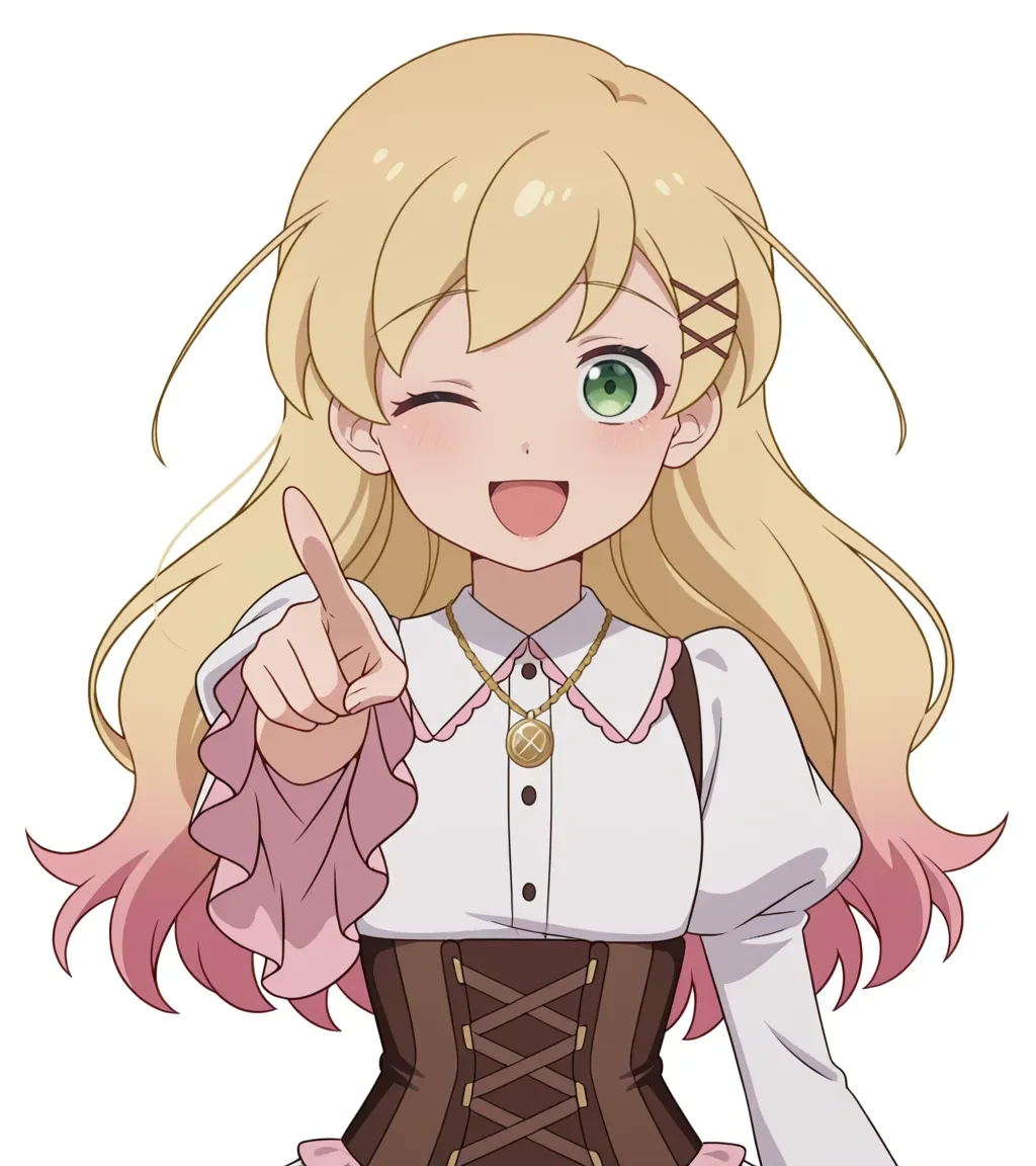 gold necklace,white shirt,collared shirt,frills,juliet sleeves,wide sleeves,brown corset,pink skirt,frilled skirt,brown pantyhose,brown footwear,Description