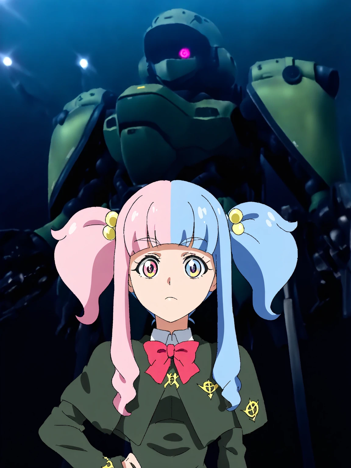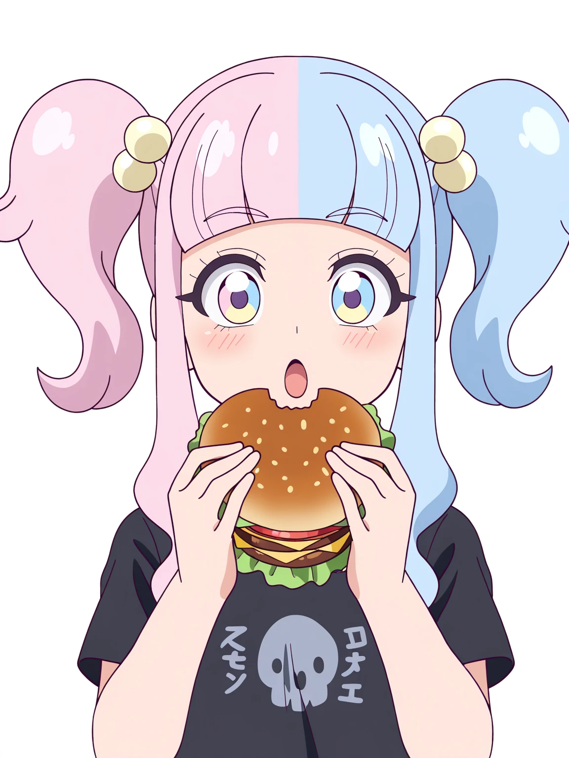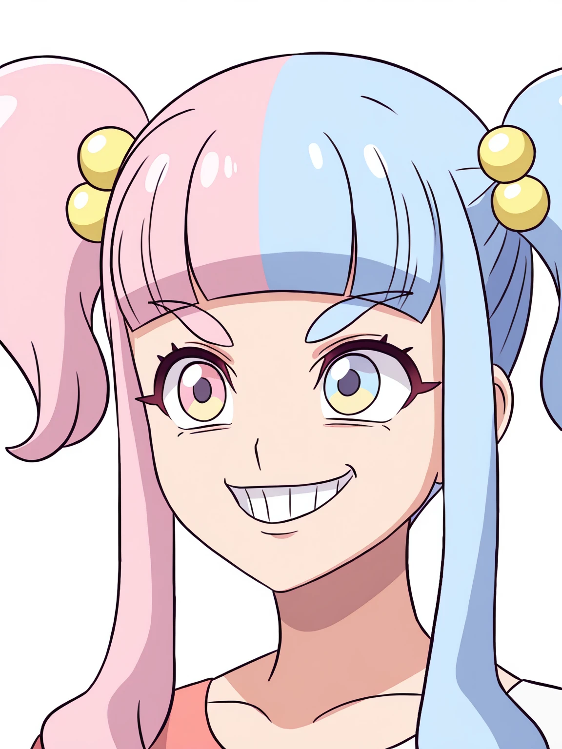 chaimu,twintails,long hair,sidelocks,hair ornament,blunt bangs,bangs, (multicolored hair),pink hair,blue hair, bow,hair bobbles,(multicolored eyes,pink eyes,blue eyes;1.2),