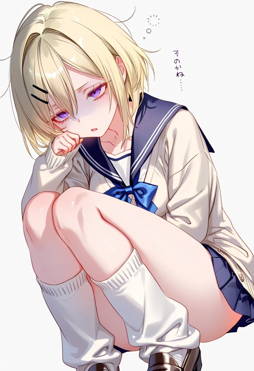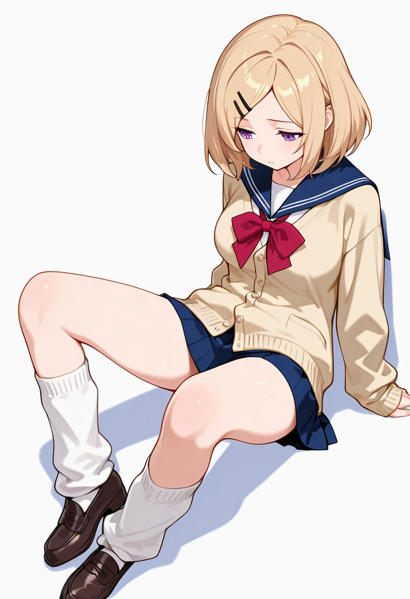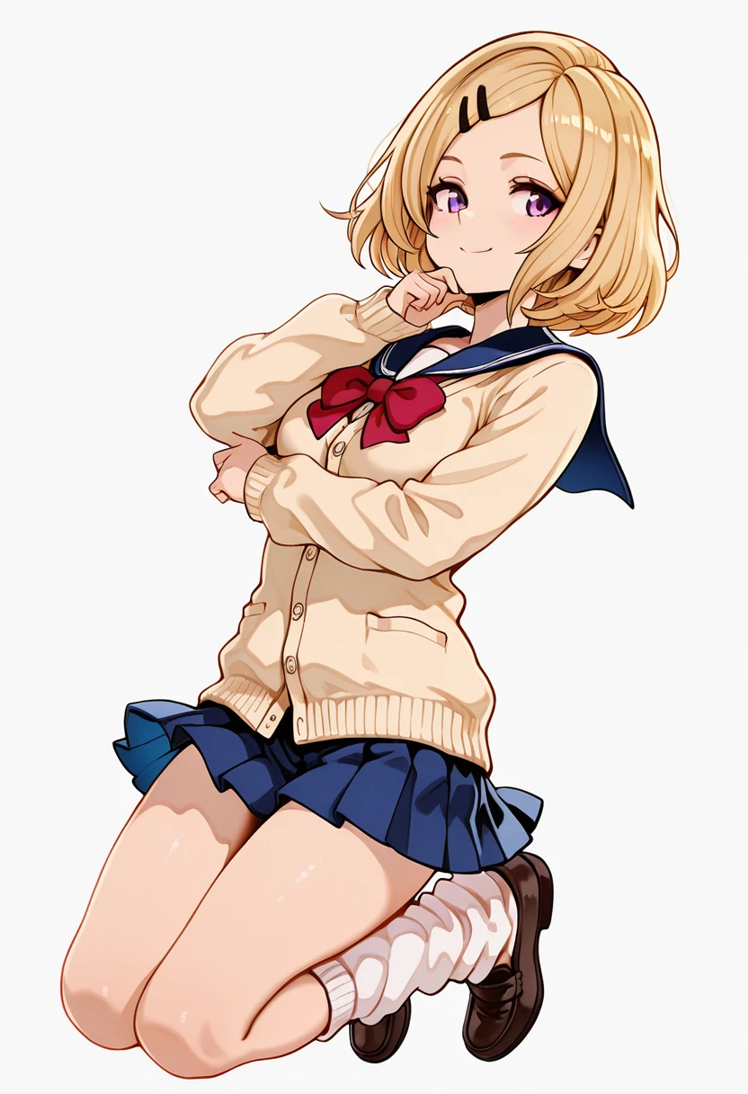 sayuki_cnr, 1girl, purple eyes,blonde hair, short hair,hairclip,👗Default Outfit