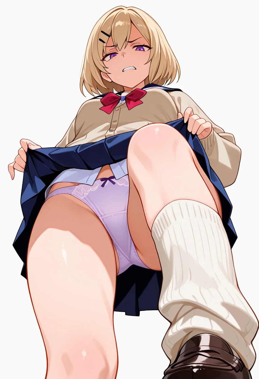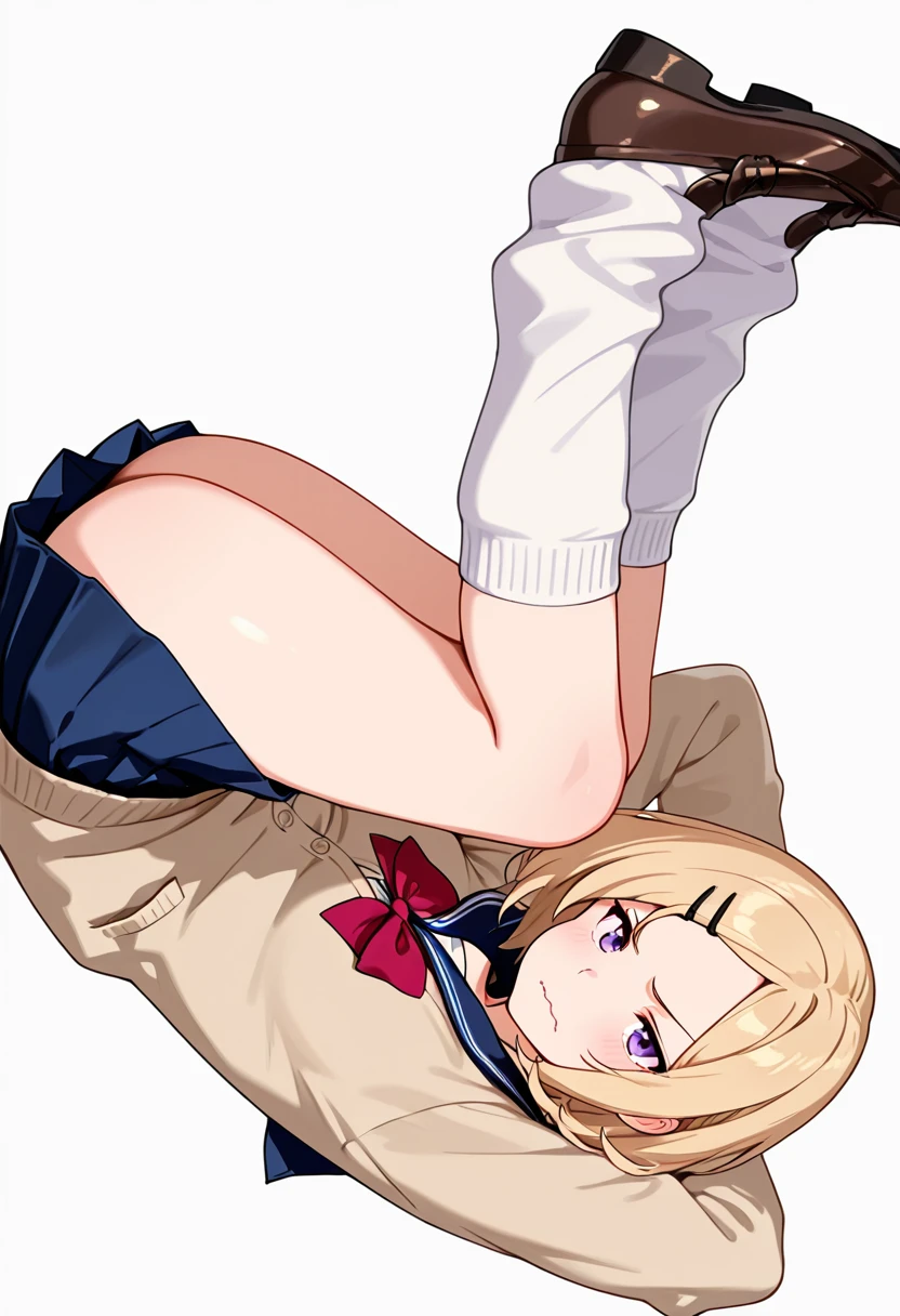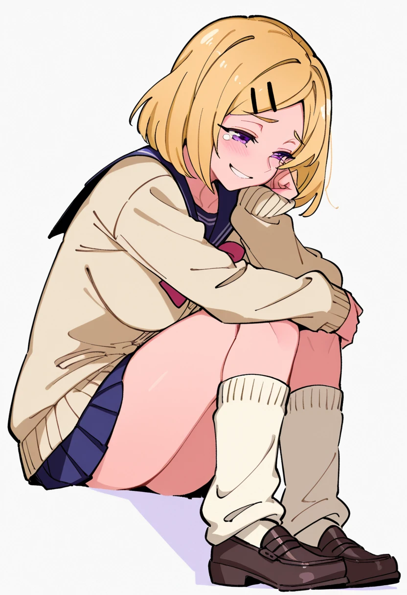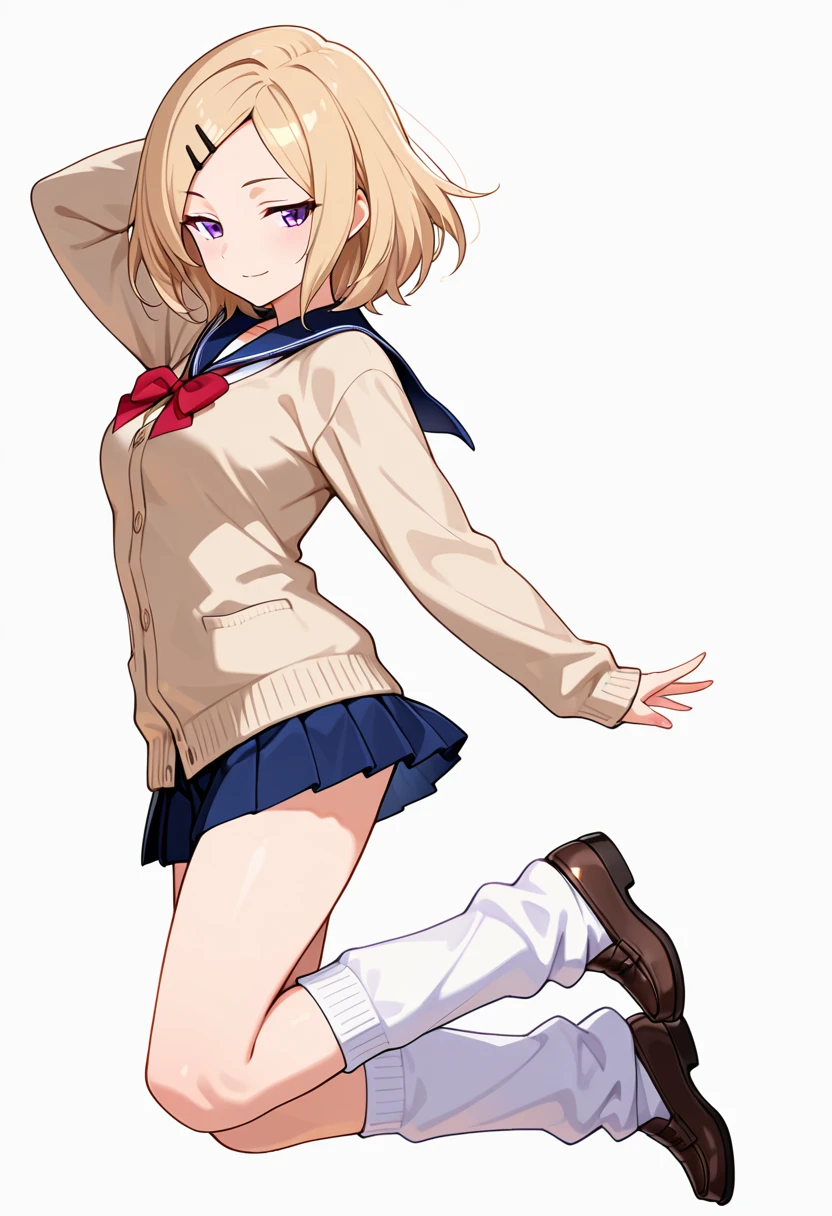 sayuki_cnr, 1girl, purple eyes,blonde hair, short hair,hairclip,👗Default Outfit