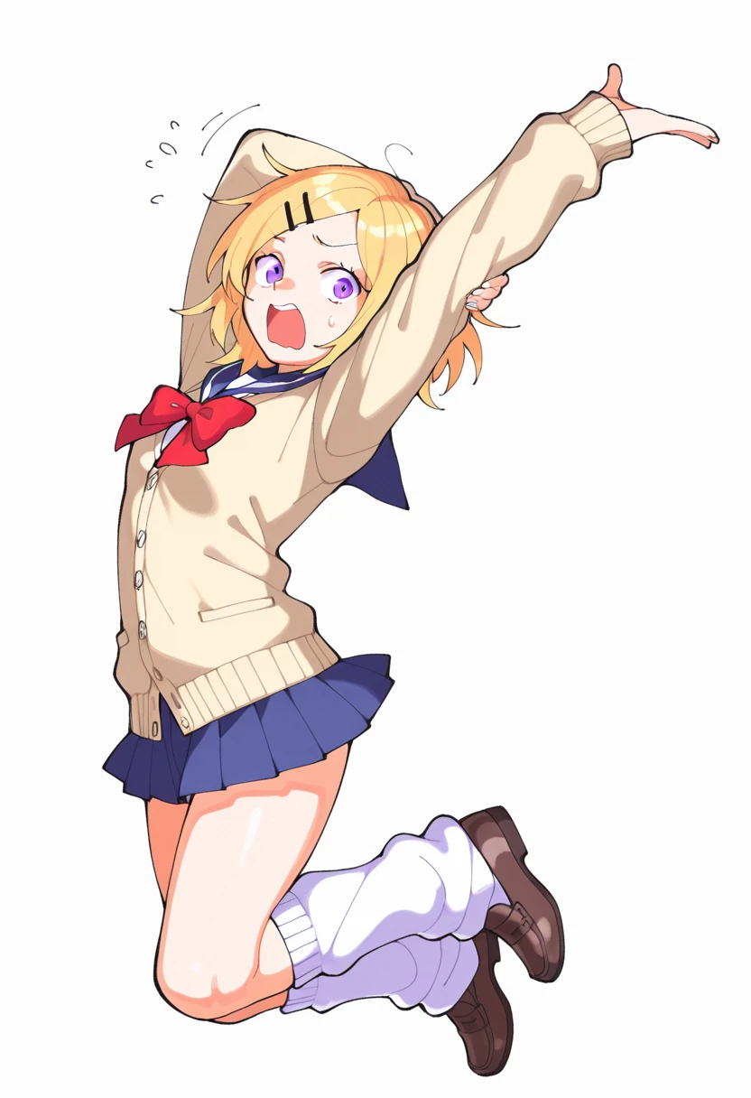 serafuku, cardigan, long sleeves, blue pleated skirt, miniskirt,bowtie,leg warmers,loose socks,loafers,Explanation and notes below👇