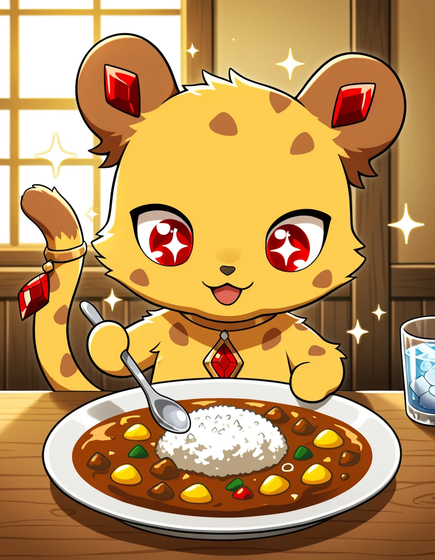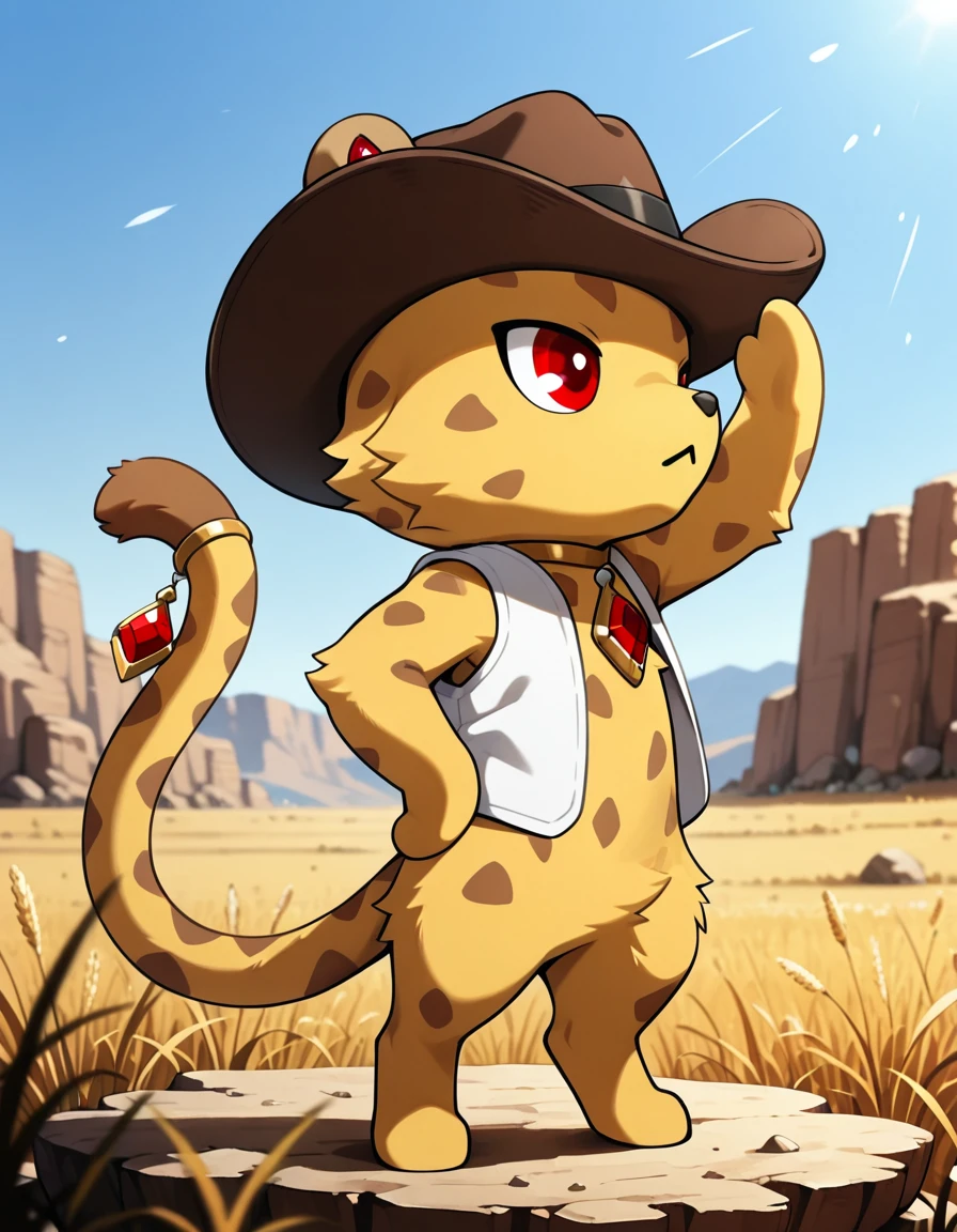 chibi, feral, furry, digitigrade, male, claws, brown ears, red diamond in inner ears, brown patterned yellow fur, gold choker with red gem brooch, tail ornament, no eyebrows, red eyes