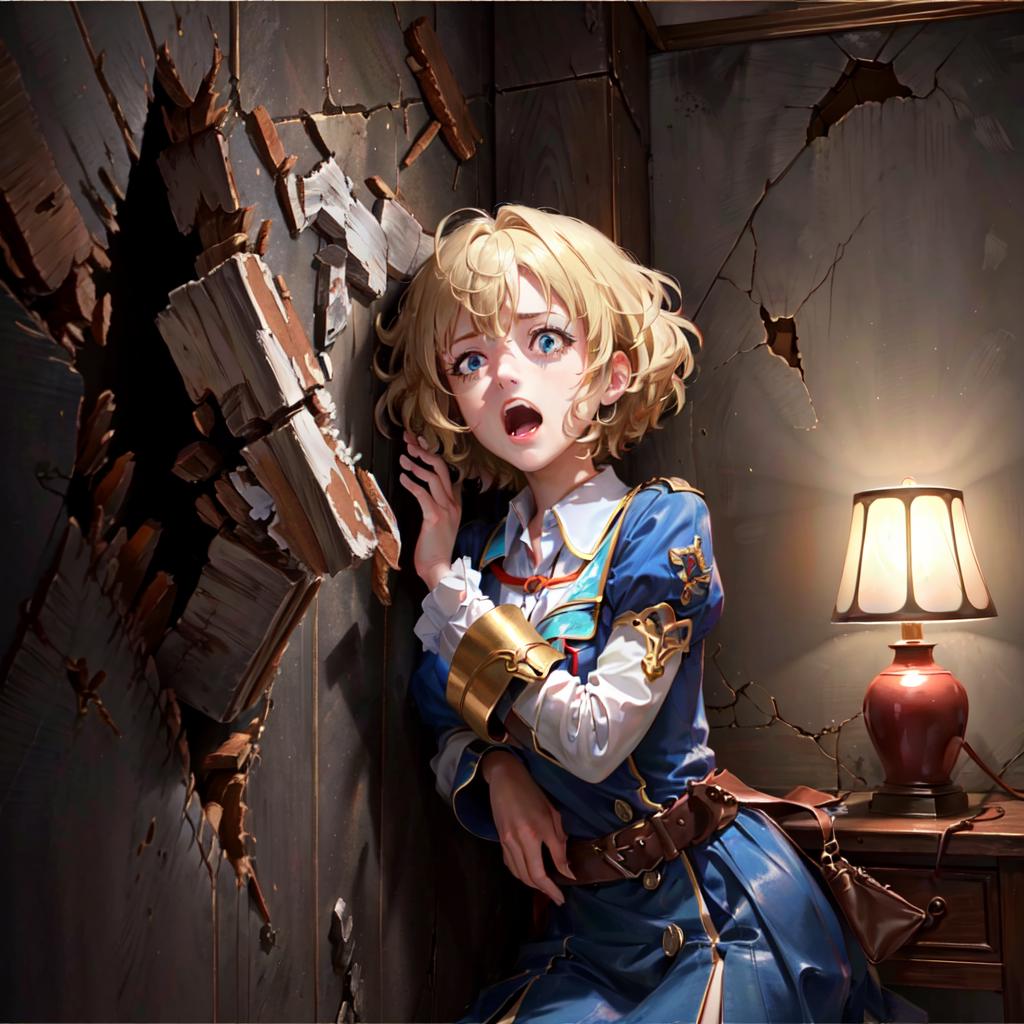 2) JohnnysVictim, broken wall, against wall, screaming, crying, tears, axe