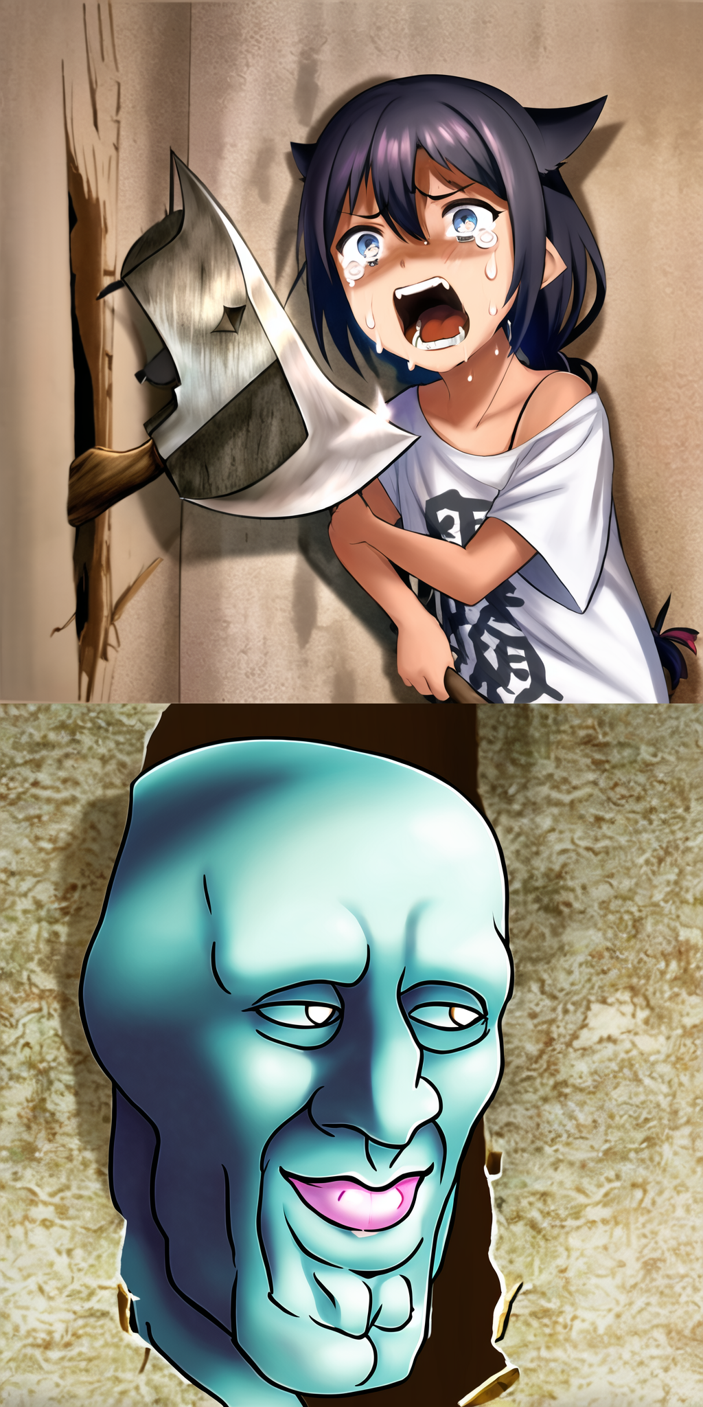 JohnnysVictim, broken wall, against wall, screaming, crying, tears, axe